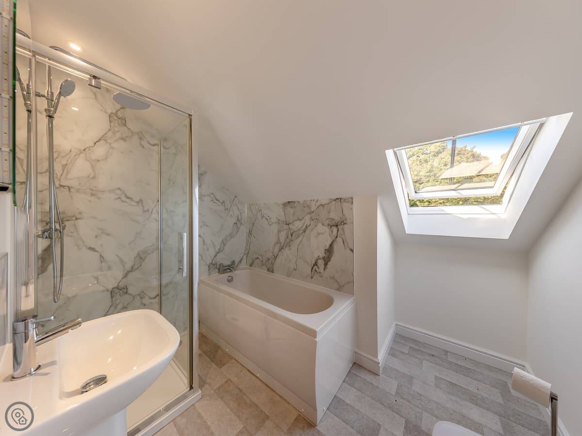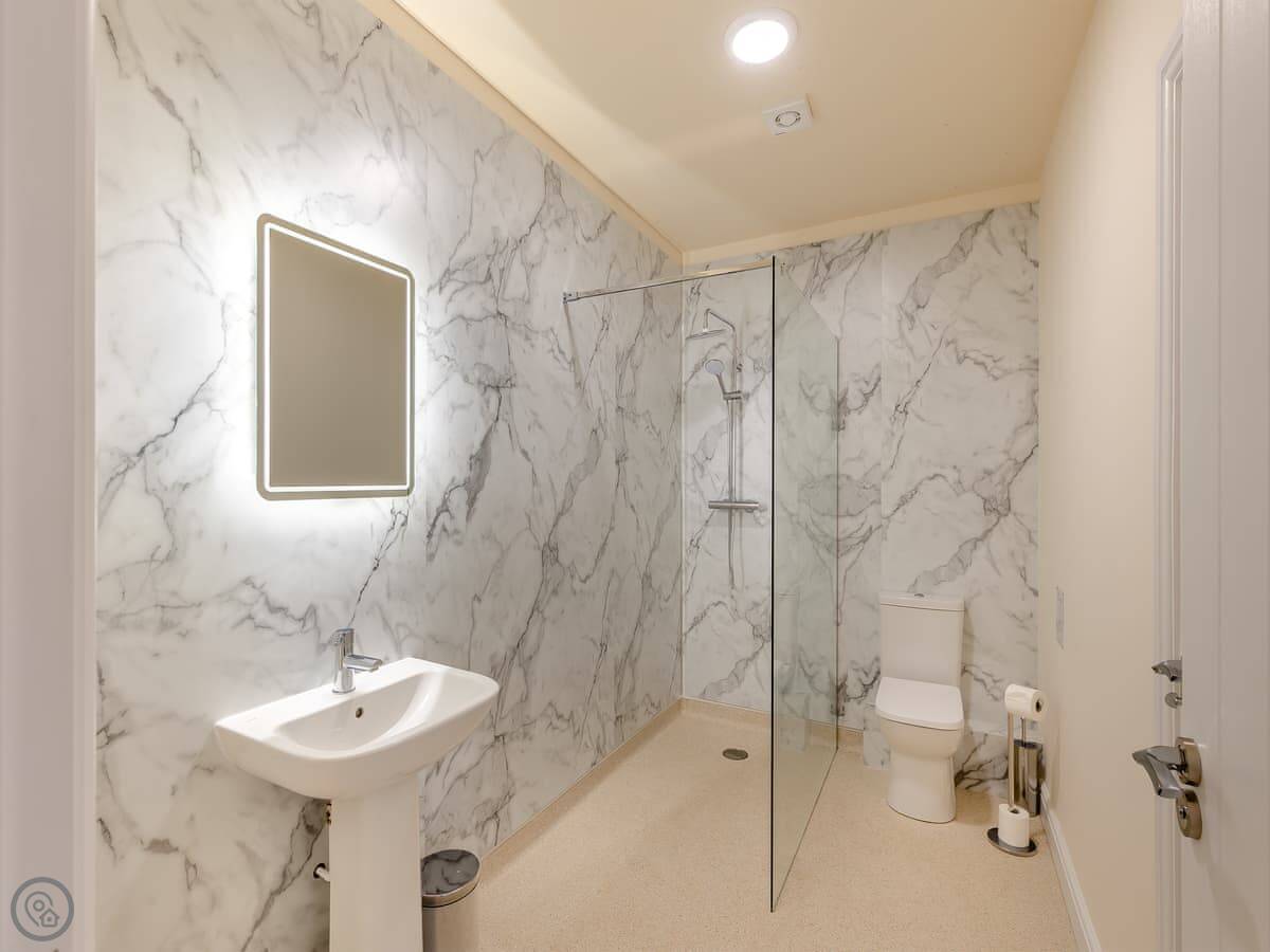 The place sleeps eight. There are four bedrooms and three bathrooms. It's got a 5 Star rating, which covers the finish and the facilities. It's a new conversion, so everything works properly. The heating is underfloor.