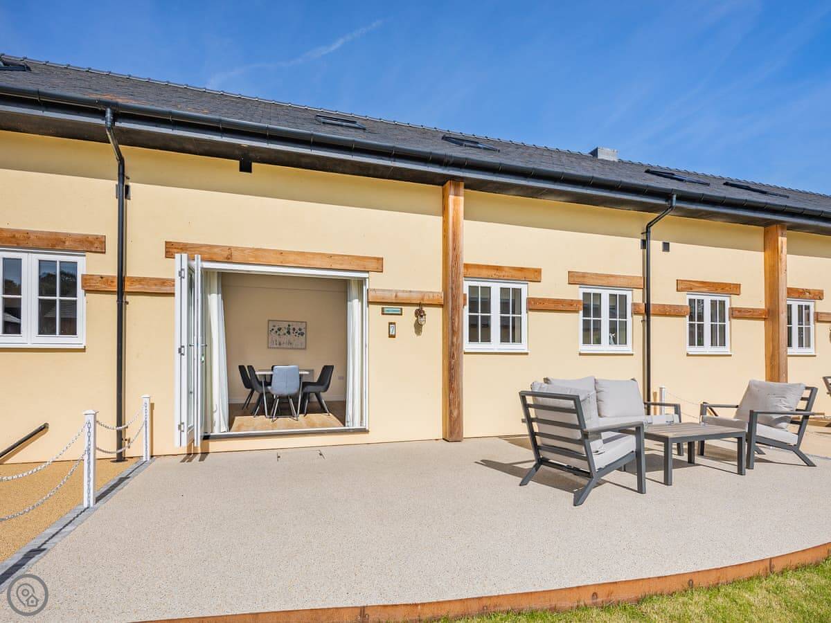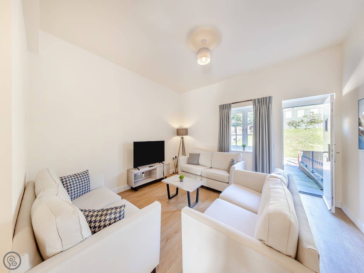 The living area is open plan with the kitchen. There are bifold doors that open onto your own patio. It has underfloor heating. It's a 5 Star place, so it's well finished and everything works.
