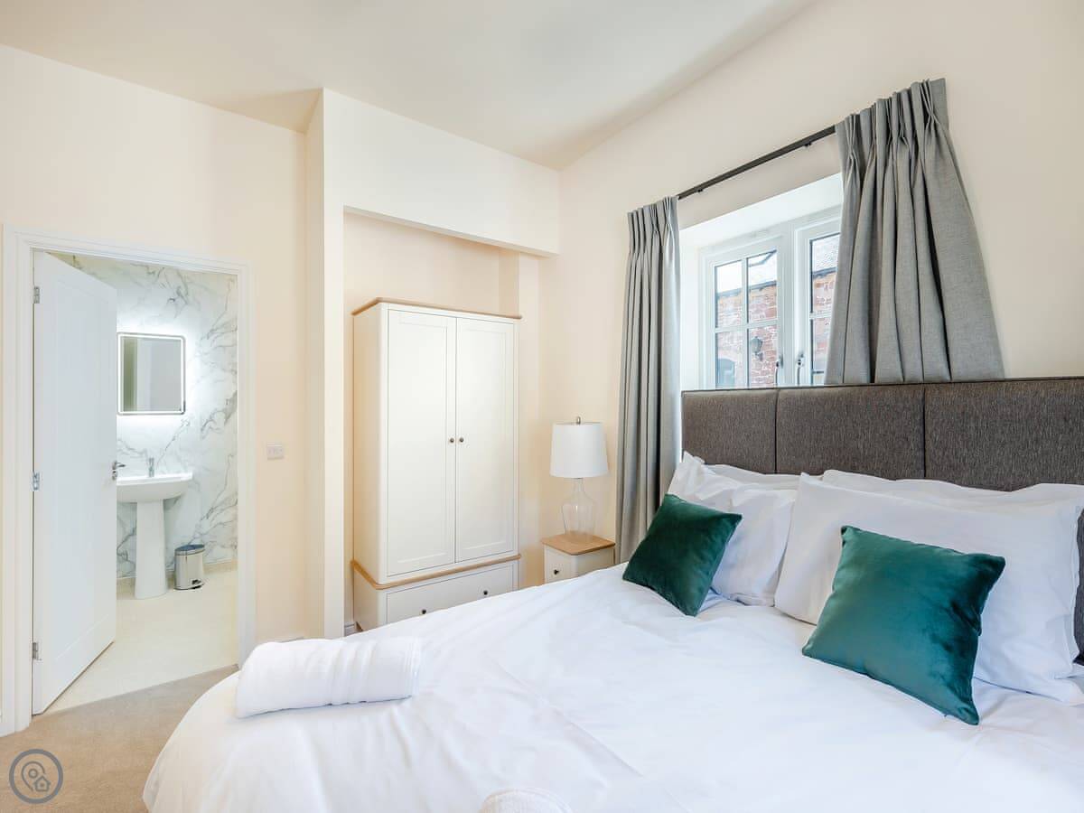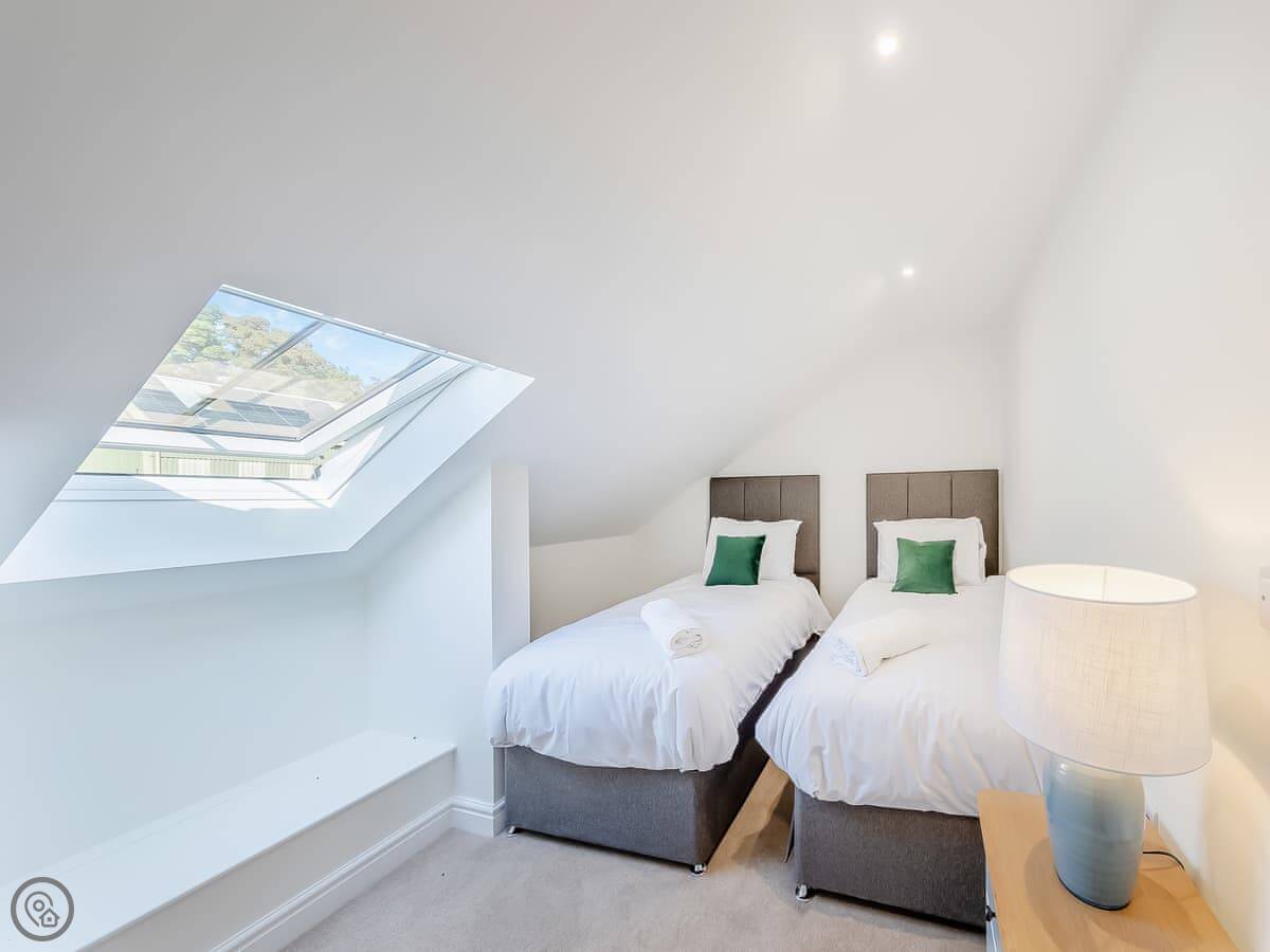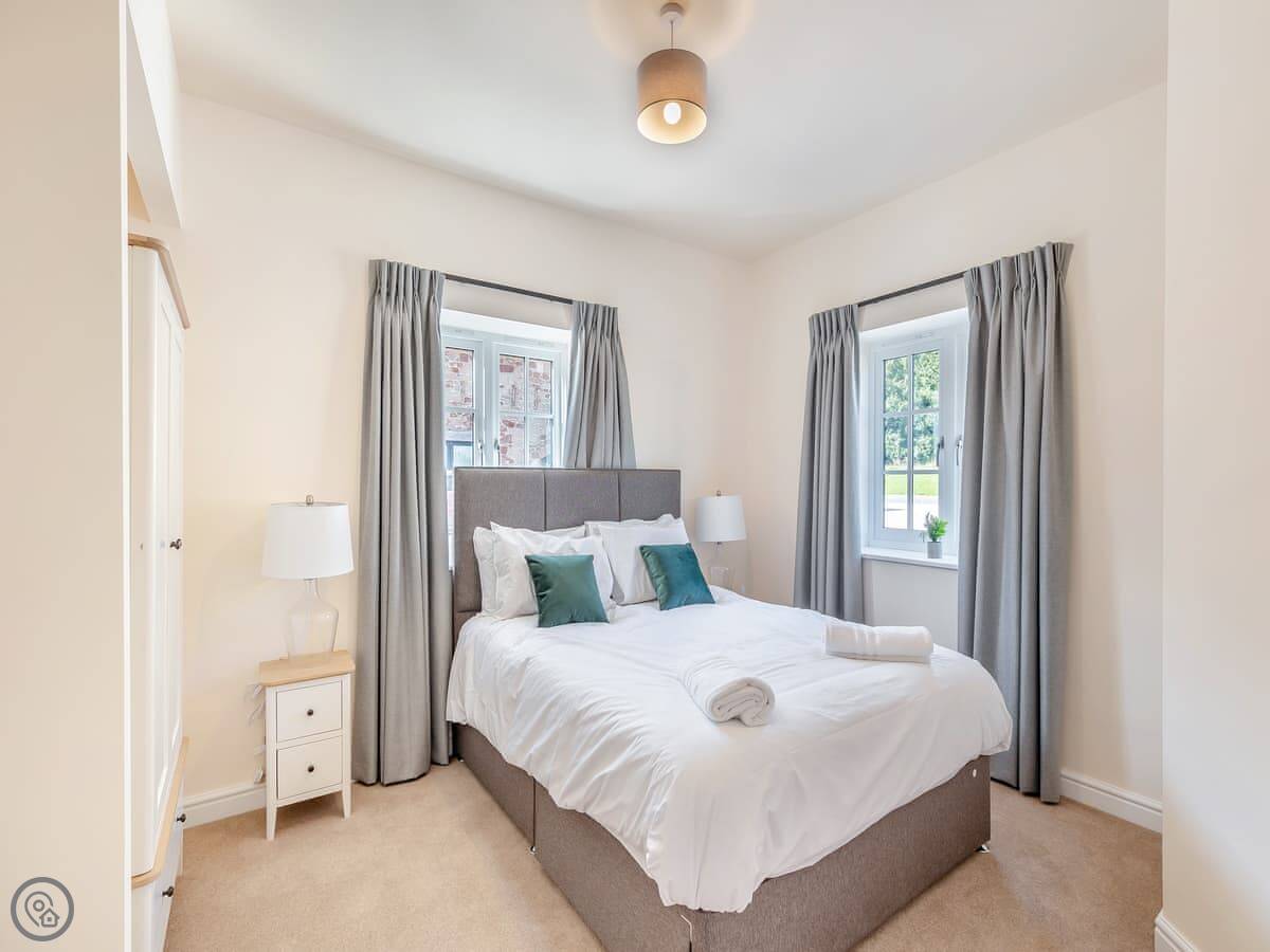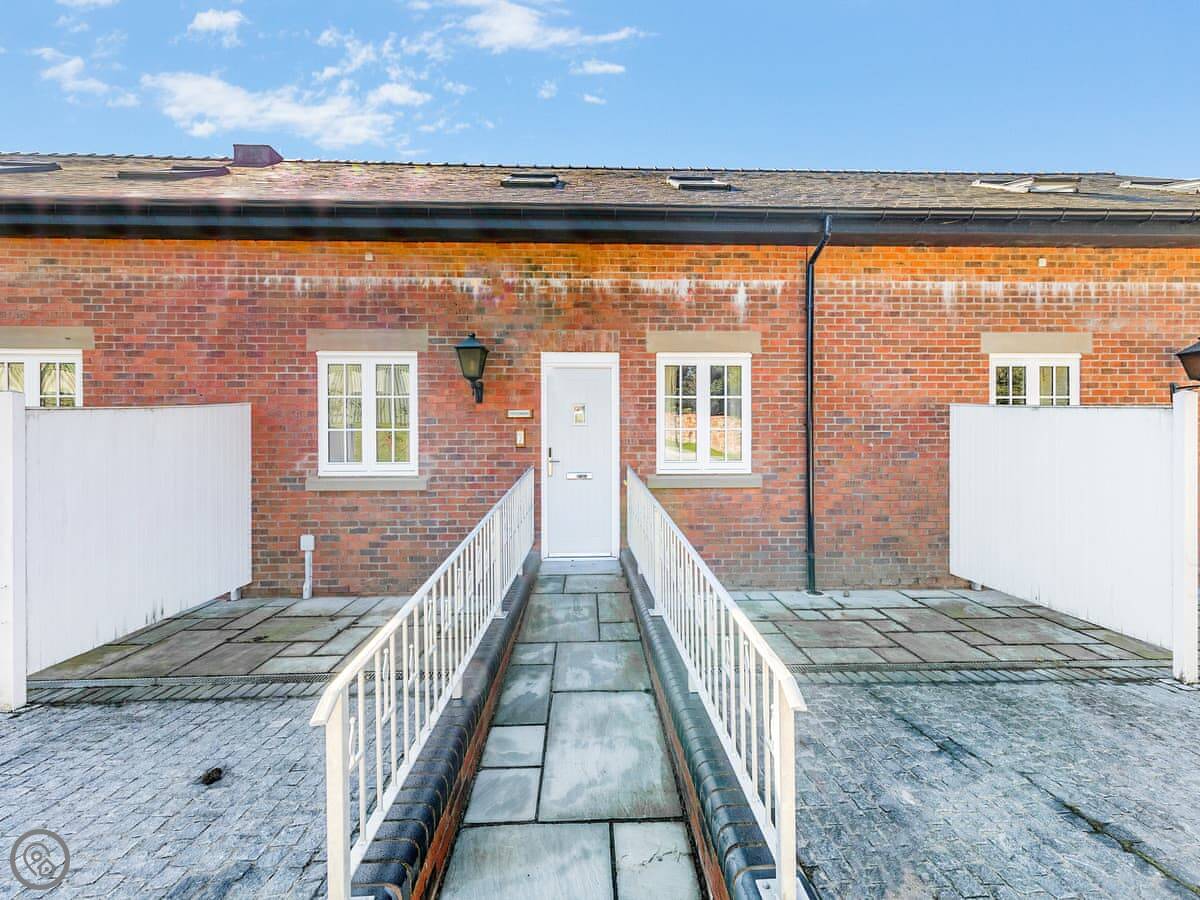 It sleeps eight. Four bedrooms, three bathrooms. One king bedroom is on the ground floor with its own shower room. That one and the front door are wheelchair friendly. Upstairs there are two more king rooms and a twin room. One of the kings has another en-suite.