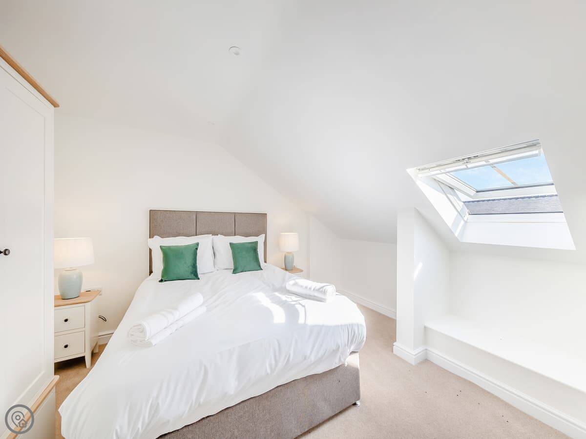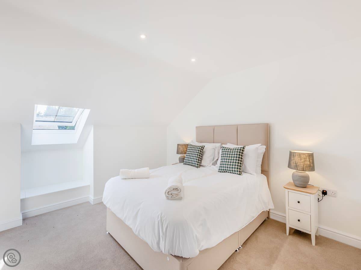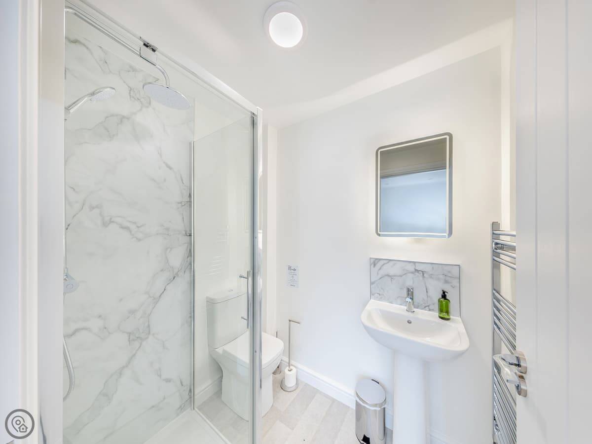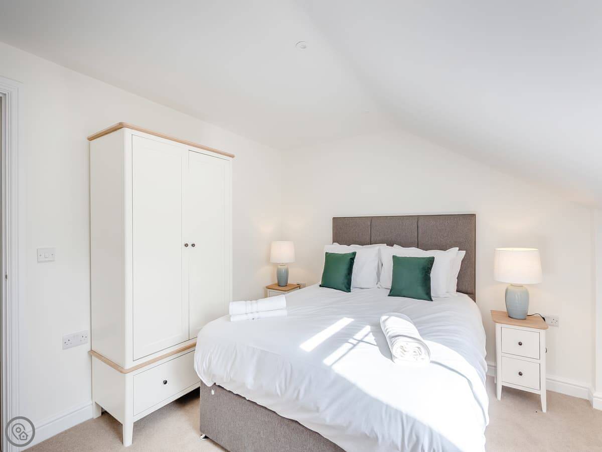 It sleeps eight. Four bedrooms, three bathrooms. One king bedroom is on the ground floor with its own shower room. That one and the front door are wheelchair friendly. Upstairs there are two more king rooms and a twin room. One of the kings has another en-suite.