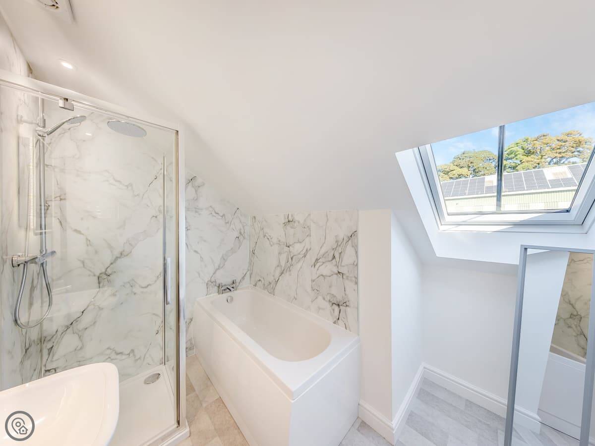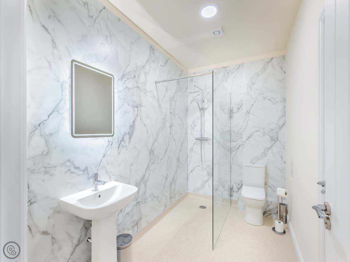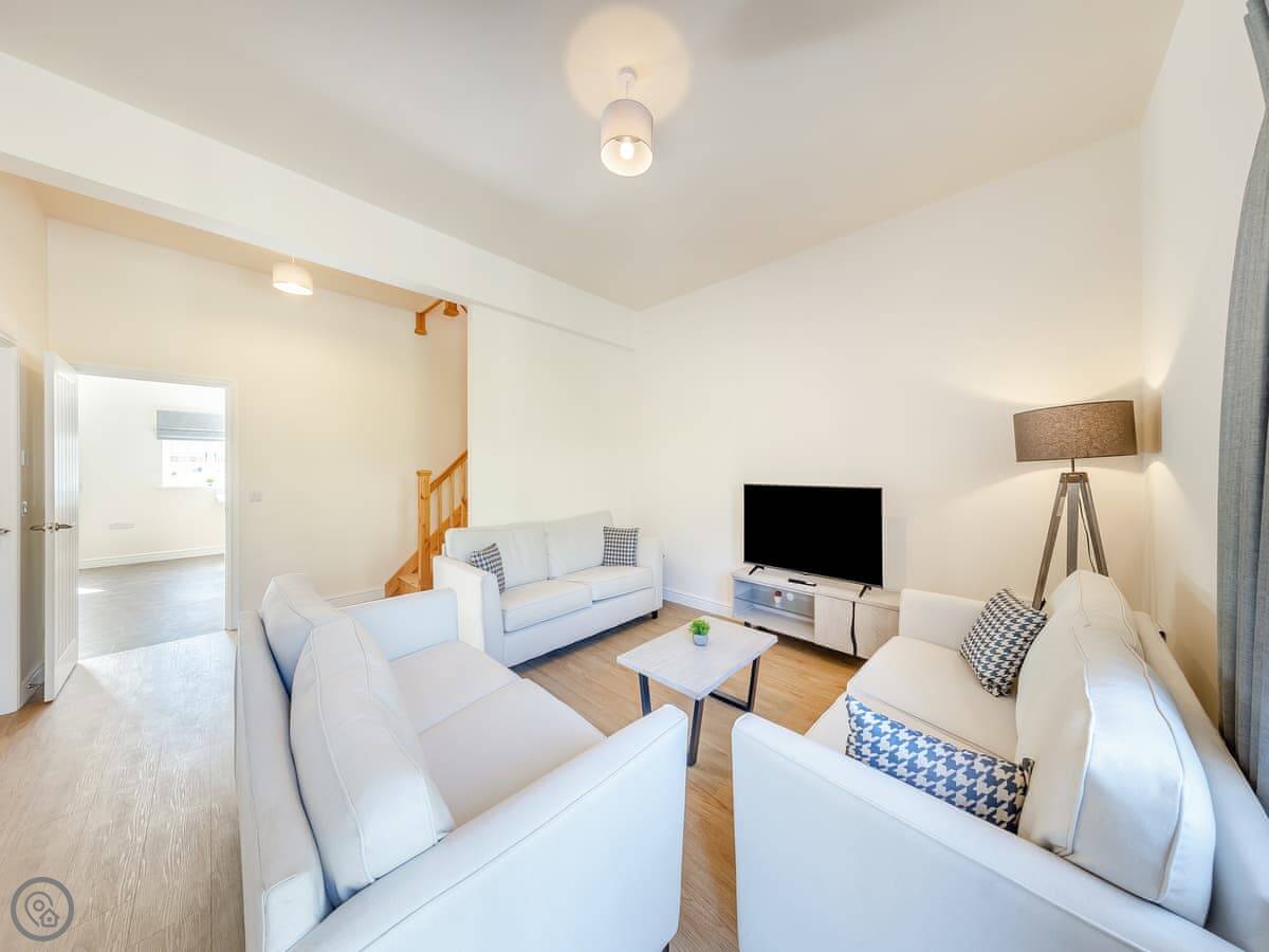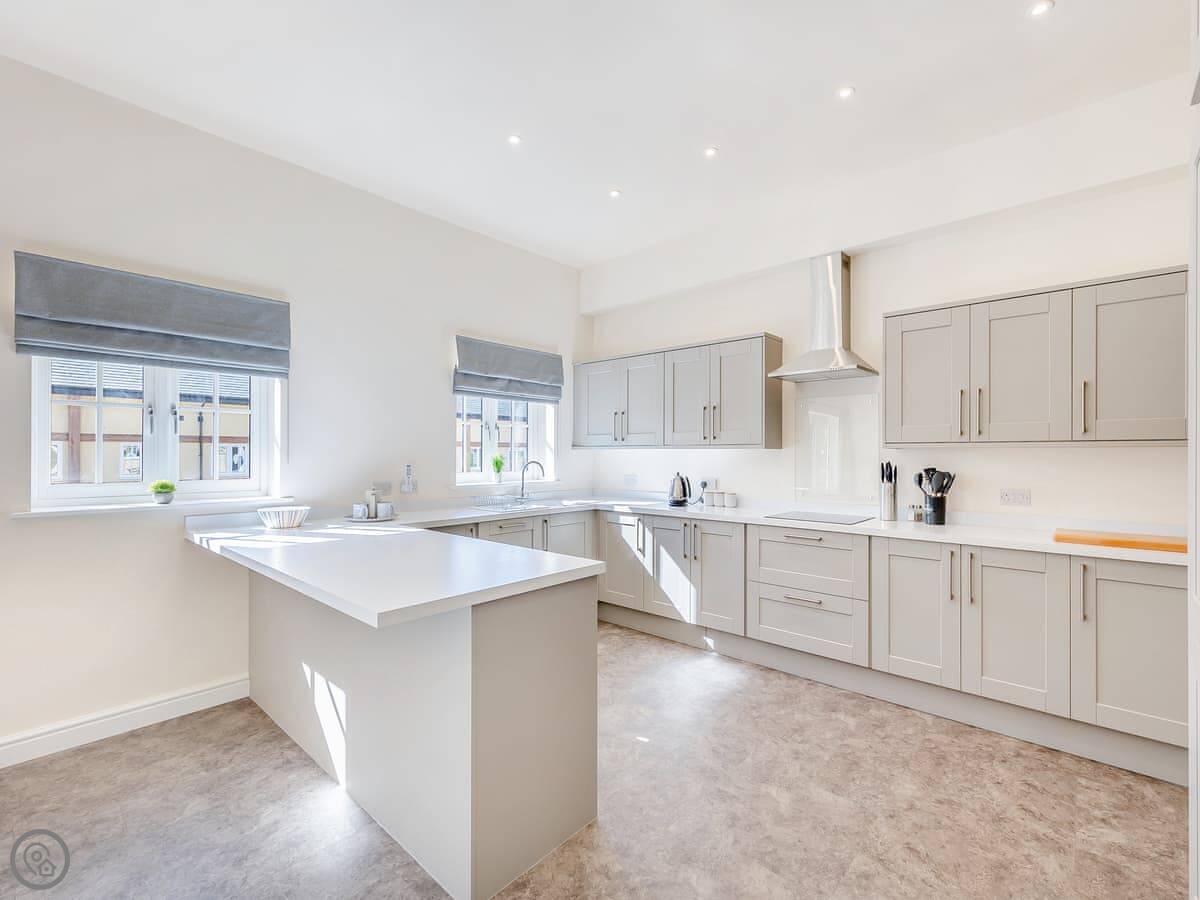 It sleeps eight. Four bedrooms, three bathrooms. One king bedroom is on the ground floor with its own shower room. That one and the front door are wheelchair friendly. Upstairs there are two more king rooms and a twin room. One of the kings has another en-suite.