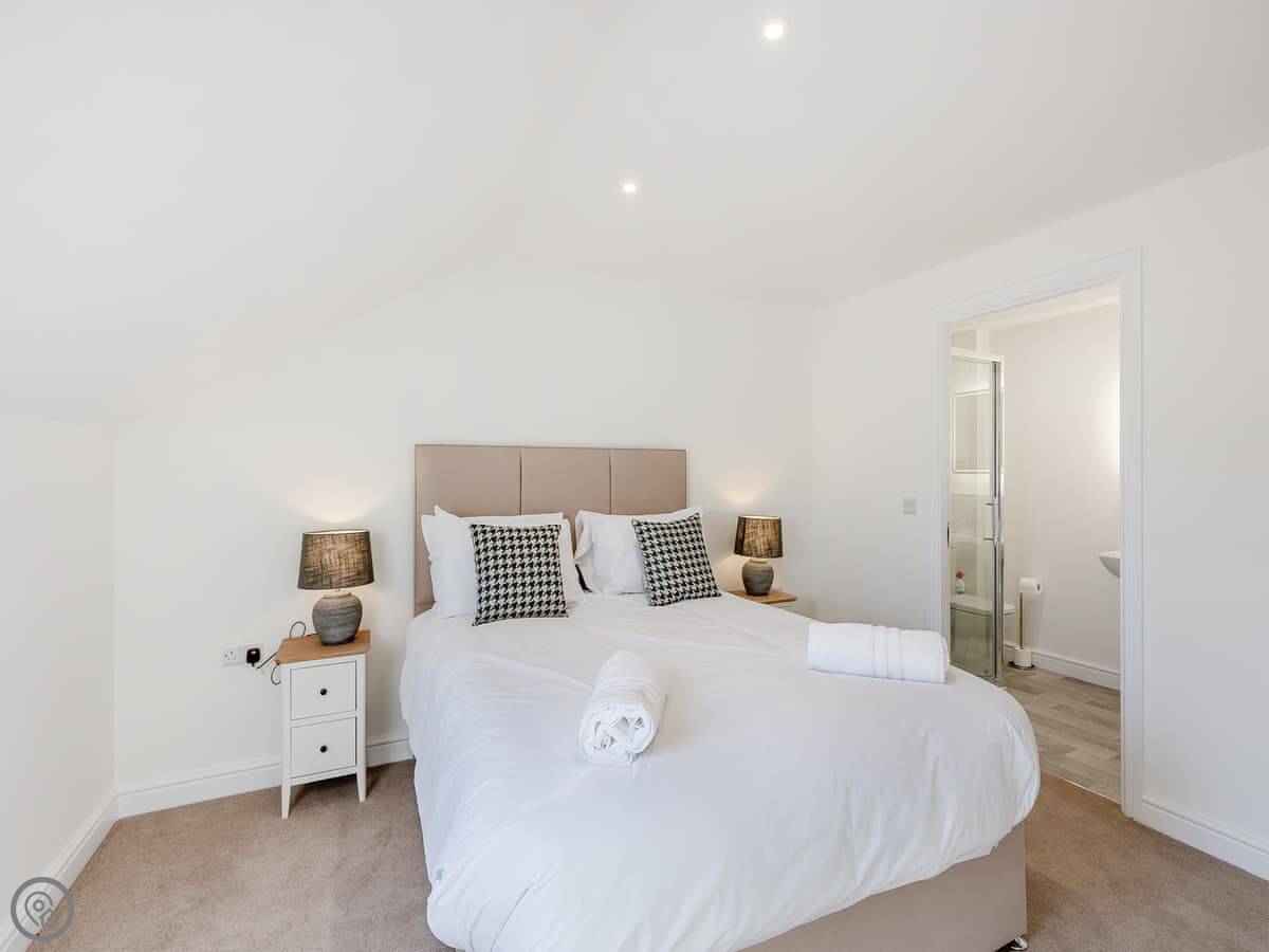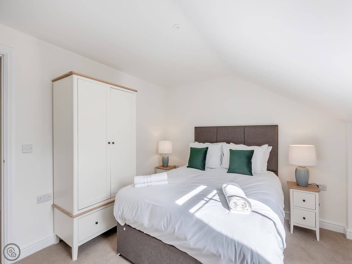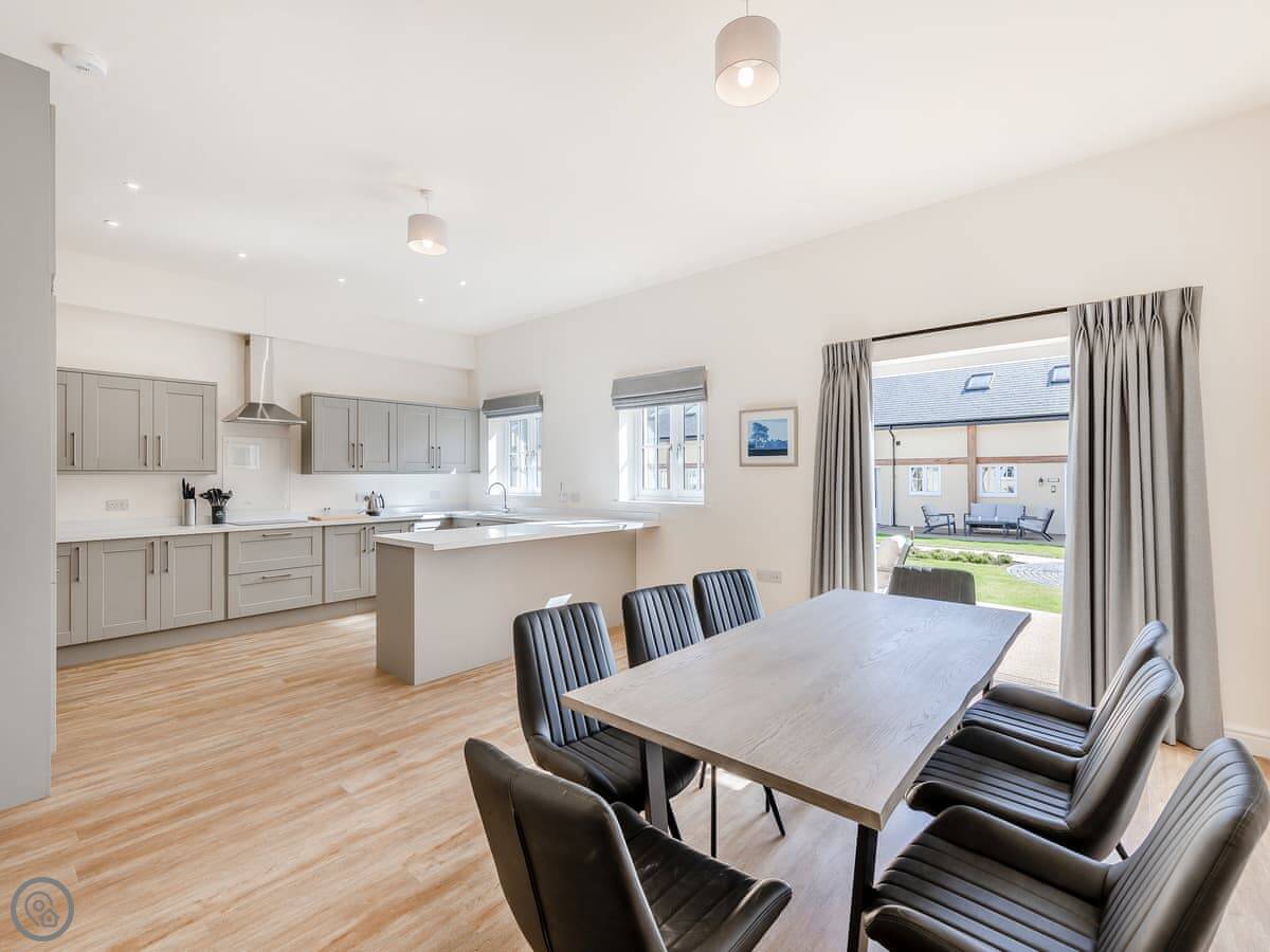 It sleeps eight in four bedrooms. There are three bathrooms, which helps with a group that size. One bedroom is on the ground floor, with its own shower room. Upstairs has two more king rooms and a twin room. The stairs are fine.