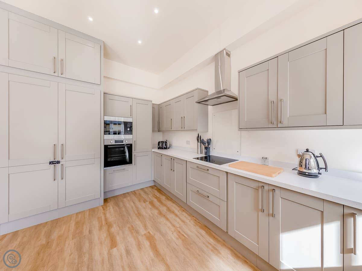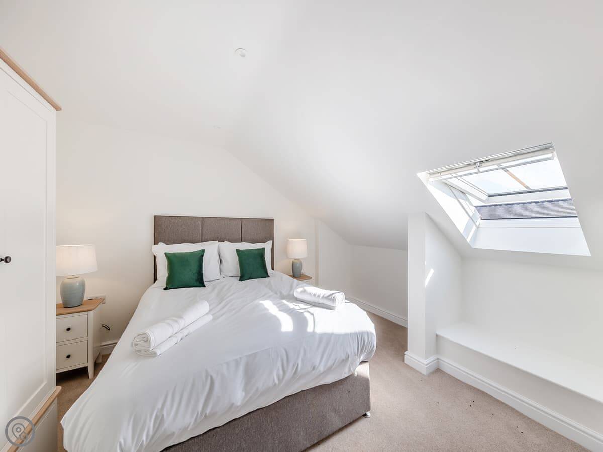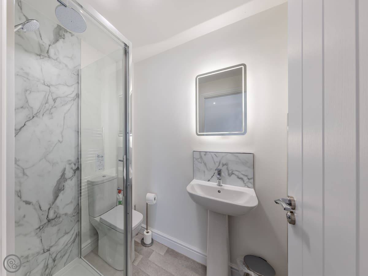 It sleeps eight in four bedrooms. There are three bathrooms, which helps with a group that size. One bedroom is on the ground floor, with its own shower room. Upstairs has two more king rooms and a twin room. The stairs are fine.