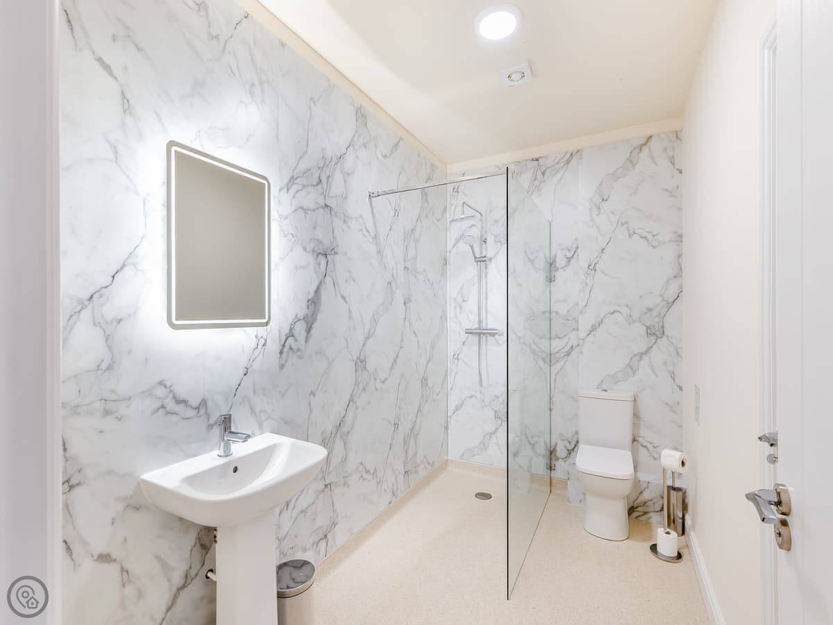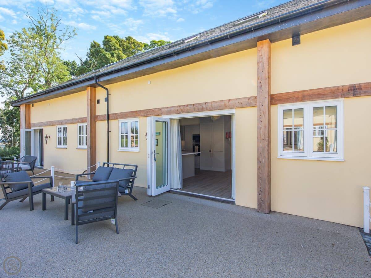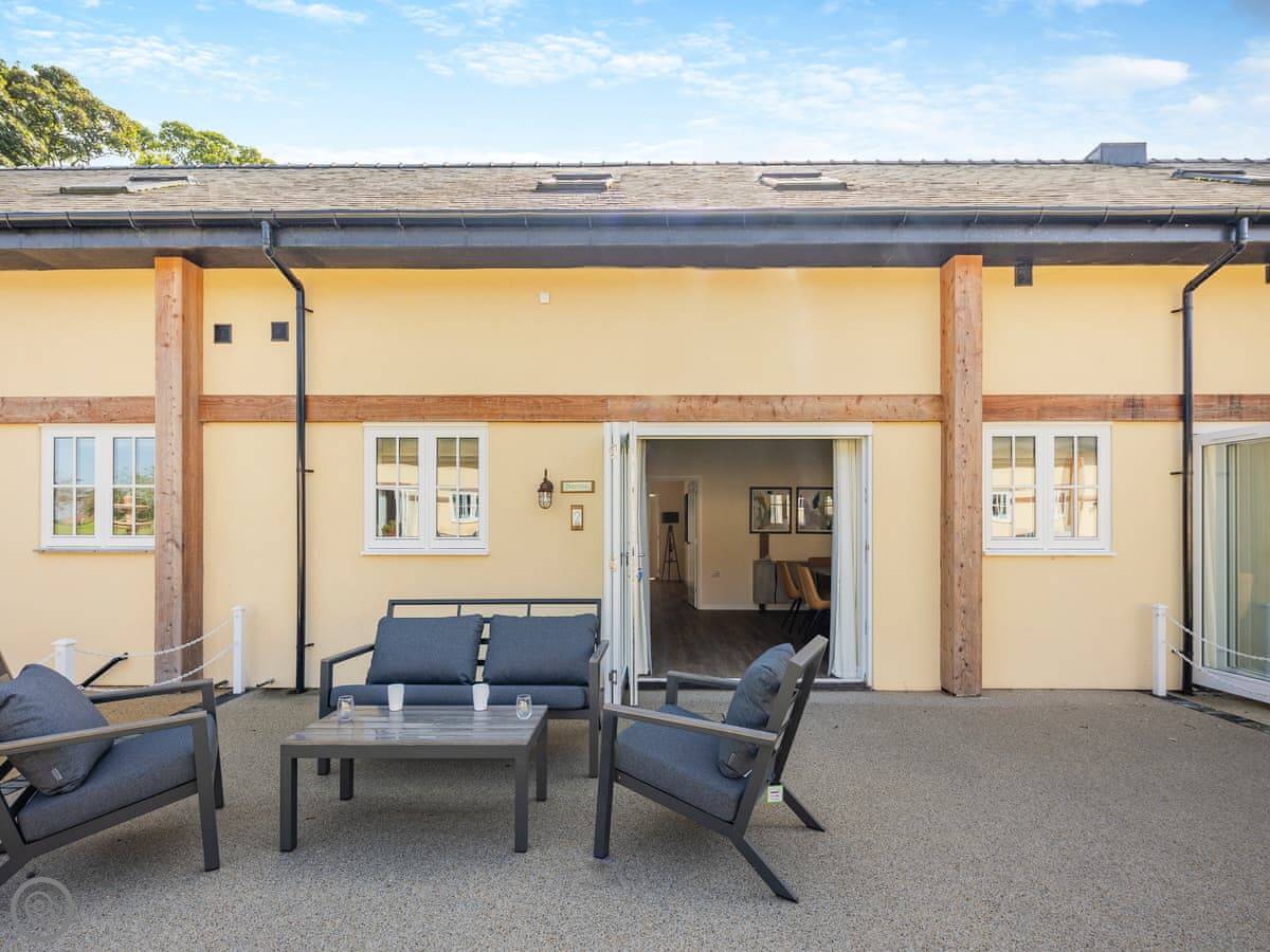 It's a 5 Star place, so it's well kitted out. Underfloor heating, a dishwasher, washing machine, that sort of thing. The wi-fi is decent. Outside, there's a patio with a table and chairs.