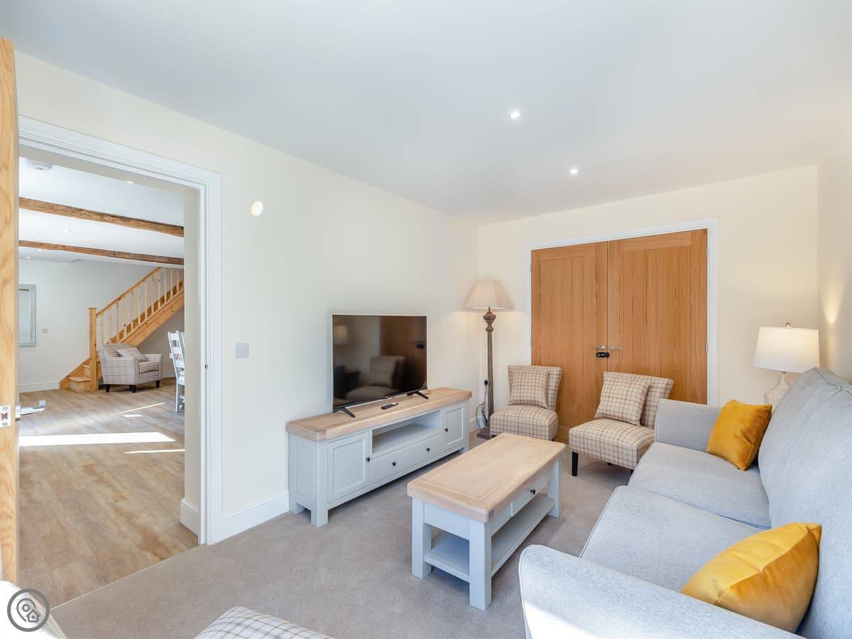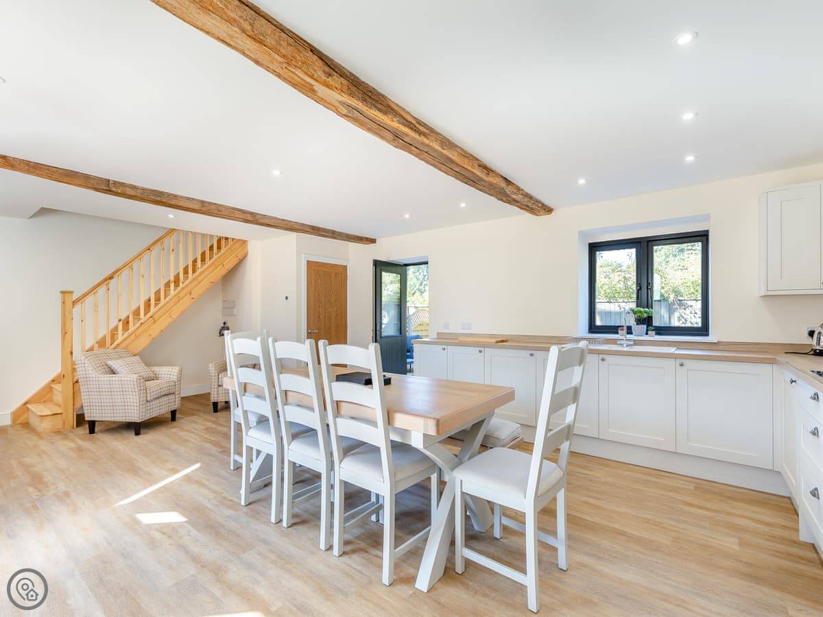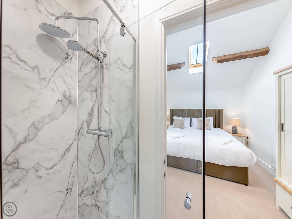 It sleeps six. Three bedrooms upstairs: one super king with its own shower room, a king room, and a twin room. There's a separate family bathroom up there as well. Downstairs is open plan: kitchen, dining area, and living room with a smart TV. It's all underfloor heated.