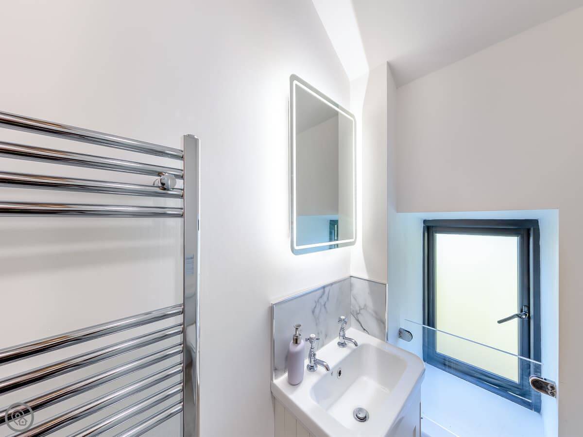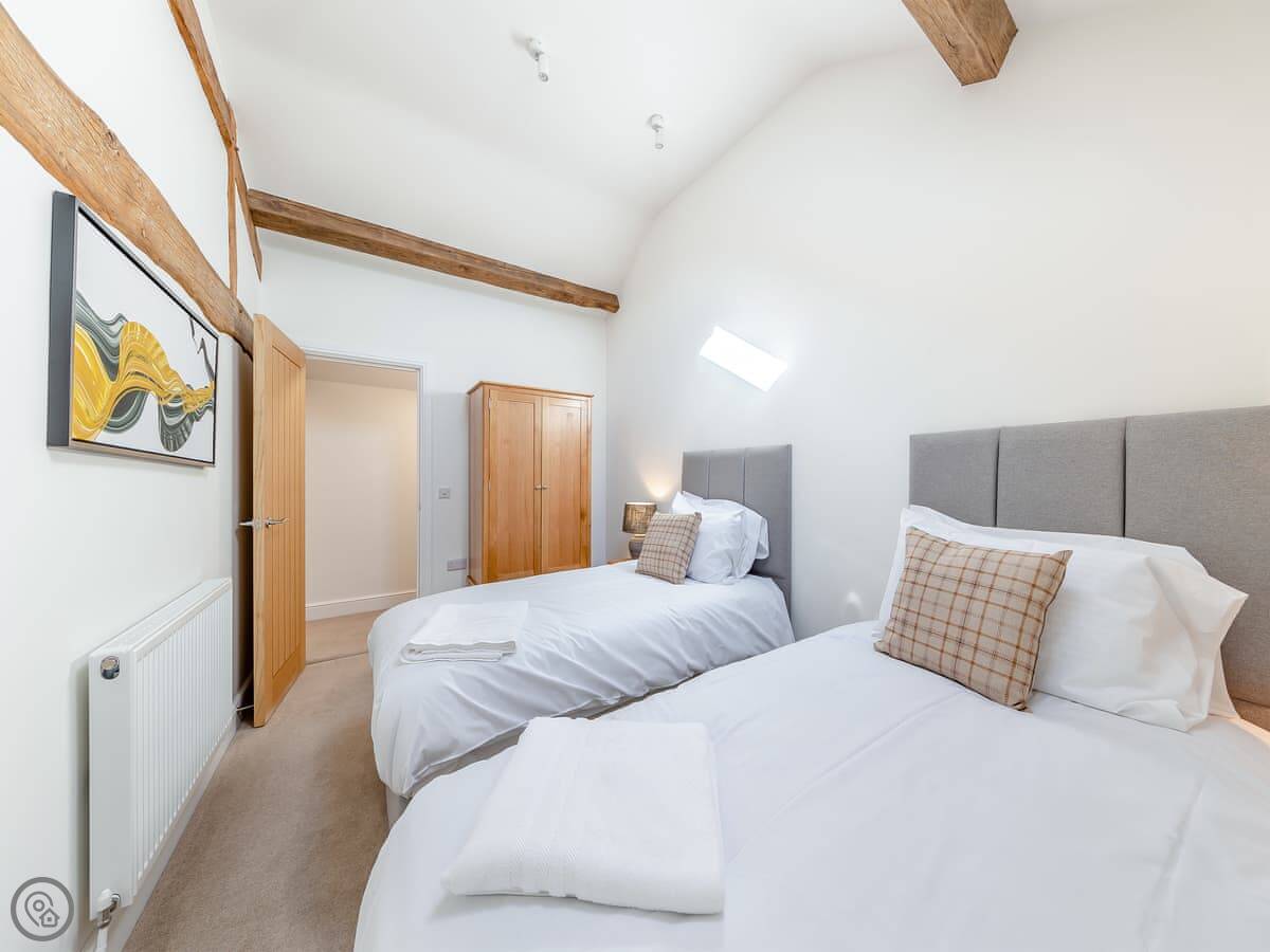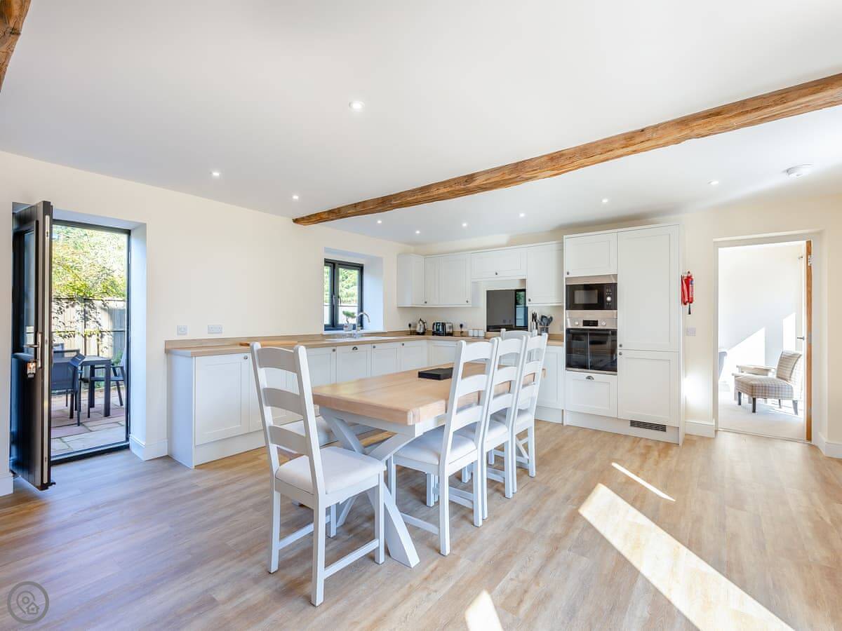 It sleeps six. Three bedrooms upstairs: one super king with its own shower room, a king room, and a twin room. There's a separate family bathroom up there as well. Downstairs is open plan: kitchen, dining area, and living room with a smart TV. It's all underfloor heated.
