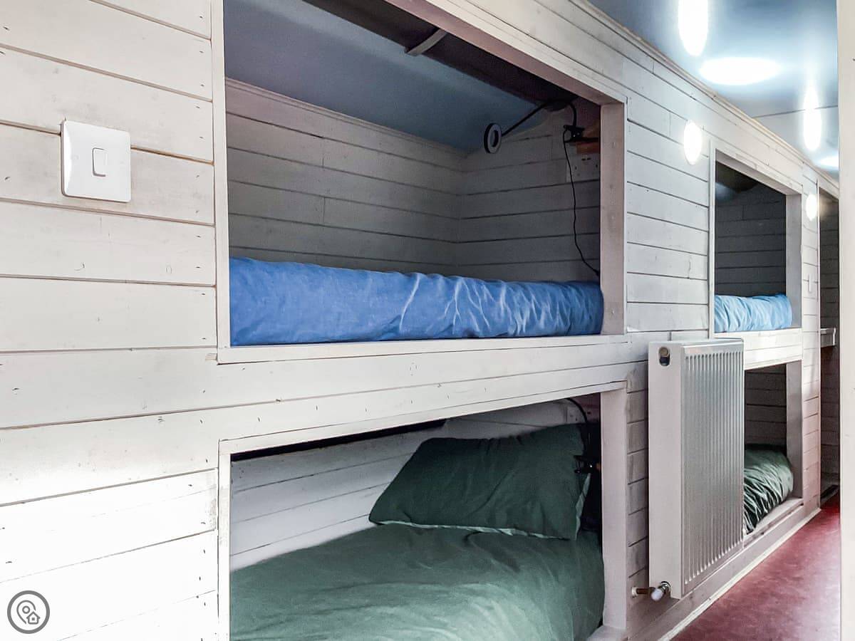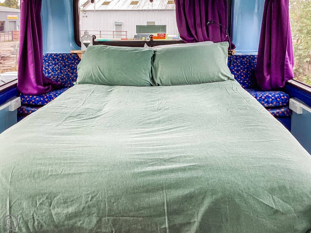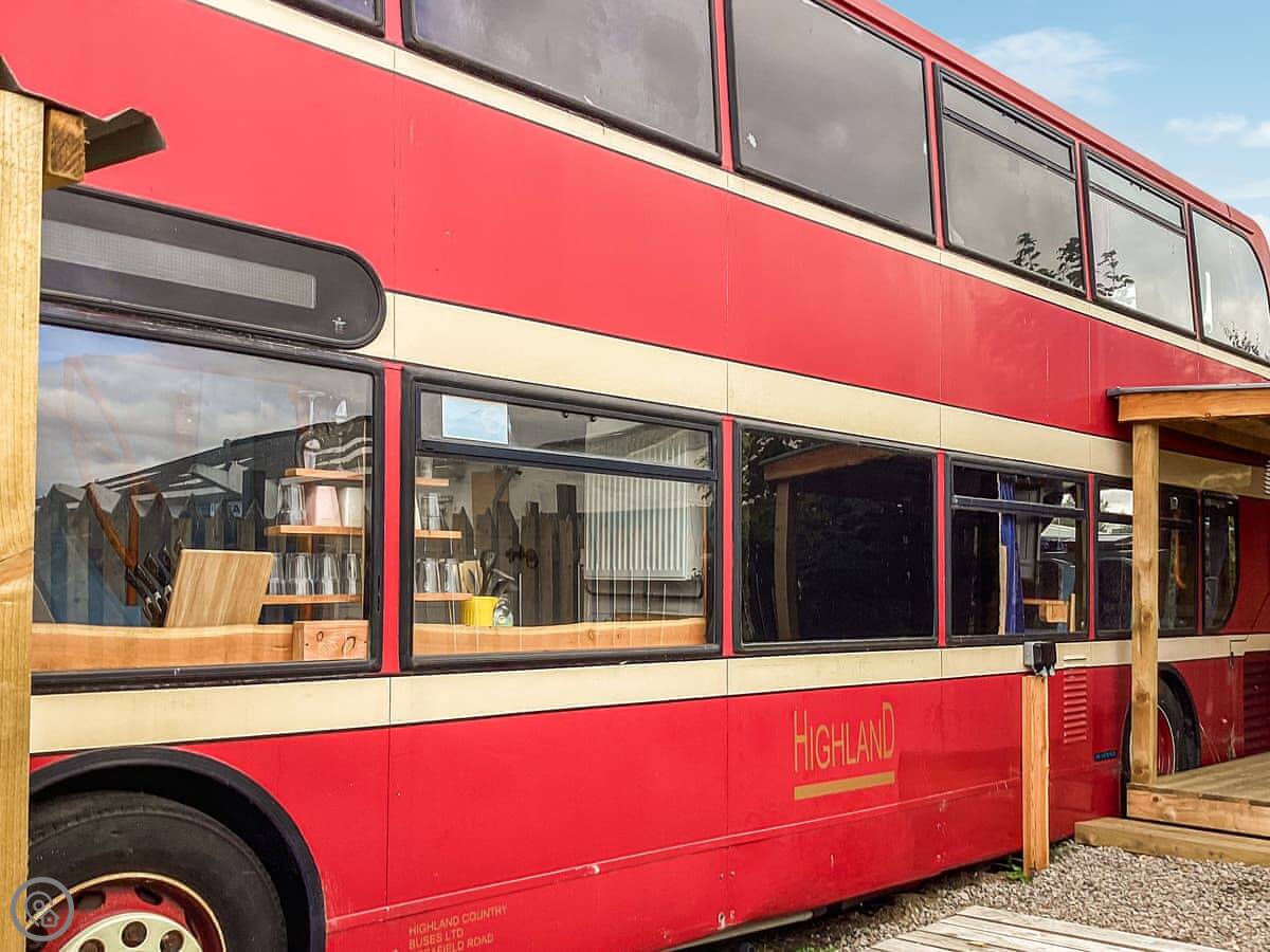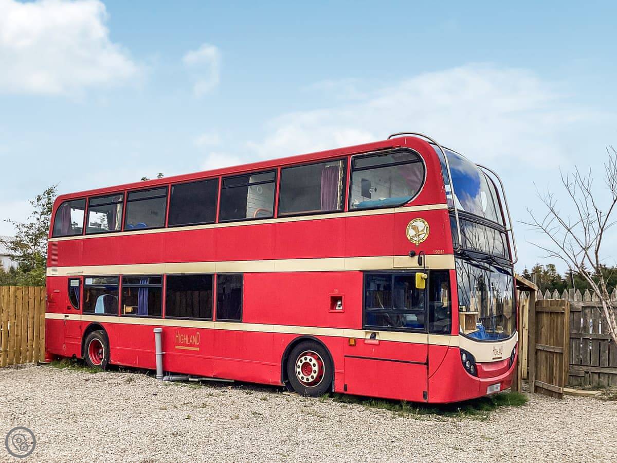 Archie is a converted double decker bus, parked in Tain in the Highlands. It's a detached property, so you get the bit of land it's on to yourselves. The bus sleeps up to ten people, but it's in three bedrooms on the upper deck, so you need to be okay sharing space.