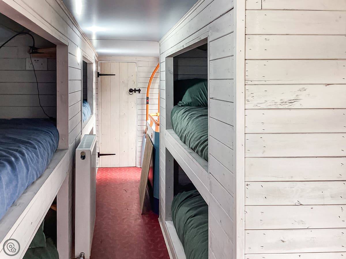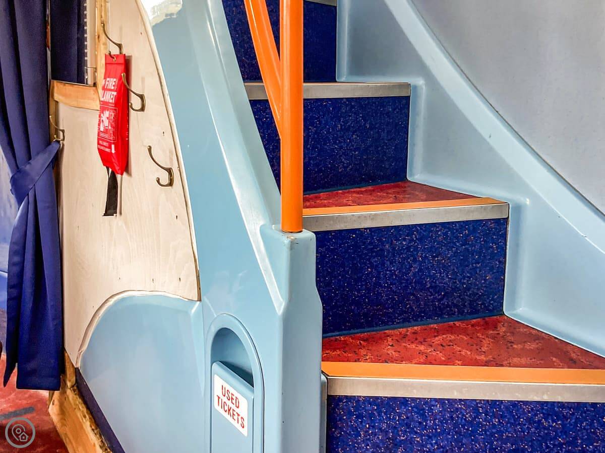 The stairs to the upper deck are the original bus stairs. They're steep and a bit narrow. The bedrooms are up there. They're cosy, with good storage.