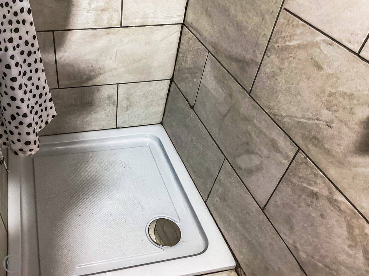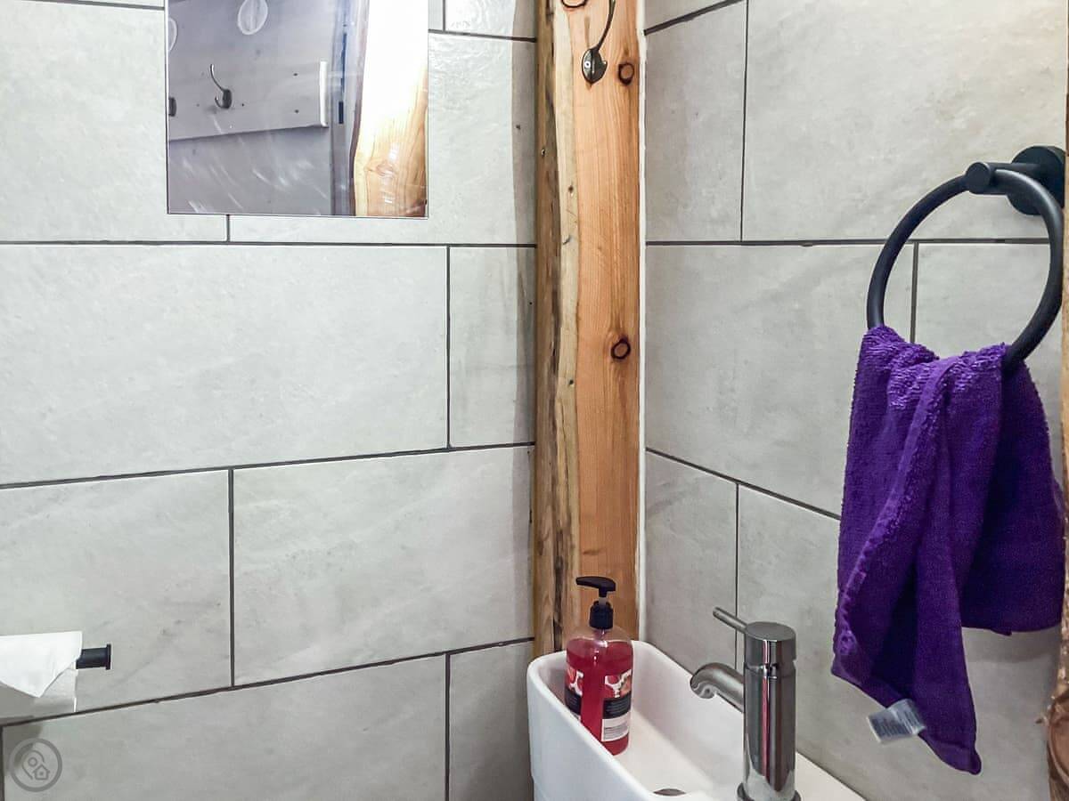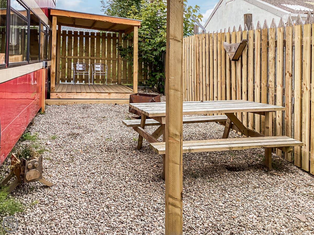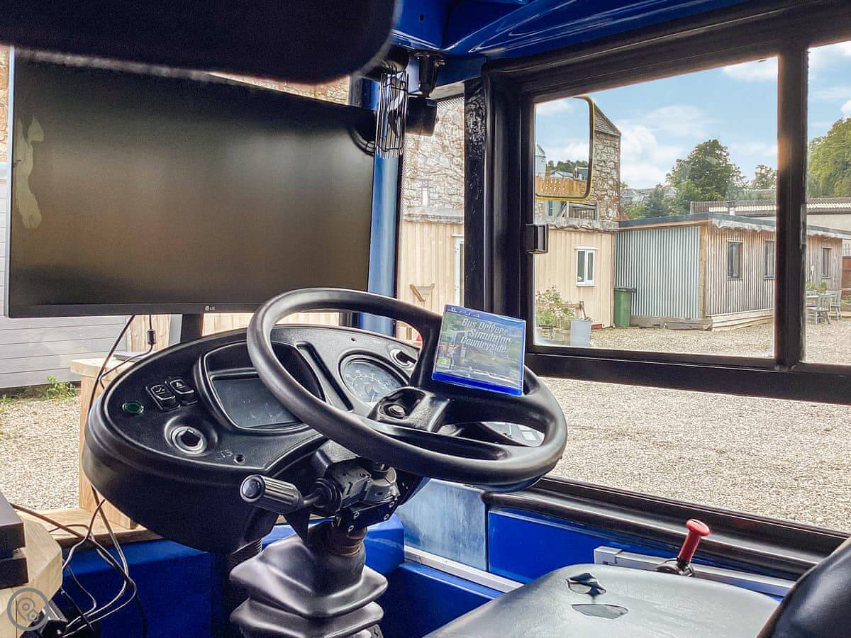 Downstairs is open plan. The living area has some of the original bus seats, which are comfortable enough. There's a dining table and a kitchen with what you need for simple meals. There's a TV and WiFi. The two shower rooms are downstairs too. They're modern.