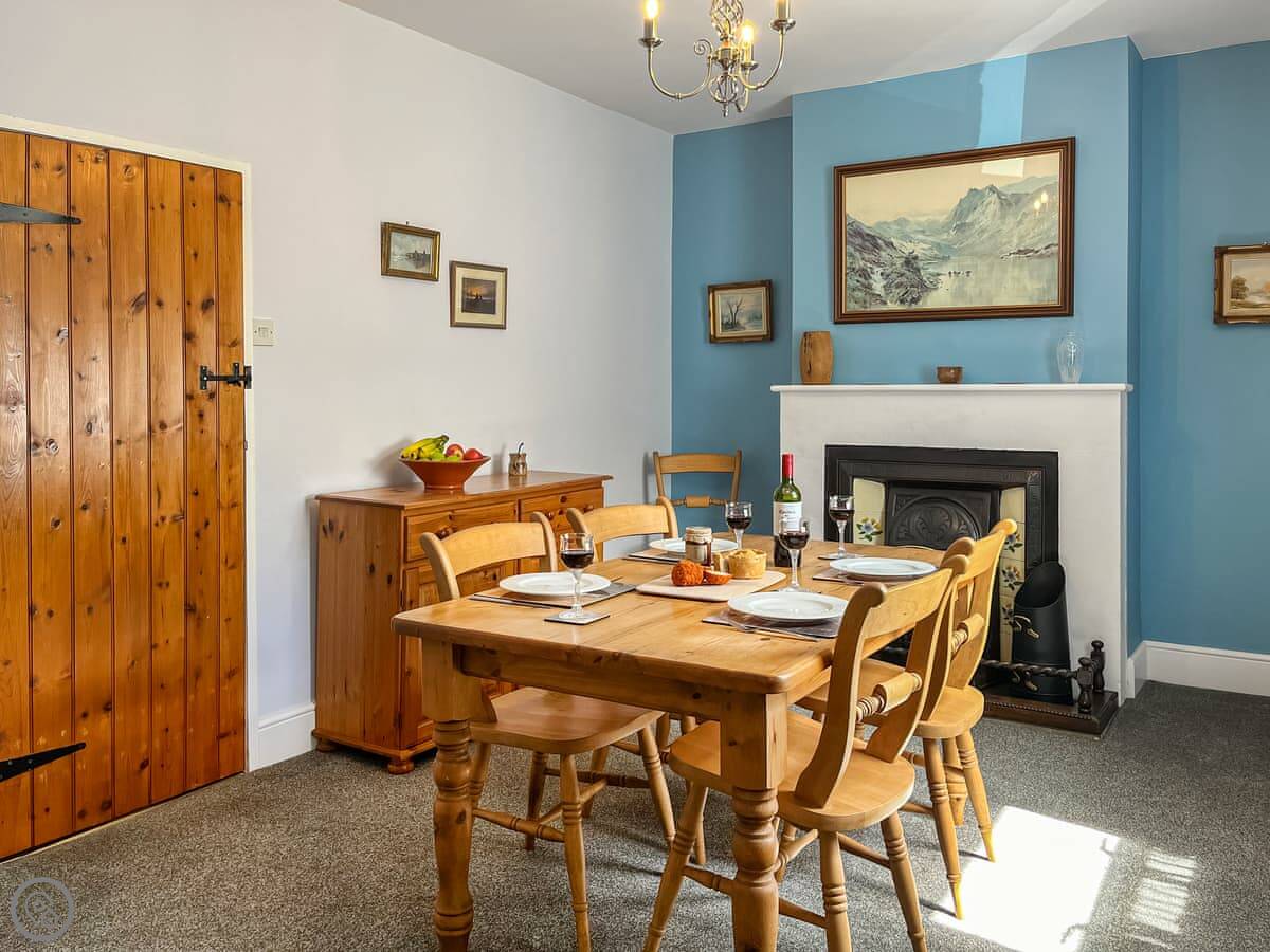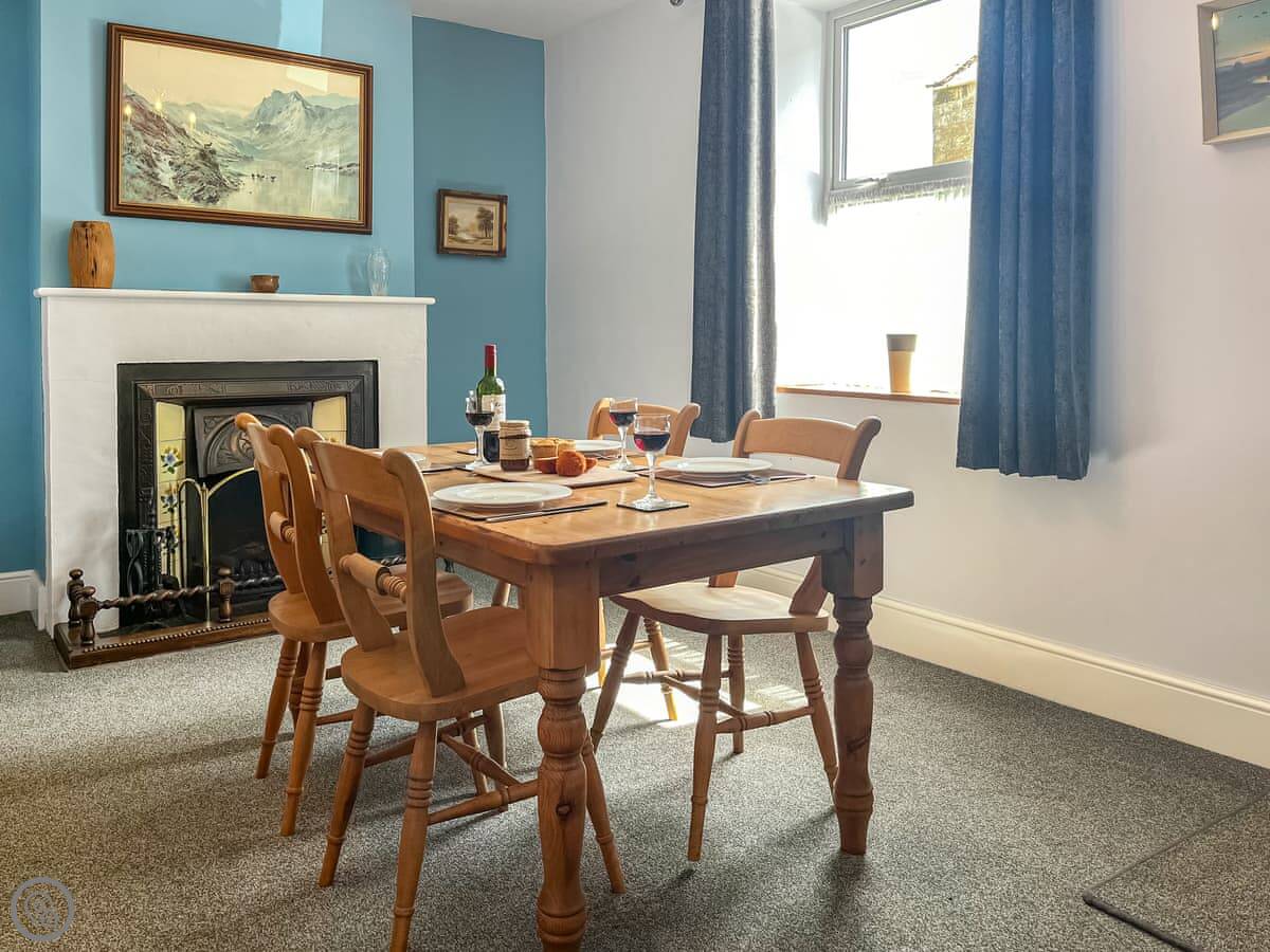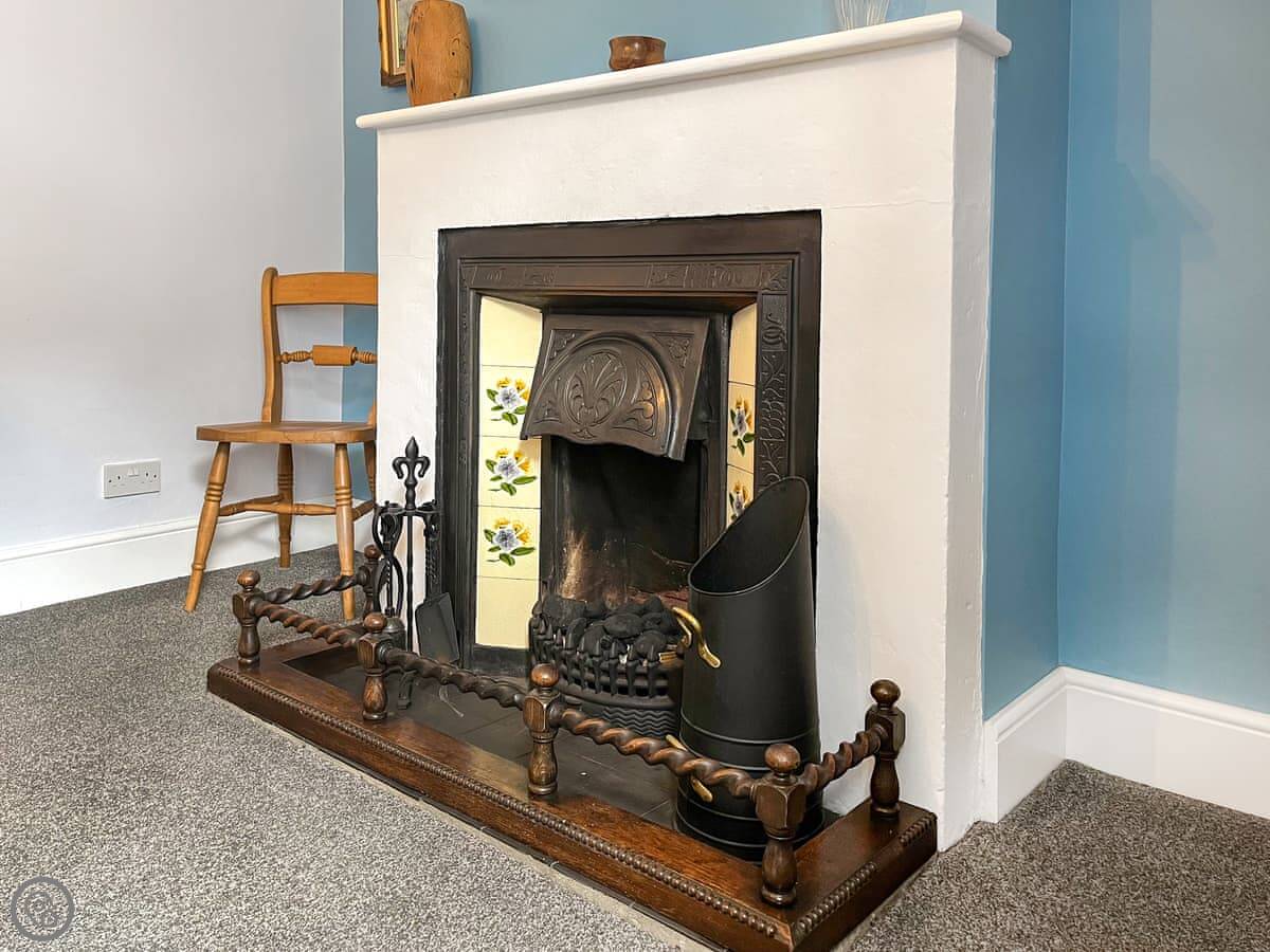 Inside, it's kept a lot of the old features. There's an original fireplace in the dining room. The living room has an open fire set into an old cast iron oven. The kitchen has what you need. The wifi works.