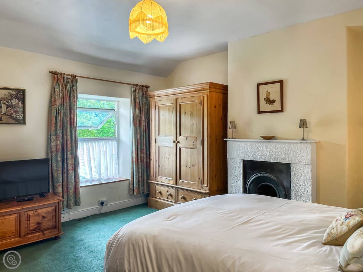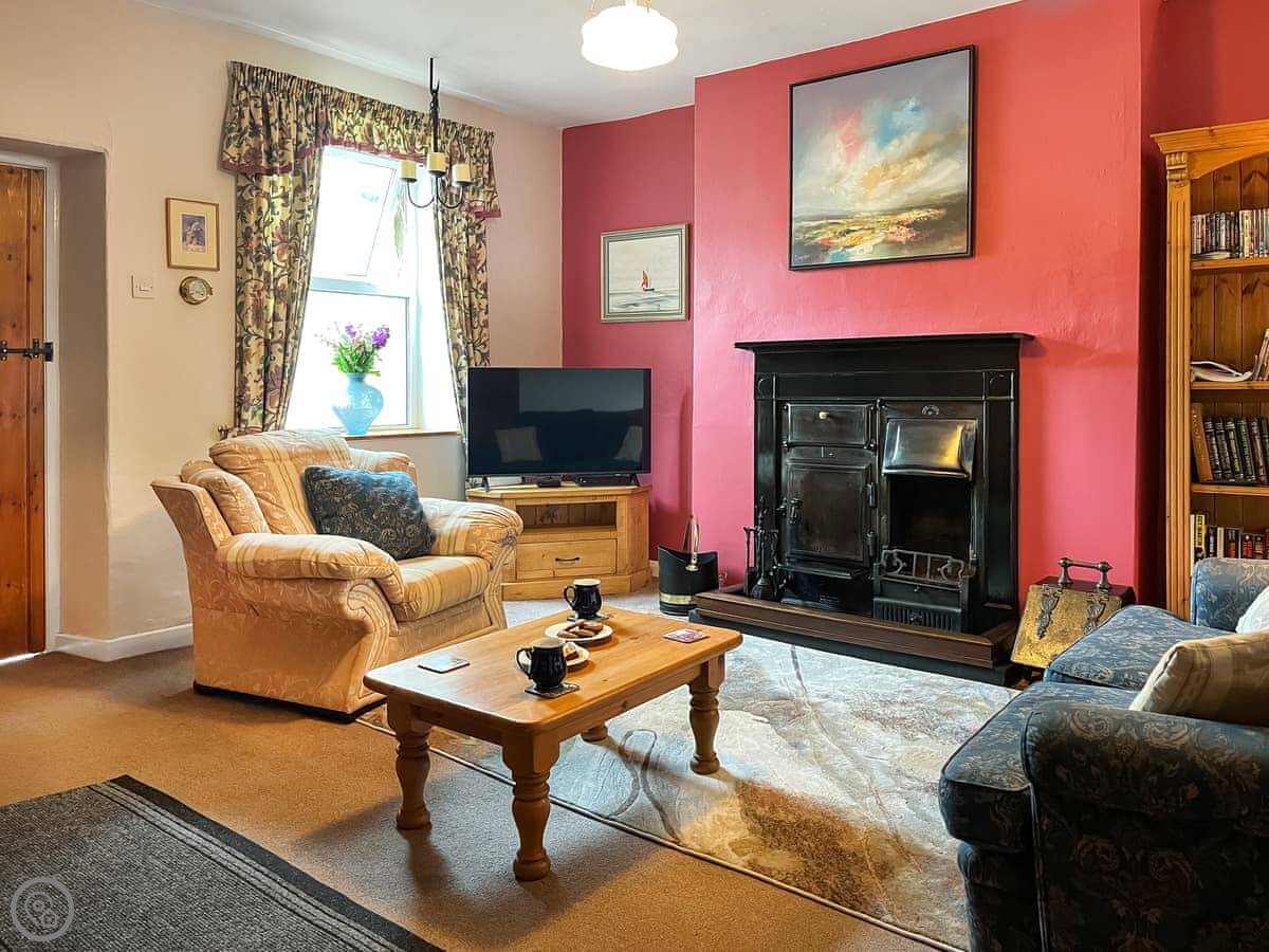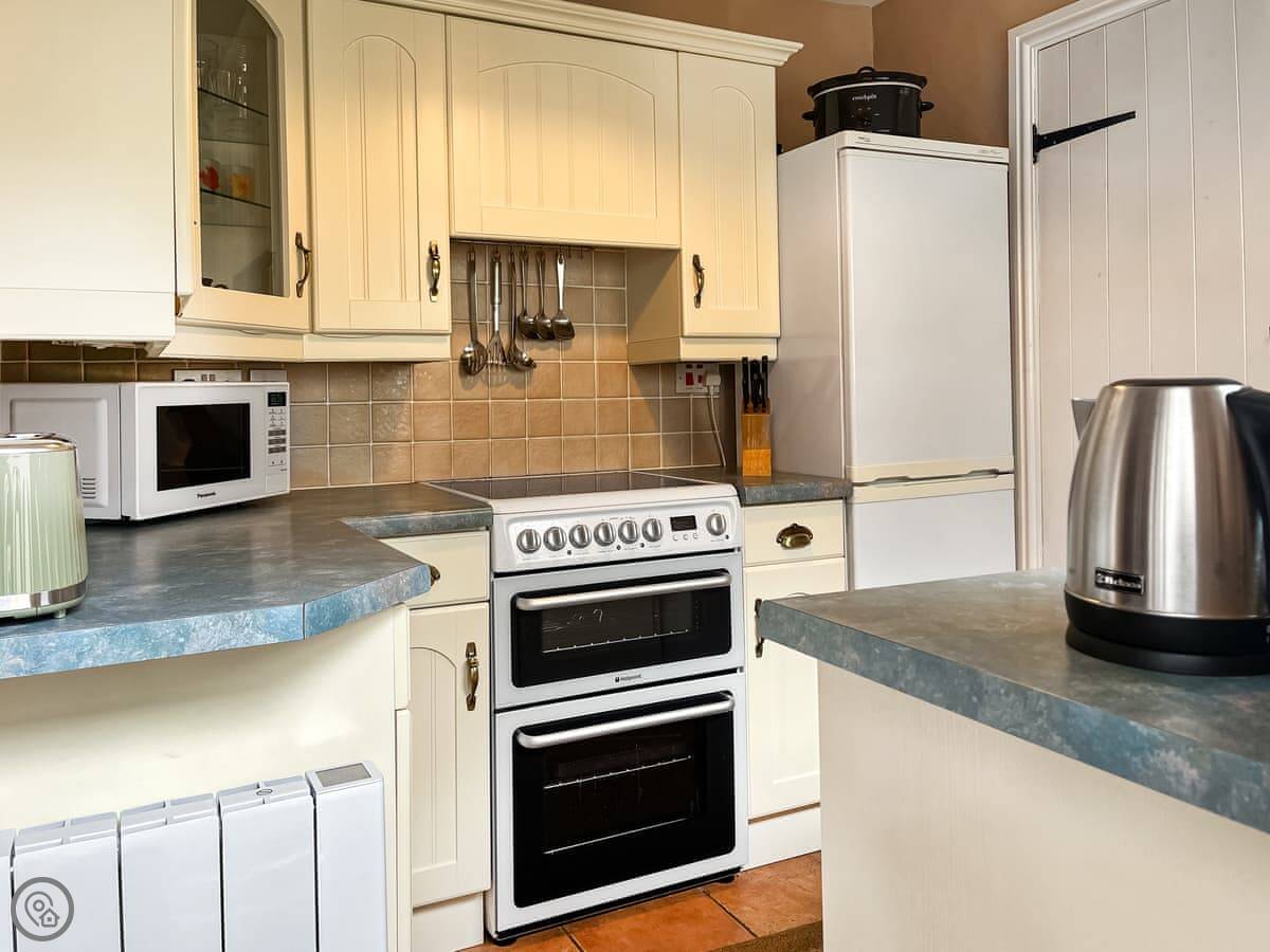 Inside, it's kept a lot of the old features. There's an original fireplace in the dining room. The living room has an open fire set into an old cast iron oven. The kitchen has what you need. The wifi works.