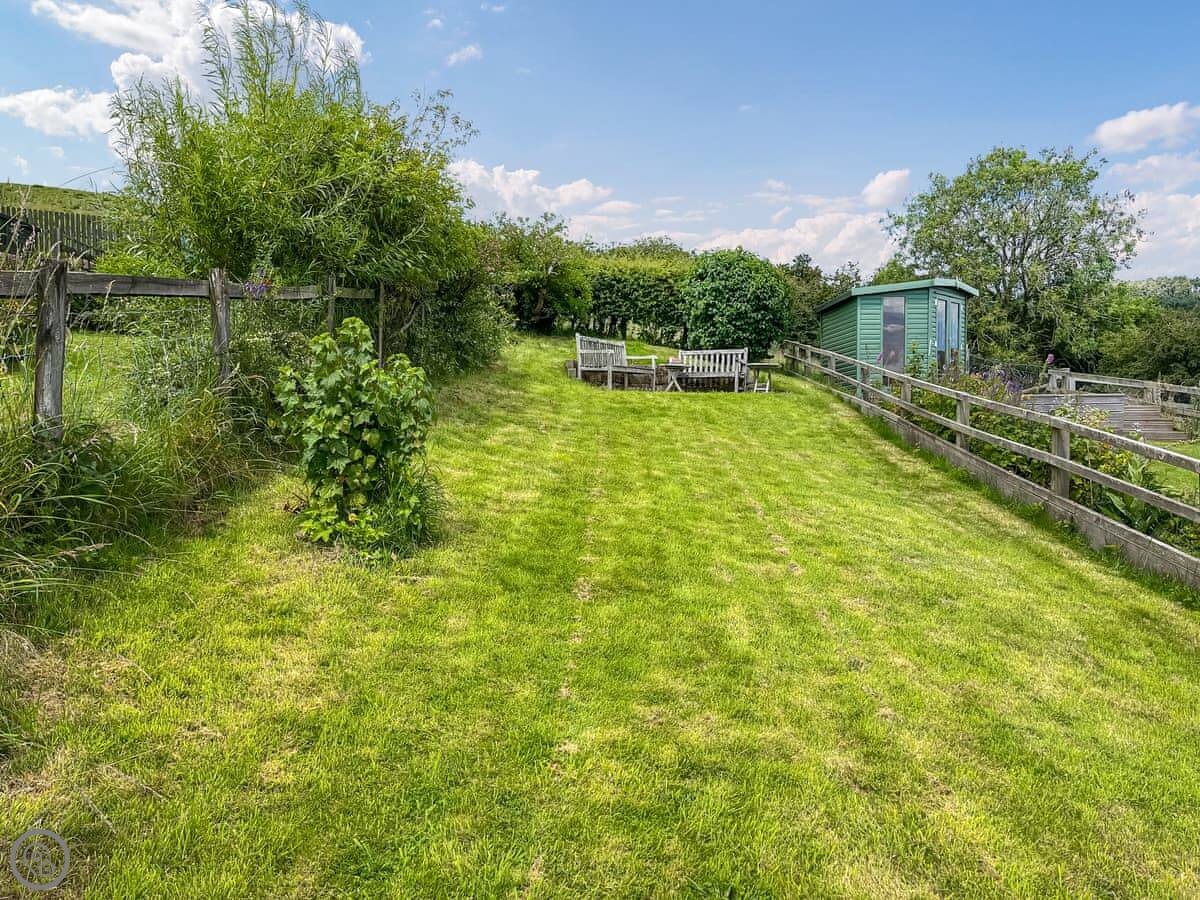 The garden is over the road from the front door. It's enclosed. There's a raised seating area up there with a good view over the fields.
