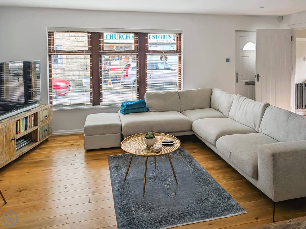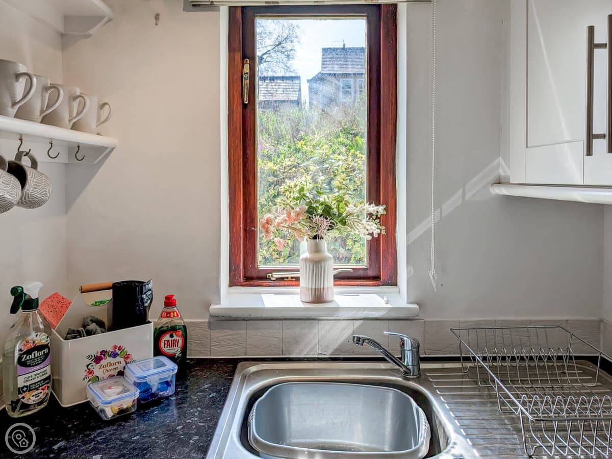 Curiosity Cottage is in Eyam, which is a village in the Peak District. It sleeps six people. There are three bedrooms upstairs: two doubles and one with bunk beds. There's one bathroom with a shower over the bath.