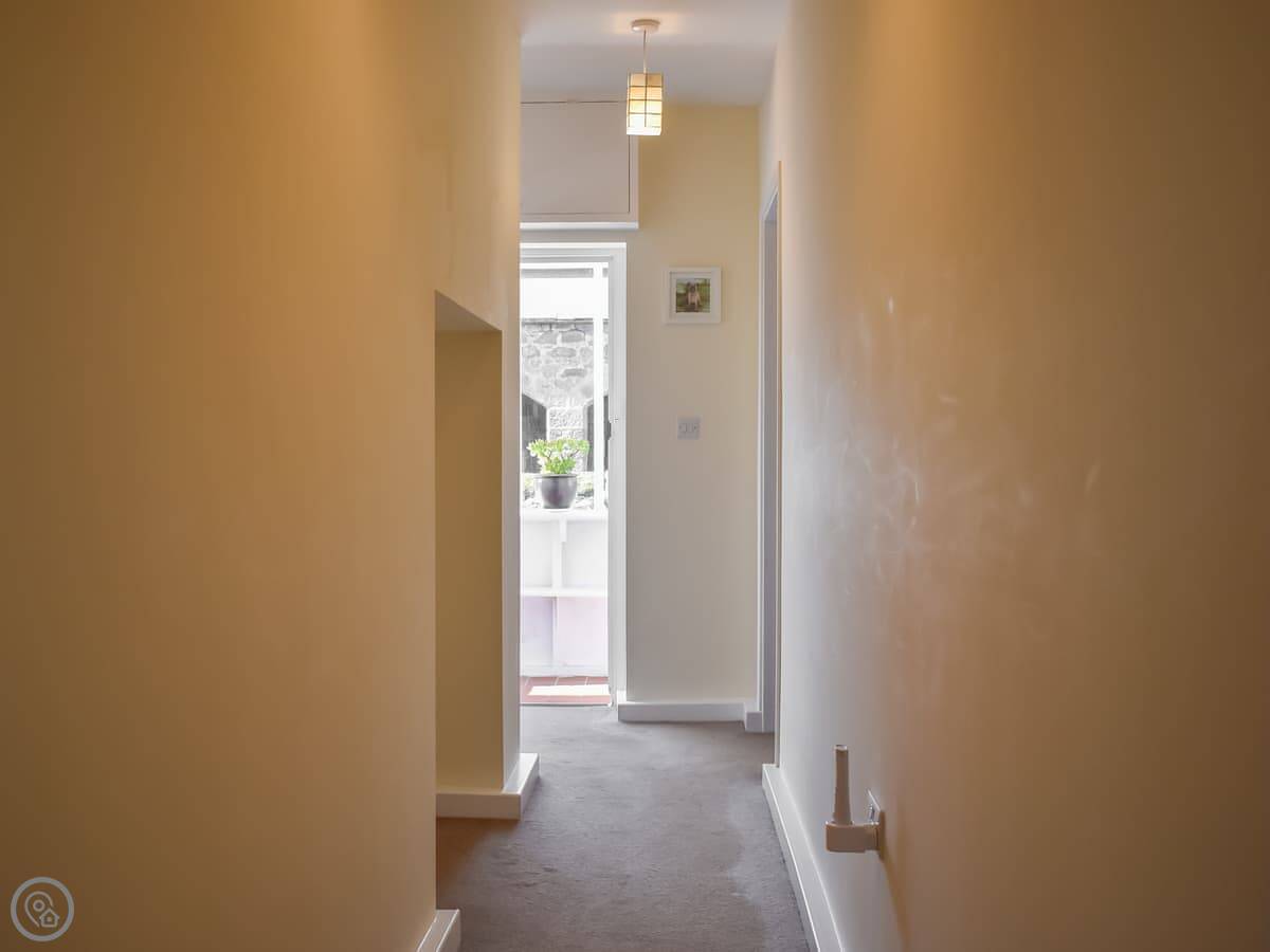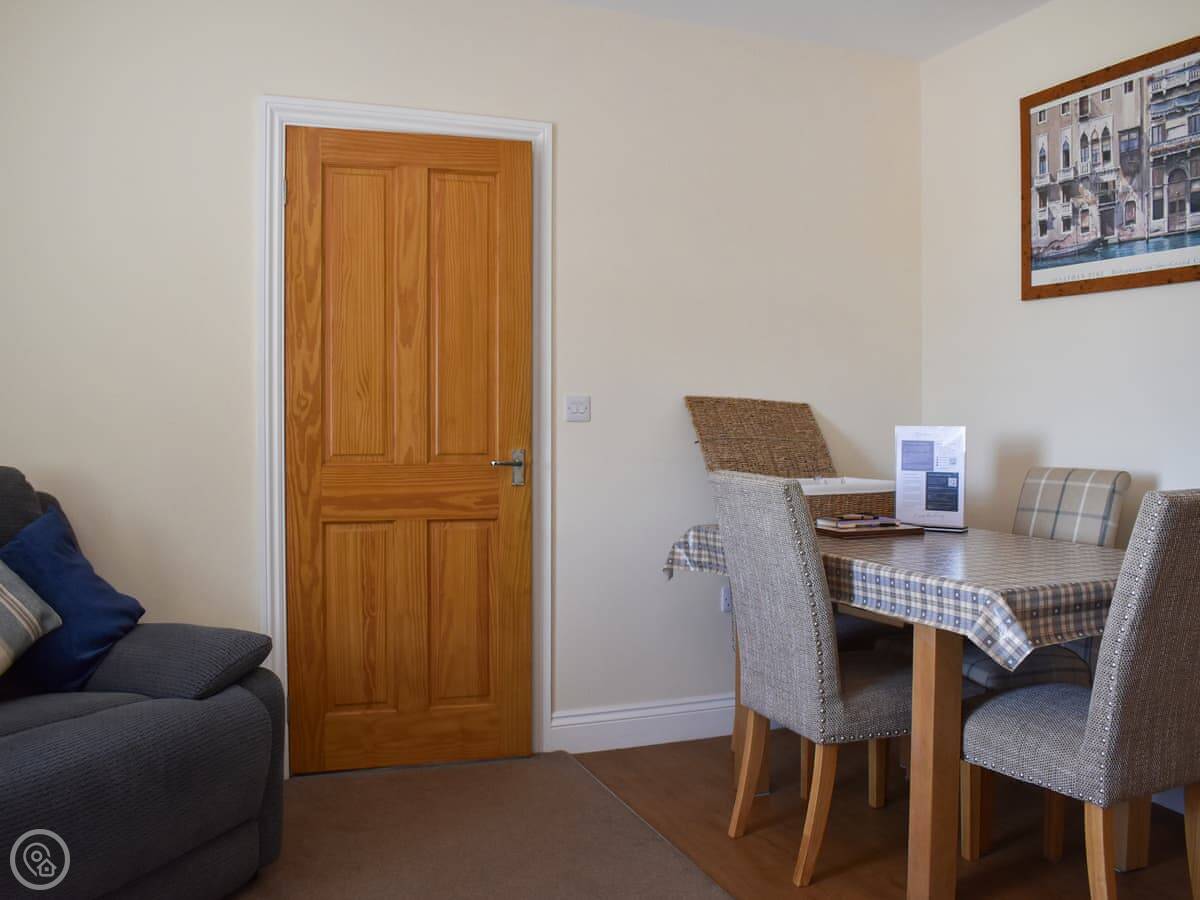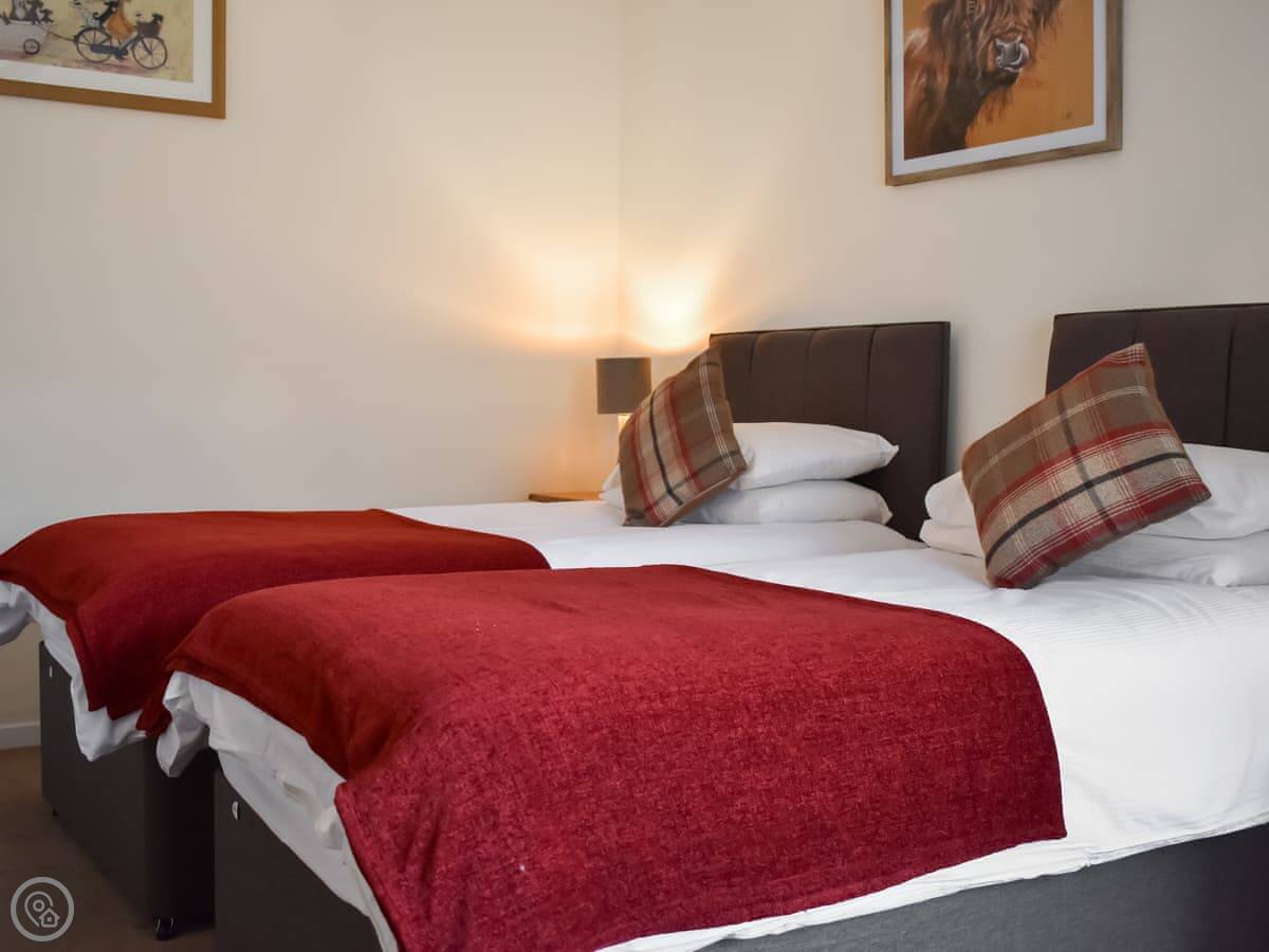 It sleeps four in two bedrooms. One has a king-size bed, the other has a super-king that can be split into twins if you need it. There's one bathroom. The bathroom is off the kitchen and there's a small step up to it. The shower is electric. It's a 4 Star rating, which means it's comfortable and well-kept.