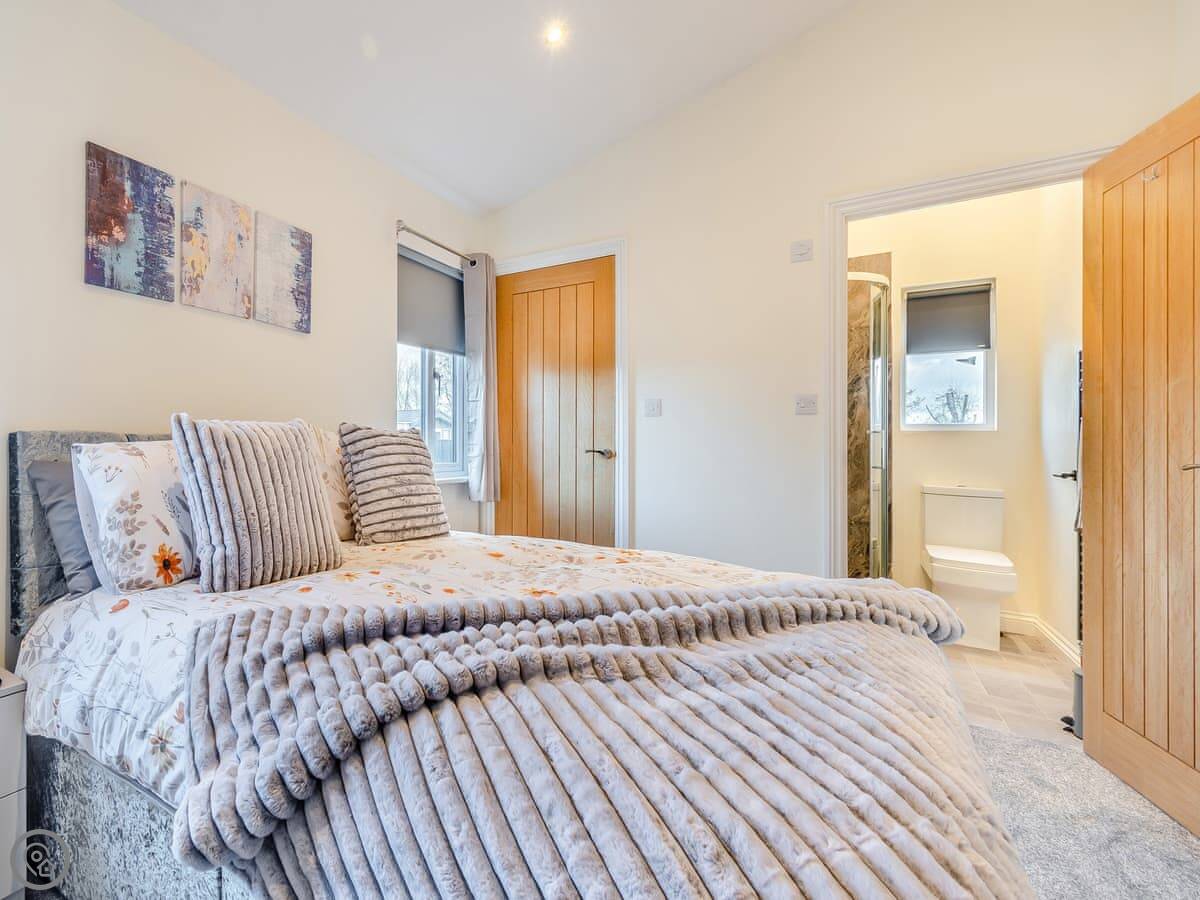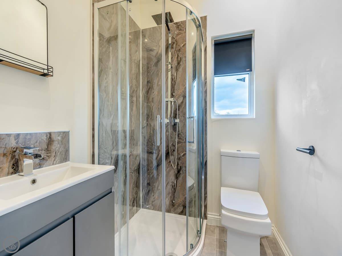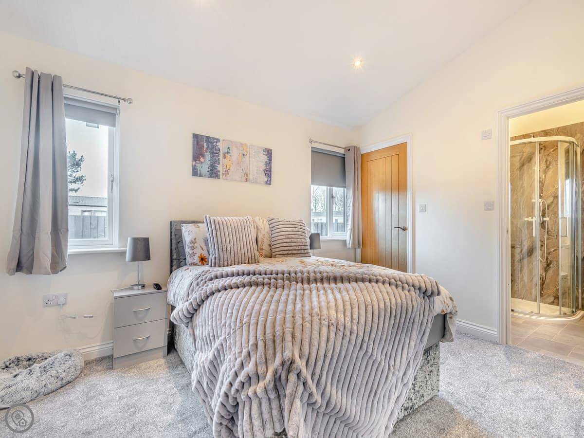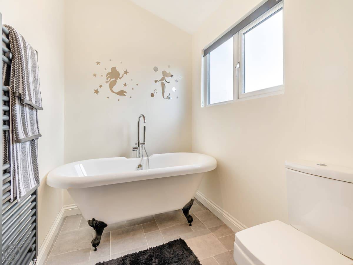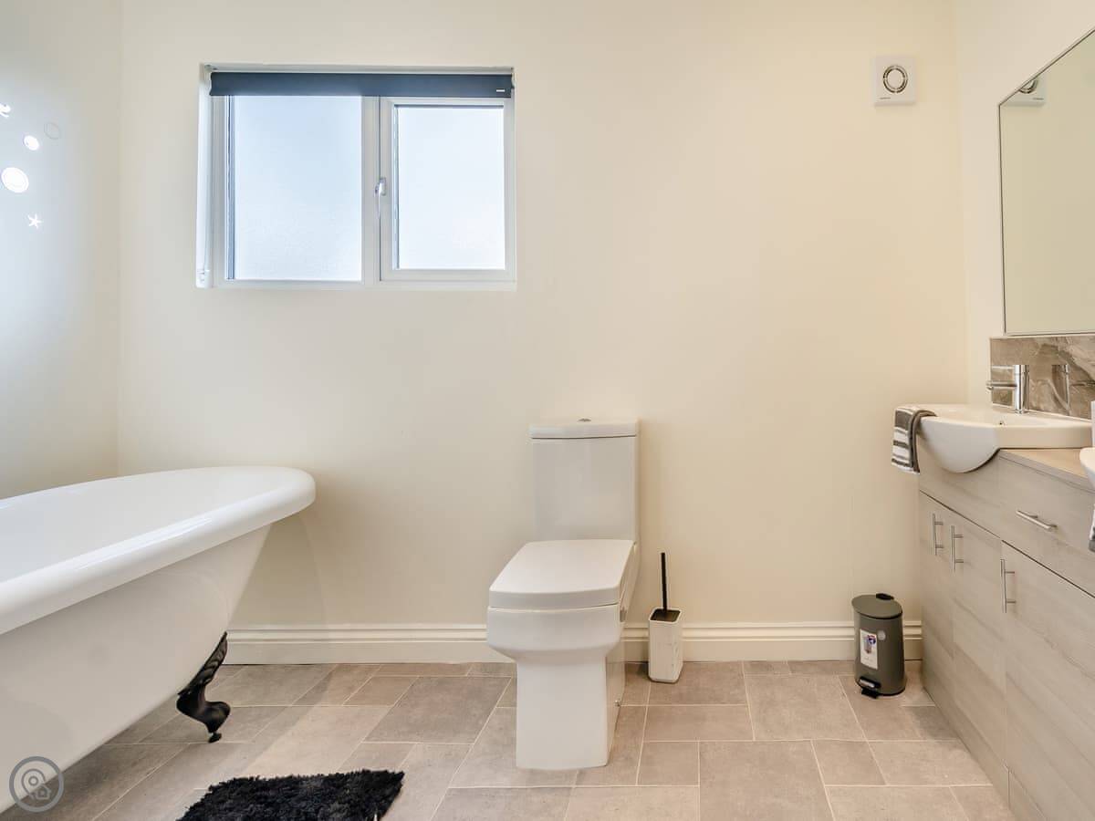 It sleeps four. Two bedrooms, both doubles. One has its own shower room, the other uses the main bathroom. That bathroom has a big freestanding bath. The place has a 5 Star rating, so it's well kitted out.