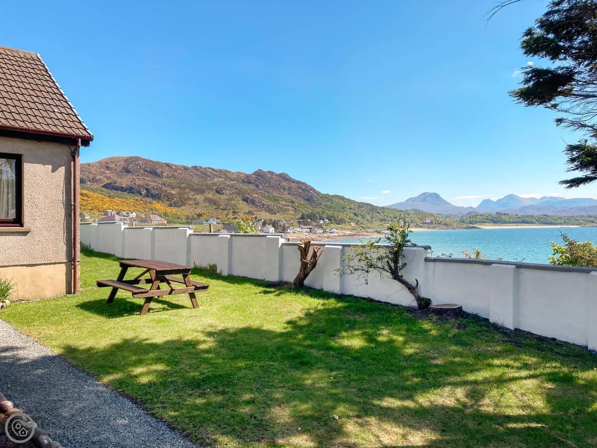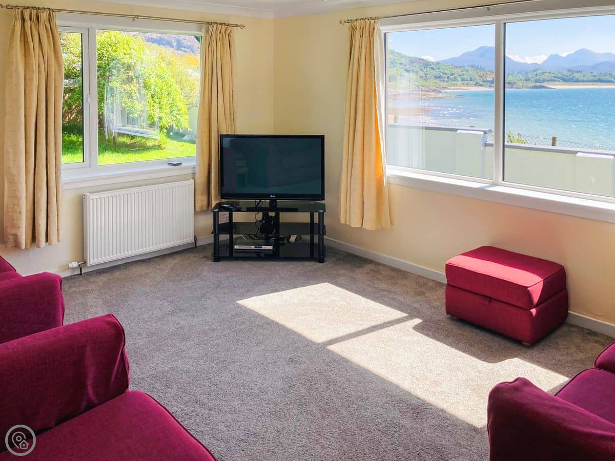 The main point is the view. The front looks out over Gairloch Bay toward the Torridon mountains. You can sit inside and just watch the weather change over the water.