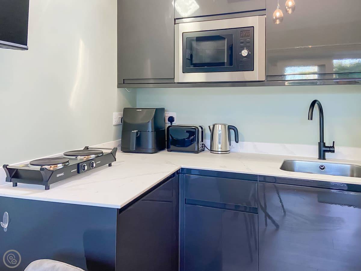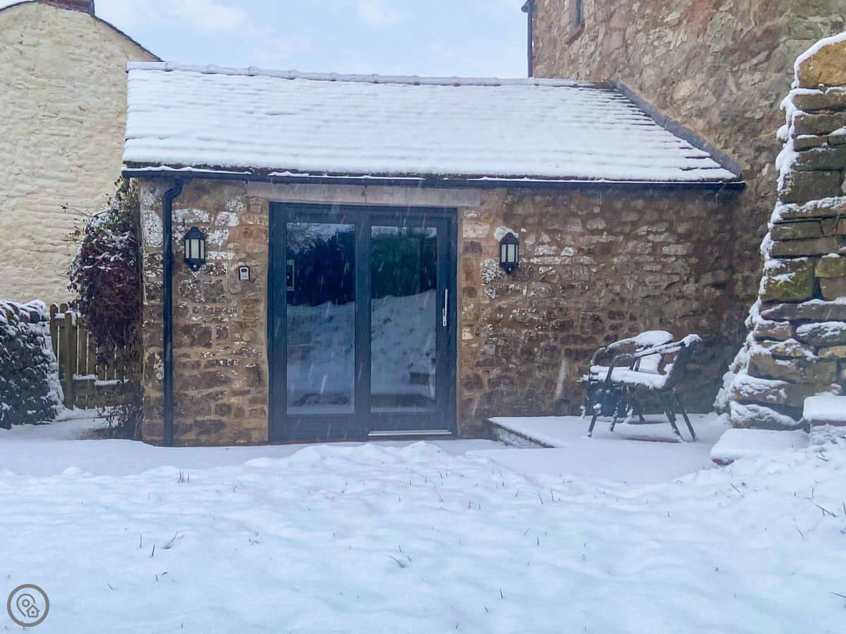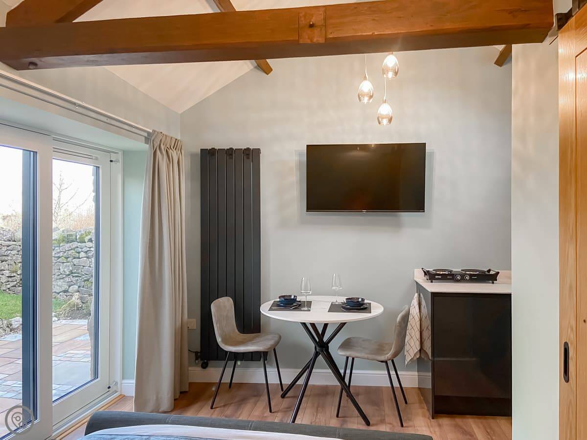 The Studio is in Stainton, near Penrith. It's a small, converted barn that sleeps two. One open-plan room with a double bed, a kitchenette, and a dining area. There's a separate shower room.