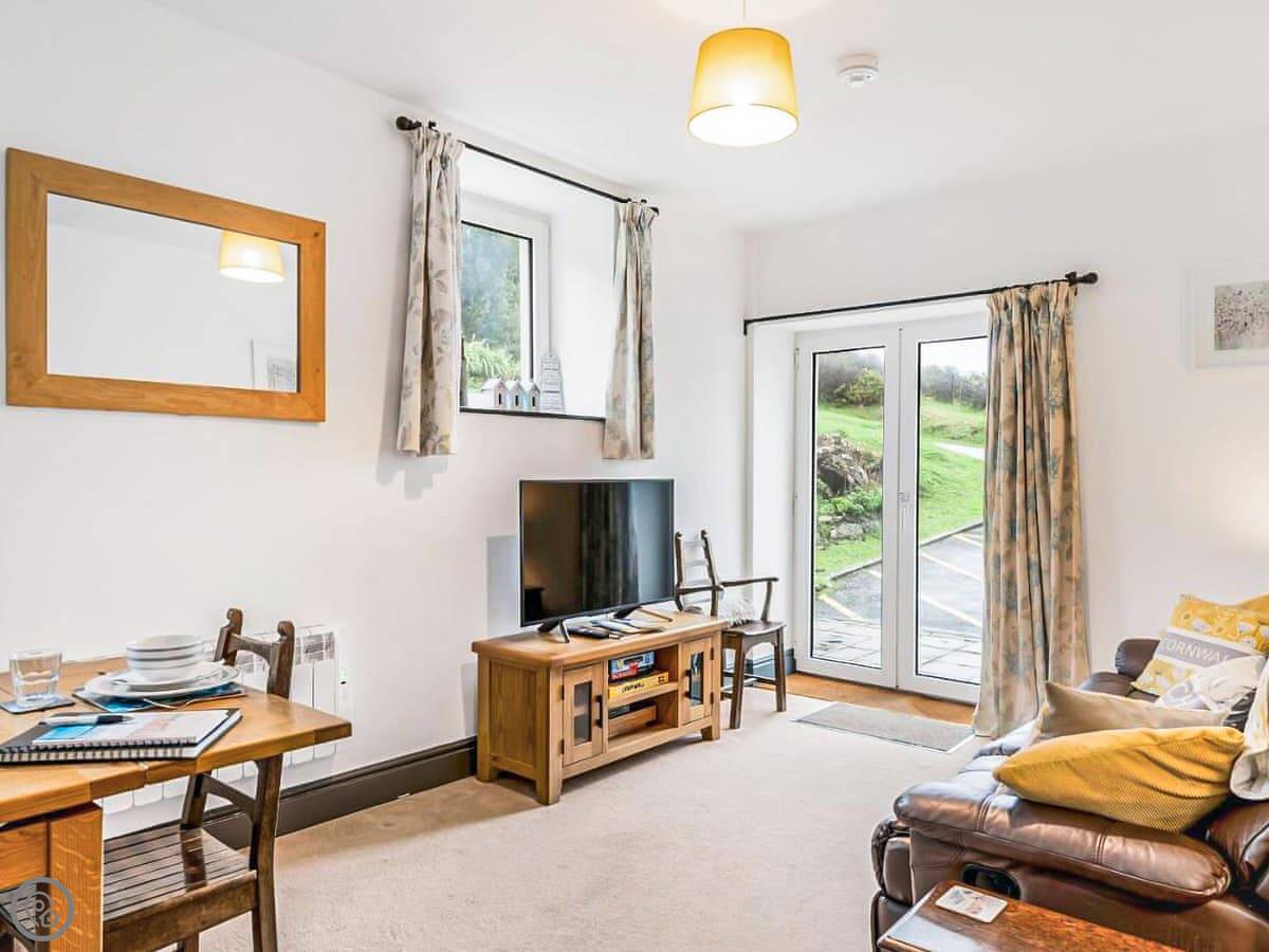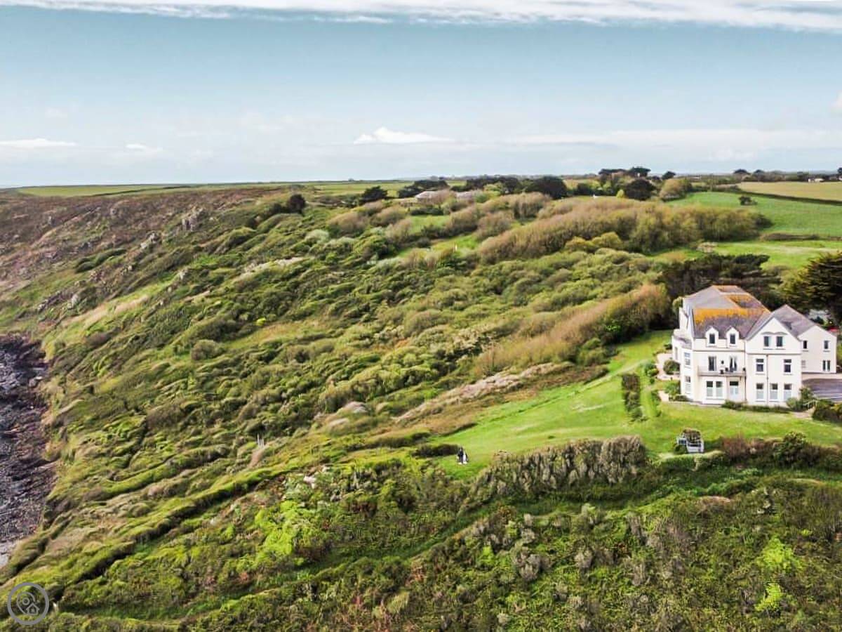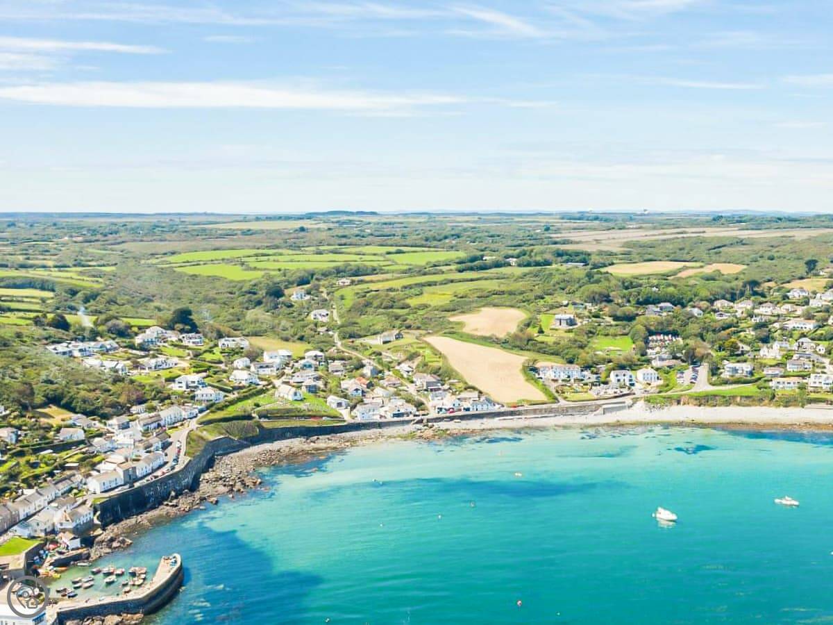 You have your own patio area with a picnic table. There are also communal grounds which you can use that look out over the fields to the sea. It's about a ten minute walk down a track to a quiet little beach called Meers Beach. The path into Coverack village itself is along the coast path and takes about twenty minutes on foot. Coverack has a small harbour, a shop, a pub, and a fish and chip shop.