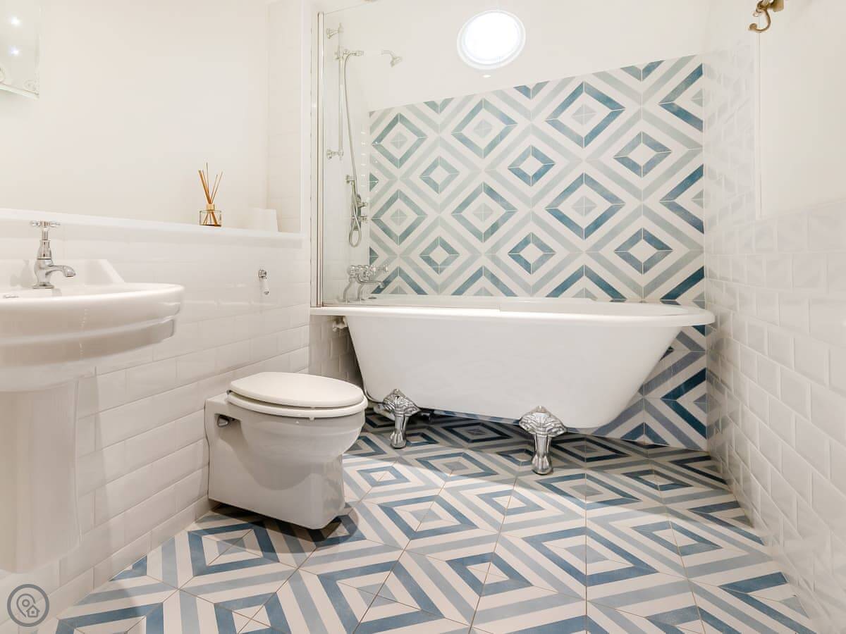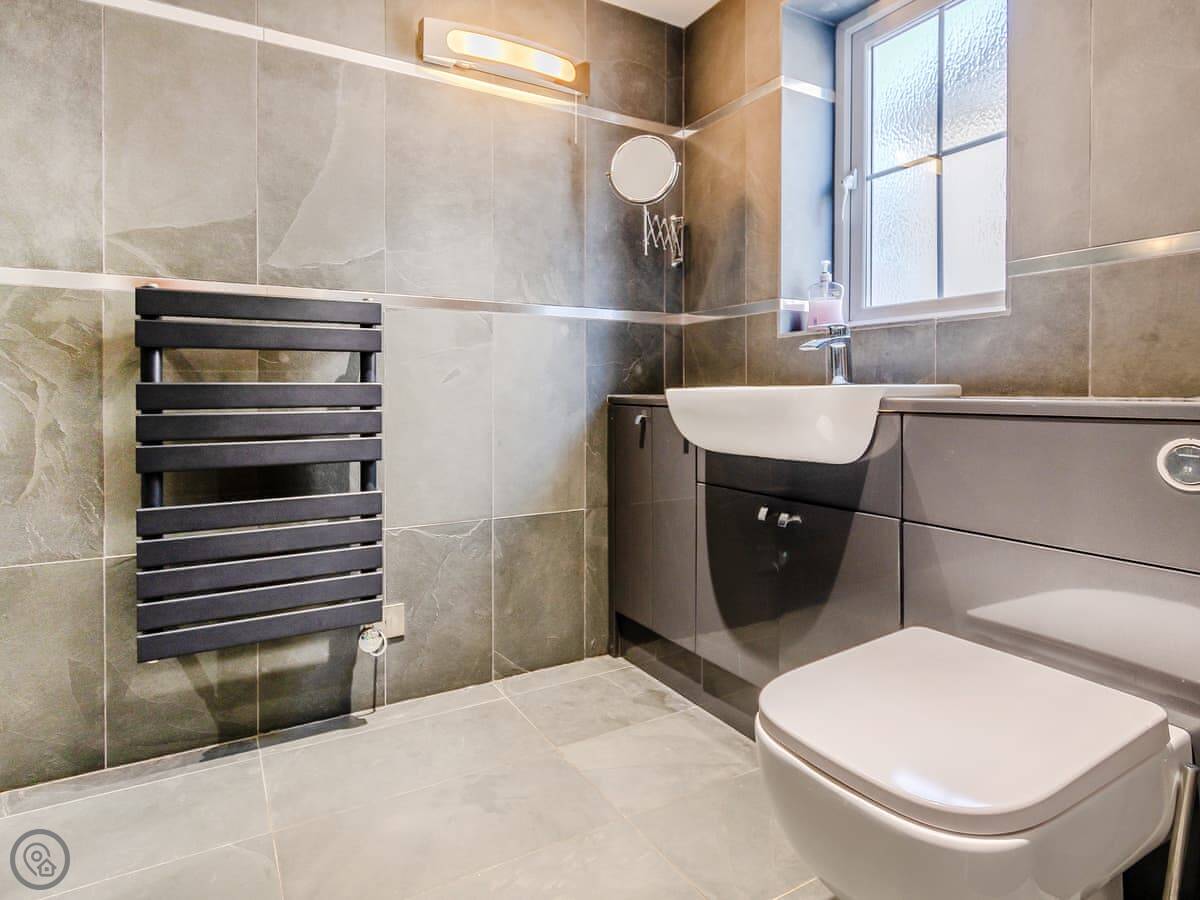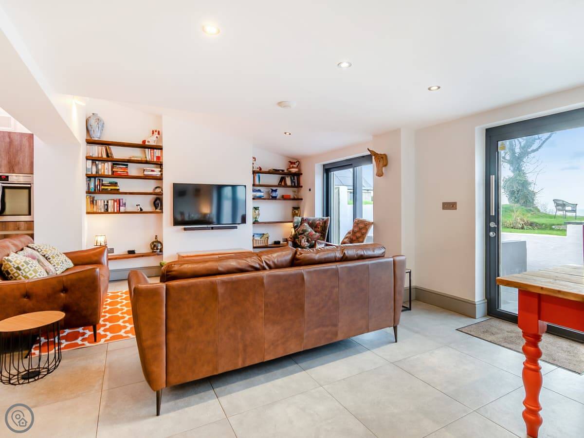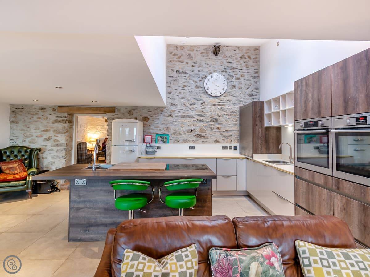 It sleeps eight people. Four bedrooms, three bathrooms. It's a 5 Star property, which means it's got things like underfloor heating. It's comfortable. There's a wood burner in a smaller snug room. The kitchen is well equipped. There's a neon sign that says 'Cegin Mam', Welsh for 'Mum's kitchen'. The family has owned it for seventy years.
