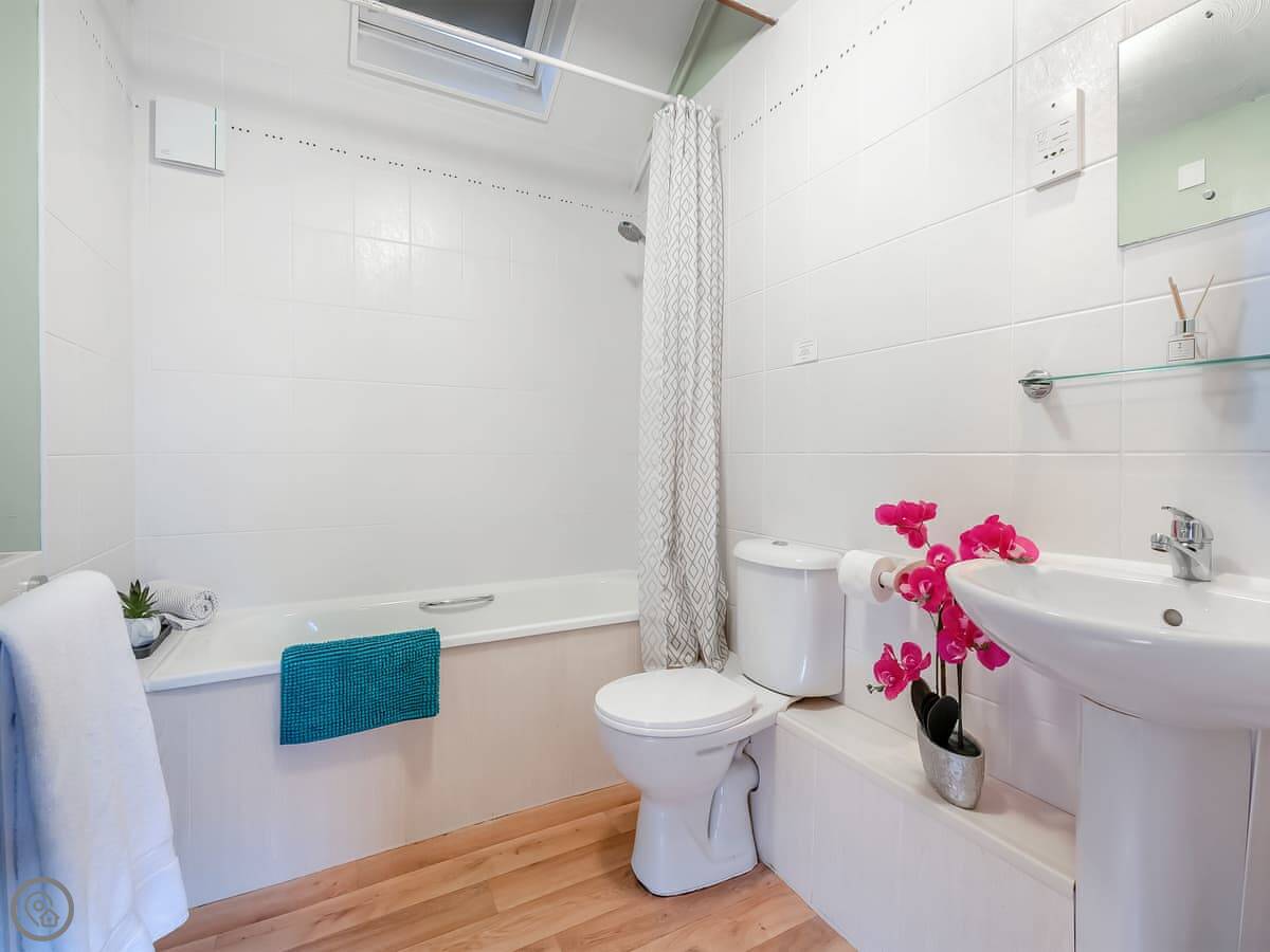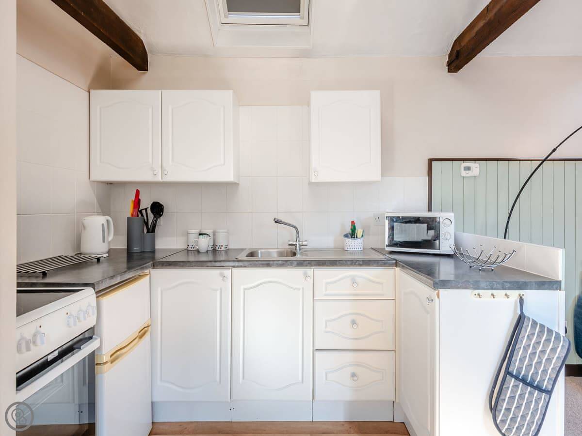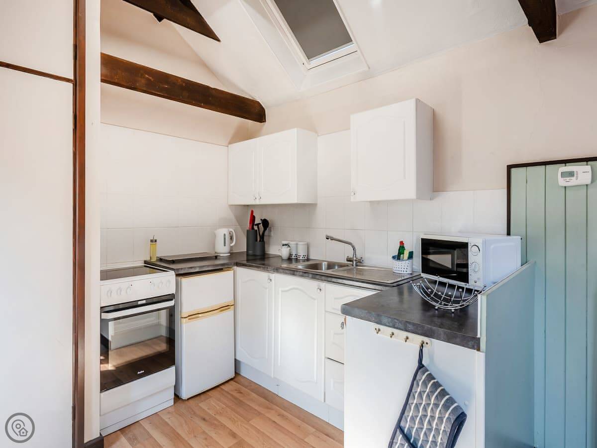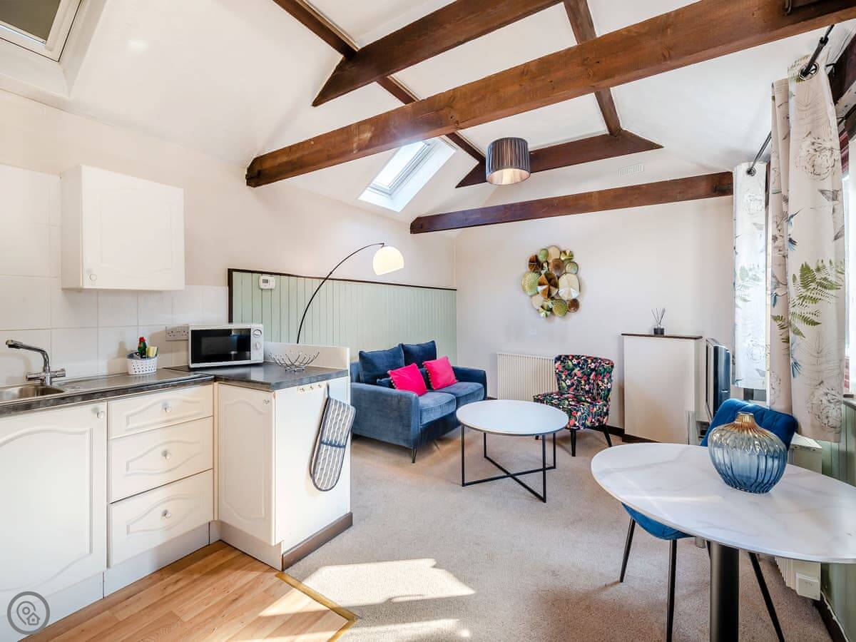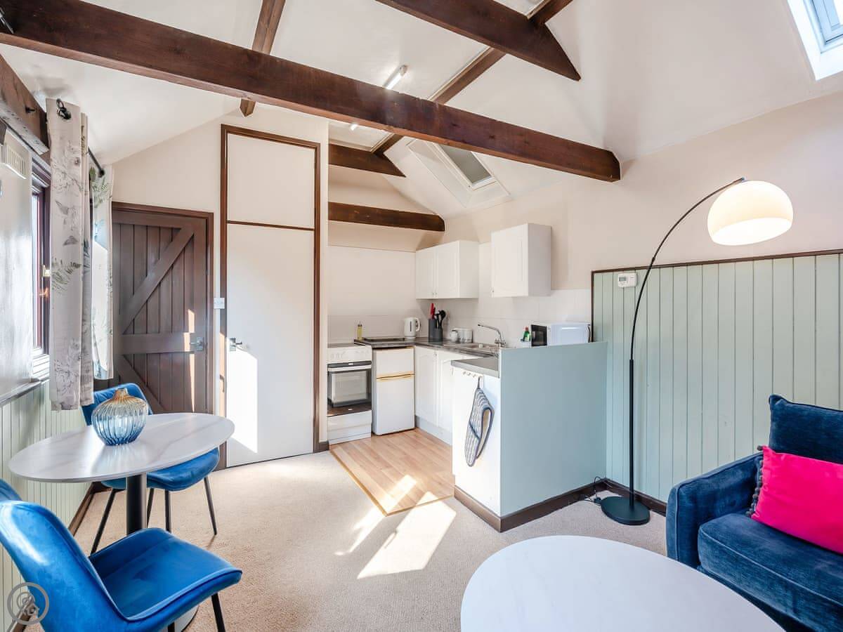 Inside, it's all open plan downstairs. Kitchen, dining area, and a sofa to sit on. The stairs up to the bedroom are quite steep, just so you know. There's a TV and WiFi. Bedding and towels are included.