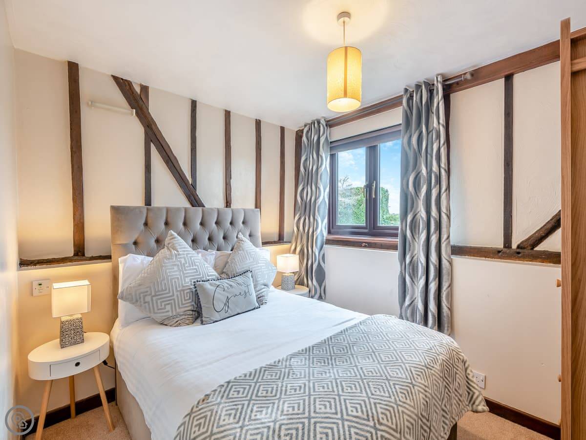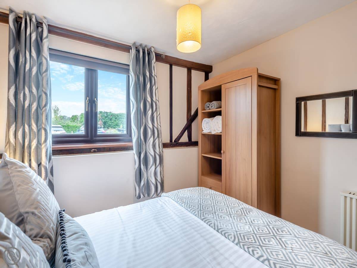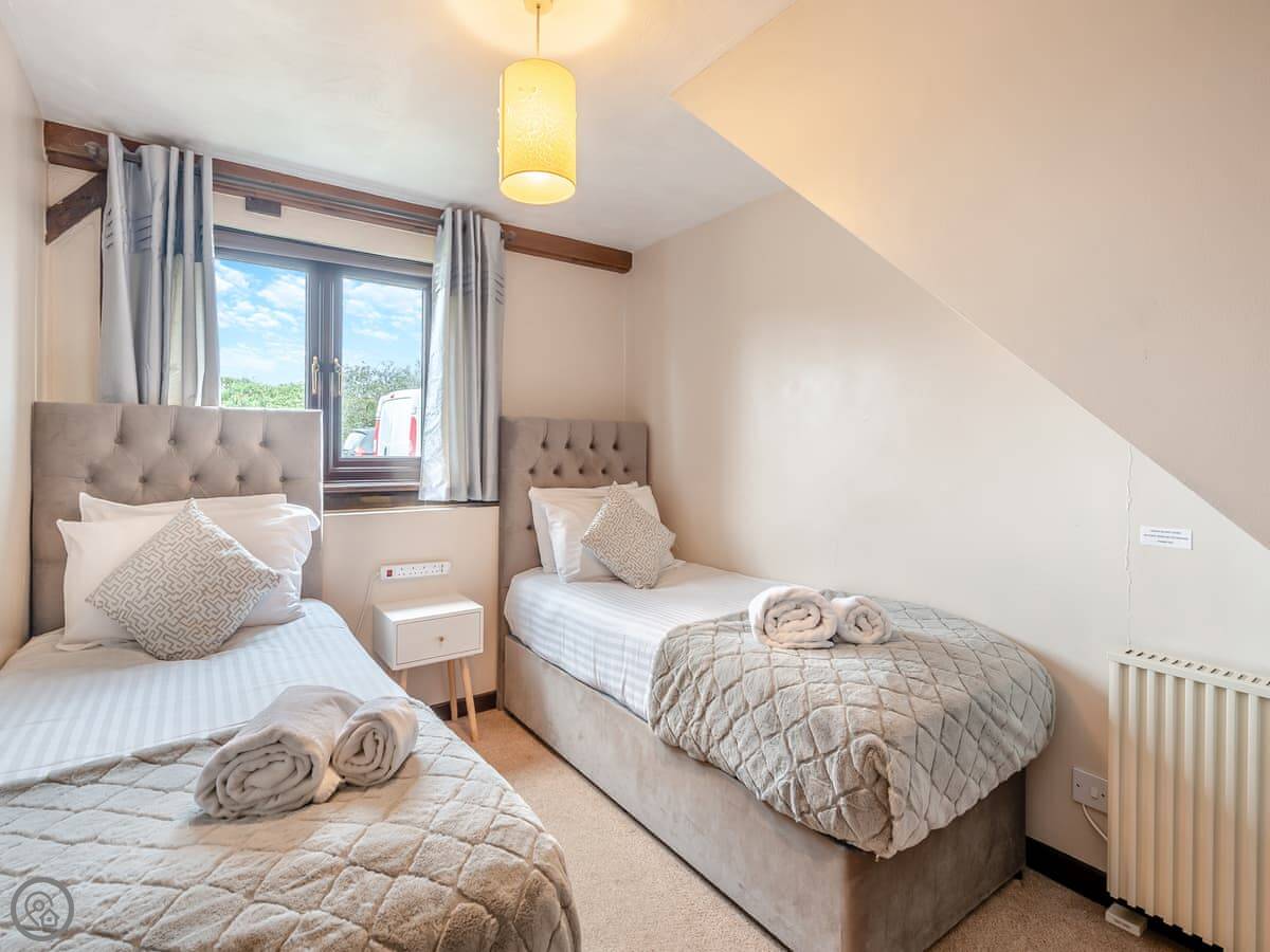 The barn sleeps four. Two bedrooms downstairs, both on the ground floor. One bathroom. There's one double room and one with twin beds. It's got a 4 Star rating. The living space is all upstairs, open-plan. It looks out over countryside.