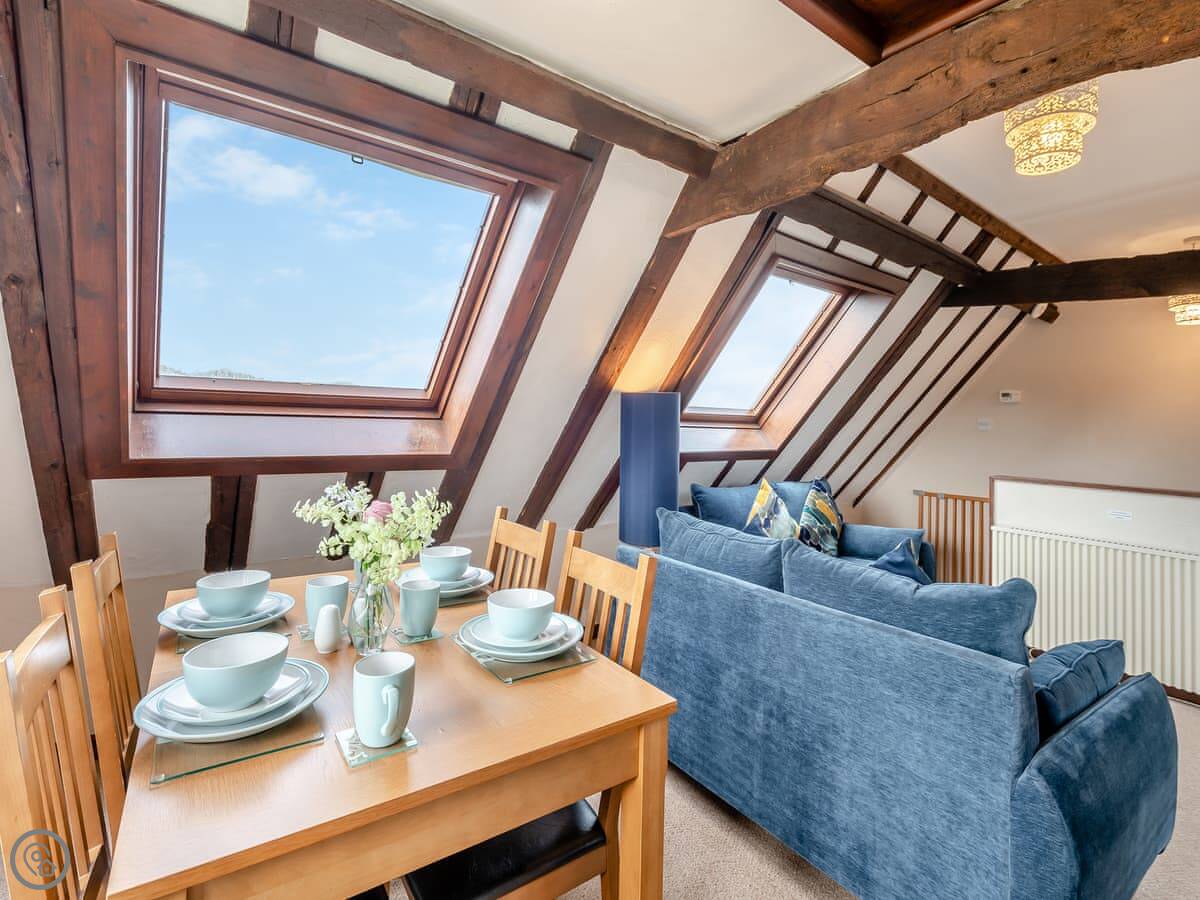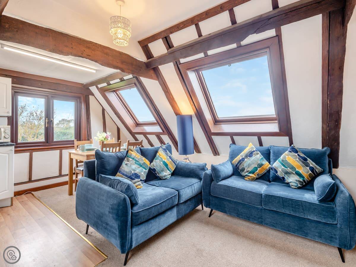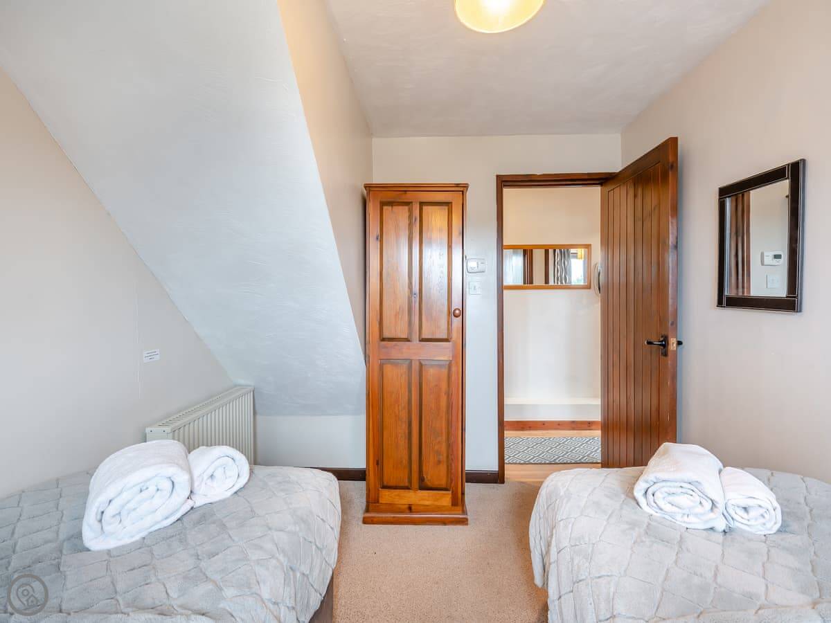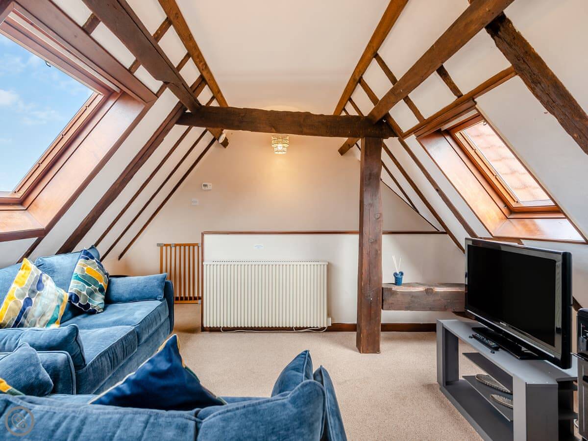 The barn sleeps four. Two bedrooms downstairs, both on the ground floor. One bathroom. There's one double room and one with twin beds. It's got a 4 Star rating. The living space is all upstairs, open-plan. It looks out over countryside.
