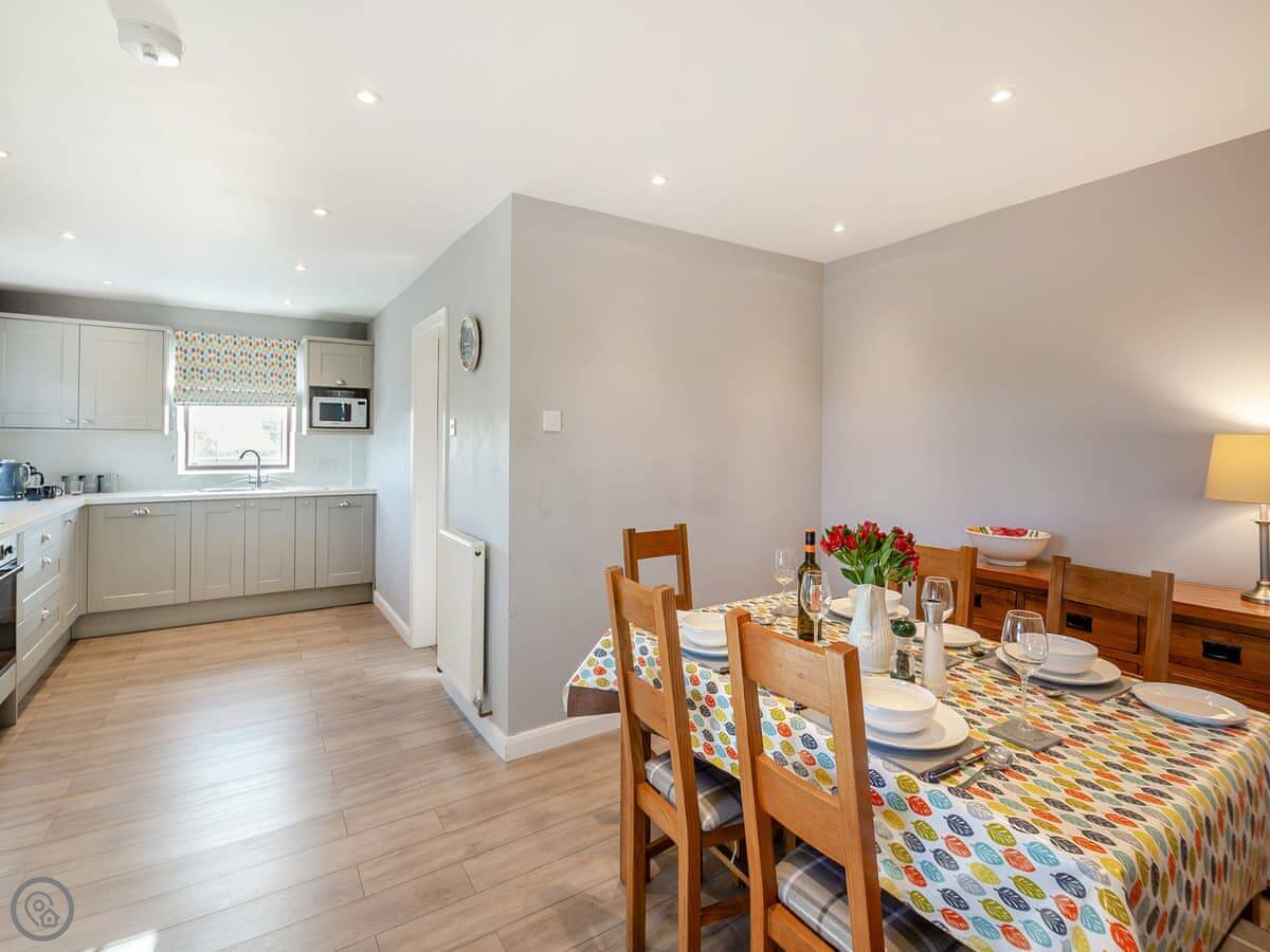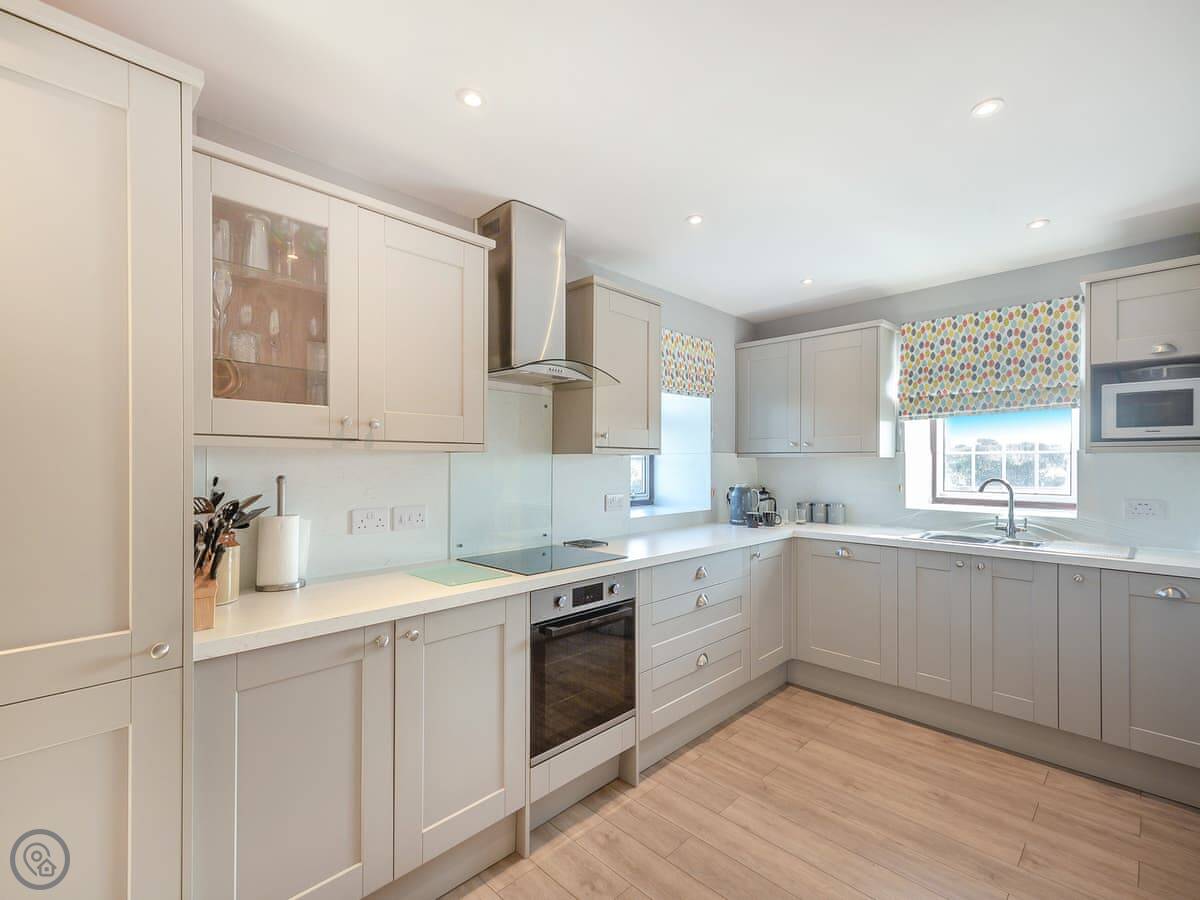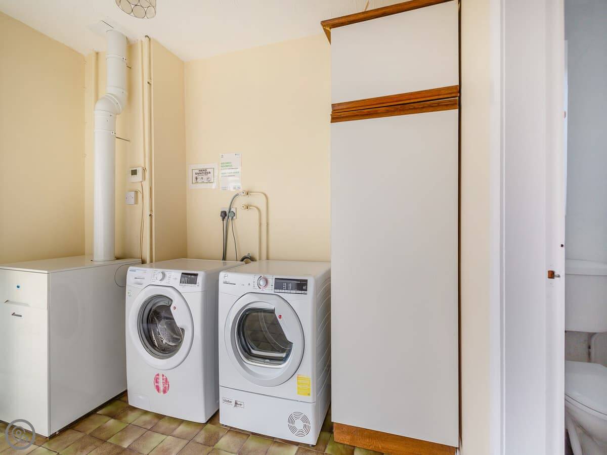 The kitchen has a dishwasher and a washing machine. Bedding and towels are included. There's a cot and highchair if you need them. You can park right there, and there's an electric vehicle charger.