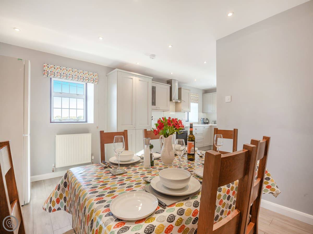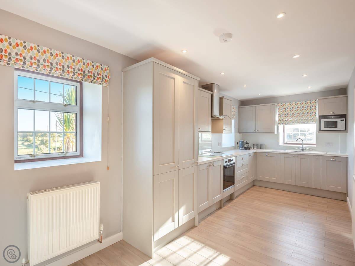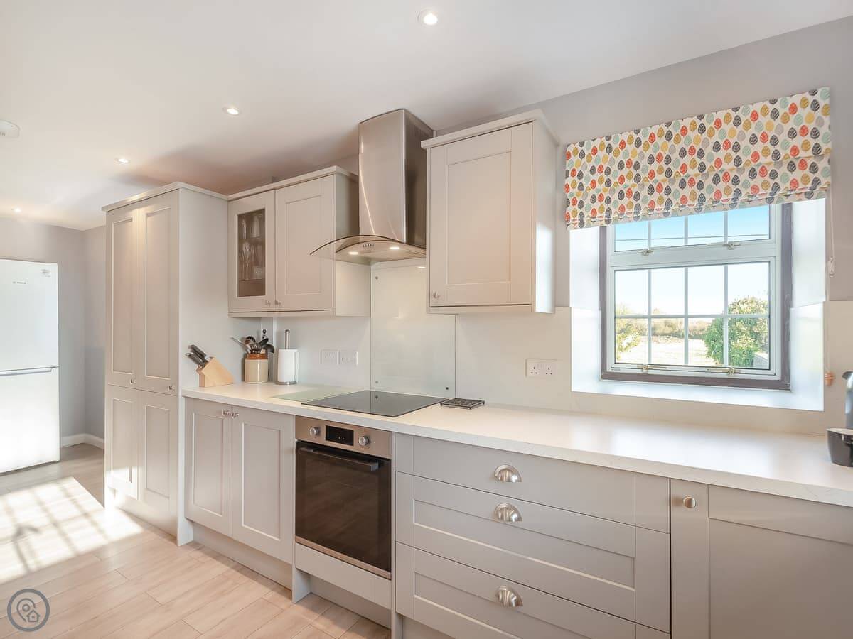 The kitchen has a dishwasher and a washing machine. Bedding and towels are included. There's a cot and highchair if you need them. You can park right there, and there's an electric vehicle charger.