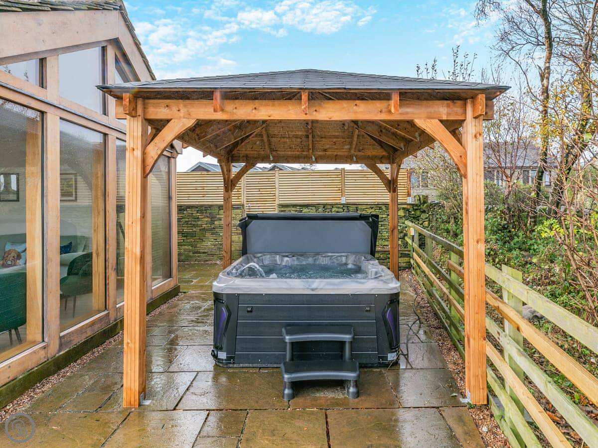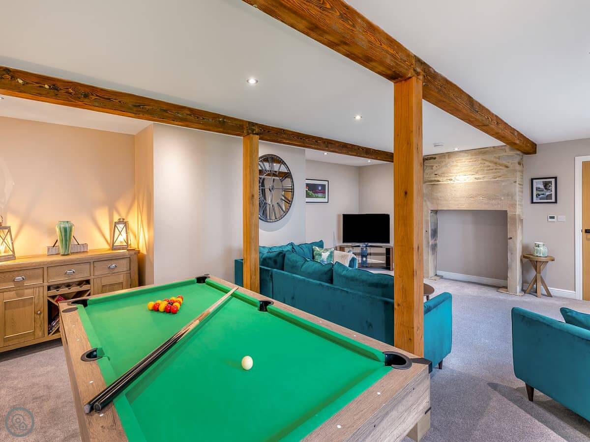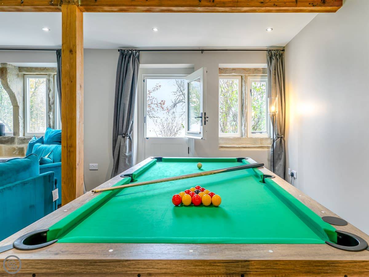 It's got an open plan kitchen and dining area that leads into a sunroom with beams. The living room has a pool table. The garden is enclosed. There's a hot tub outside.