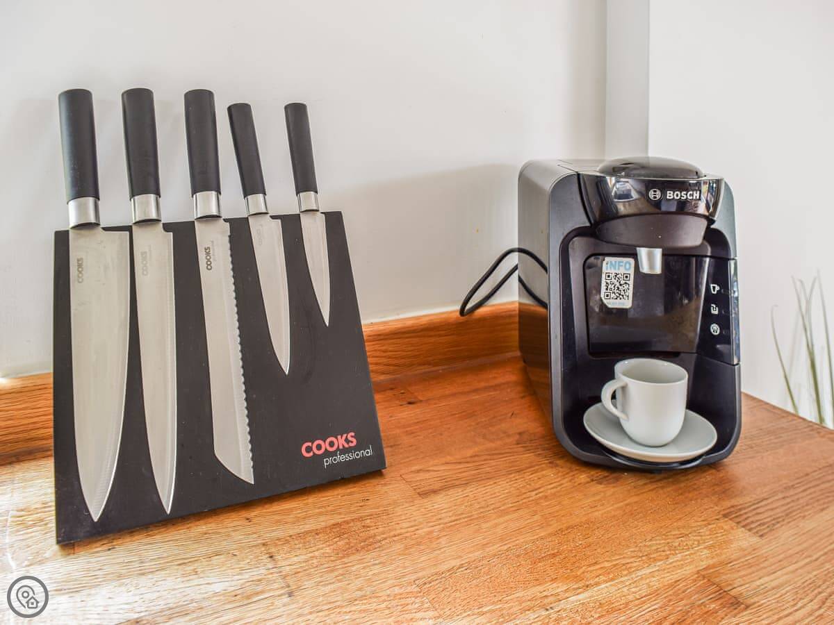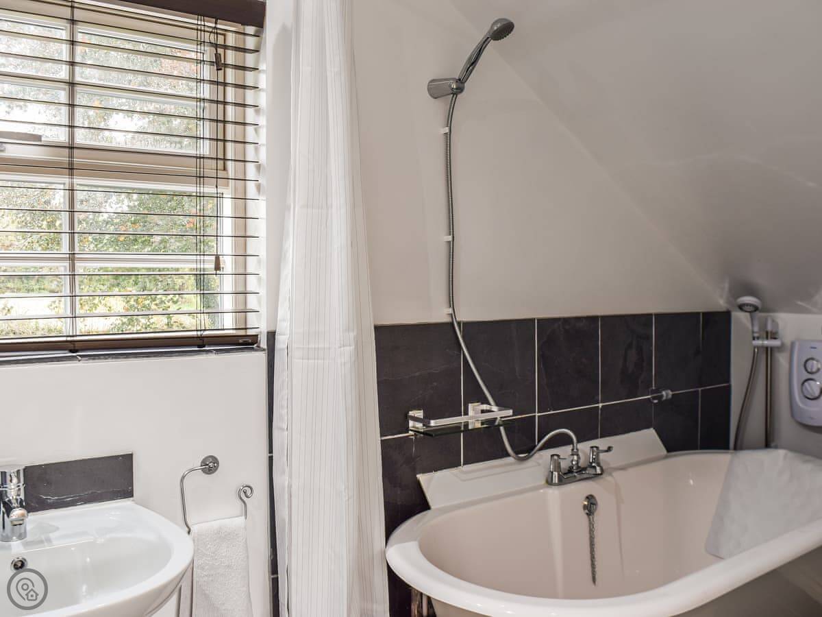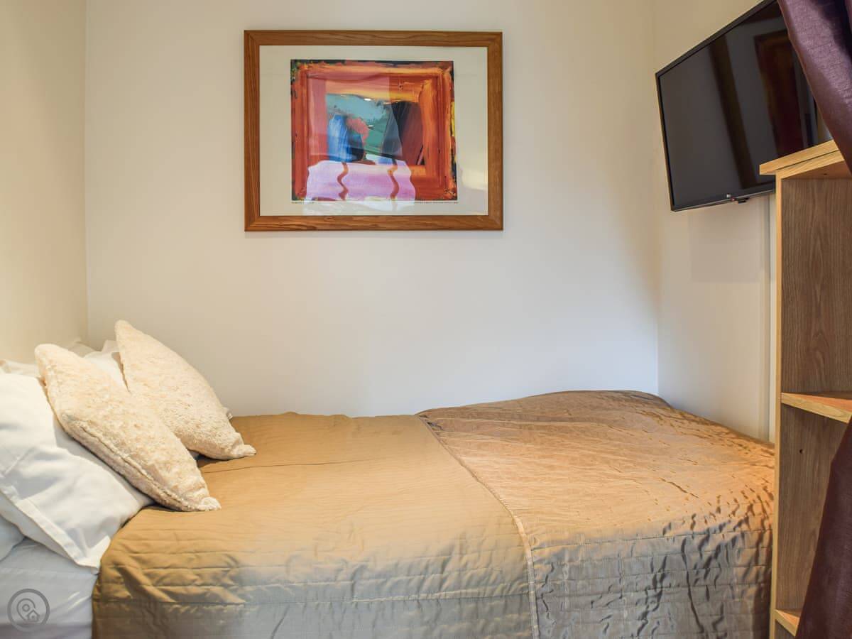 It sleeps two, but there are two bedrooms. The main bedroom is upstairs, with a king bed and a single. It has its own ensuite shower room. Downstairs, off the living room, there's a second bedroom with a double bed. It's quite small and cosy, and it has a curtain instead of a door. There's no bathroom down there, so you'd use the one upstairs.
