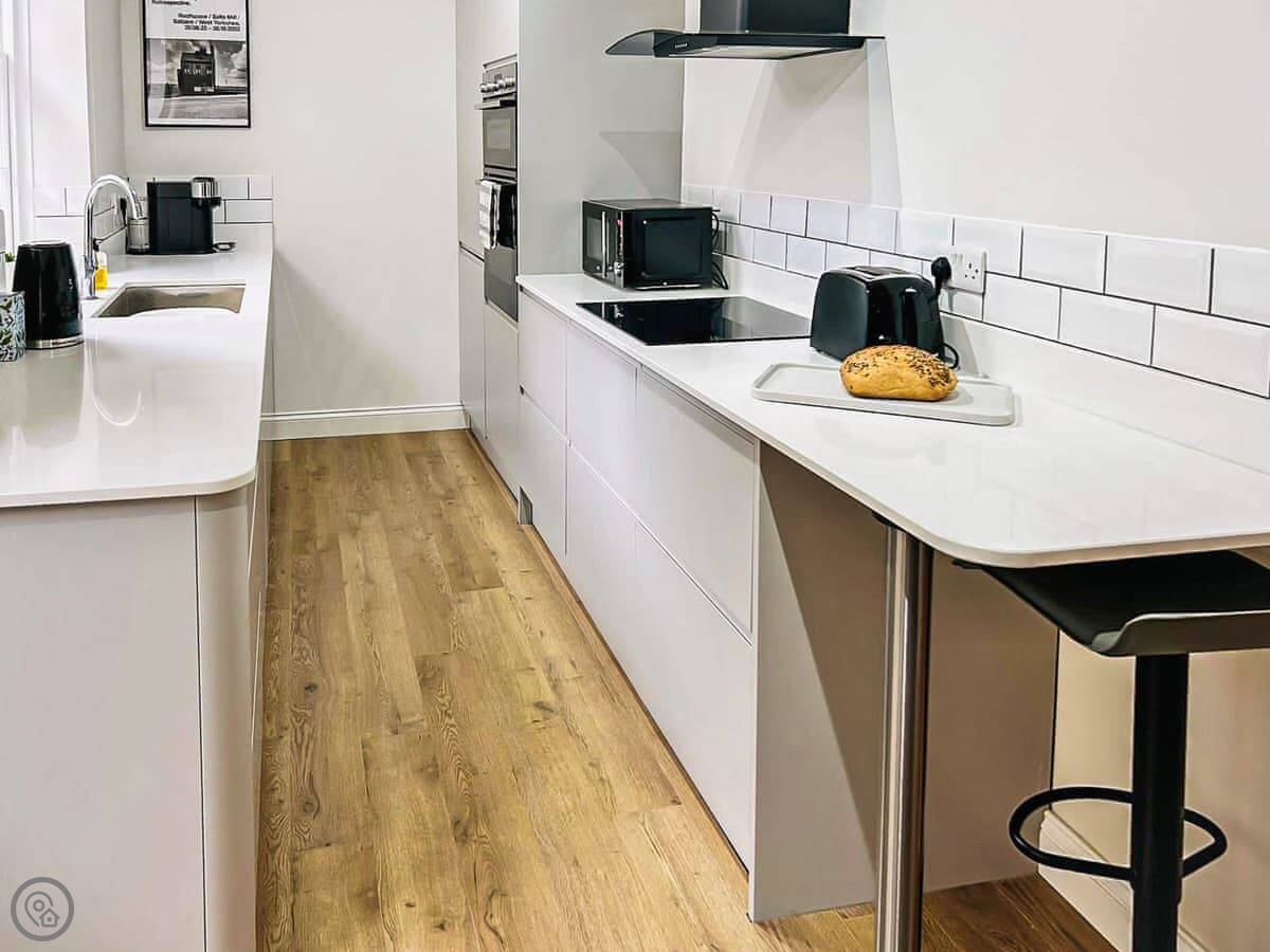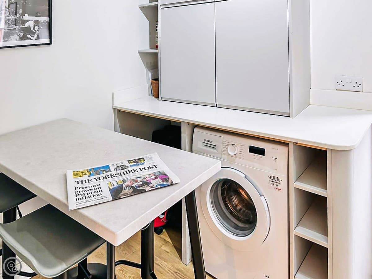 The living room's a good size. There's a Smart TV. The kitchen's been done up recently and has everything you'd expect, including a dishwasher and washing machine. Outside the back is a small yard with a table and chairs.