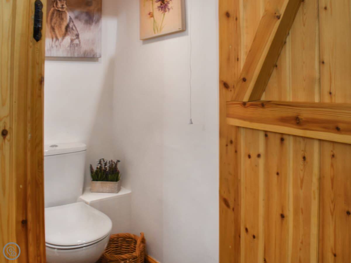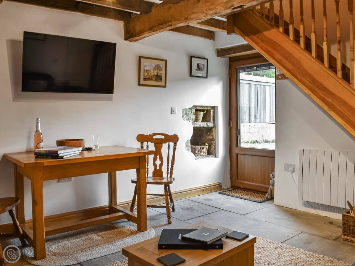 Downstairs is one open room with the kitchen, dining area, and a sofa. The dining table is a nice piece, made by one of the early apprentices of Robert Thompson, the Mouseman. It's got a foxtail carved on the leg. The kitchen has what you need. There's a Smart TV and wifi.