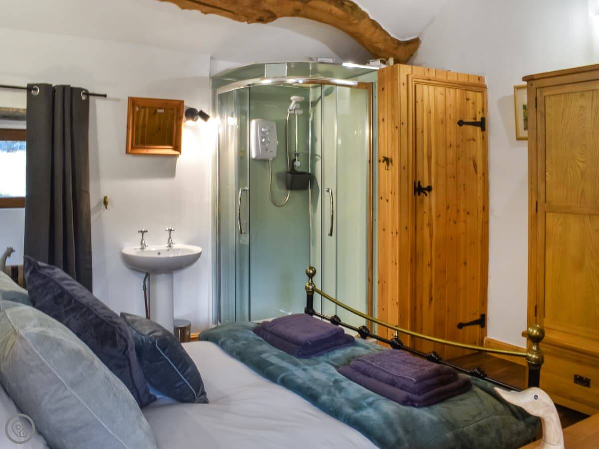 Upstairs is the bedroom. It's got the original beams and a double bed. The shower and sink are in the corner of the bedroom itself. The toilet is separate, in its own little room. It's a bit of an unusual setup but it works fine. The stairs are a typical cottage staircase.