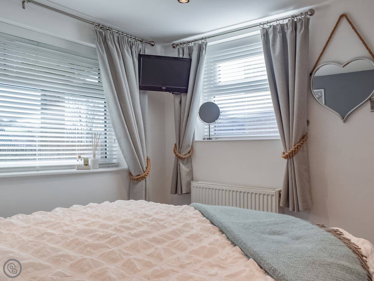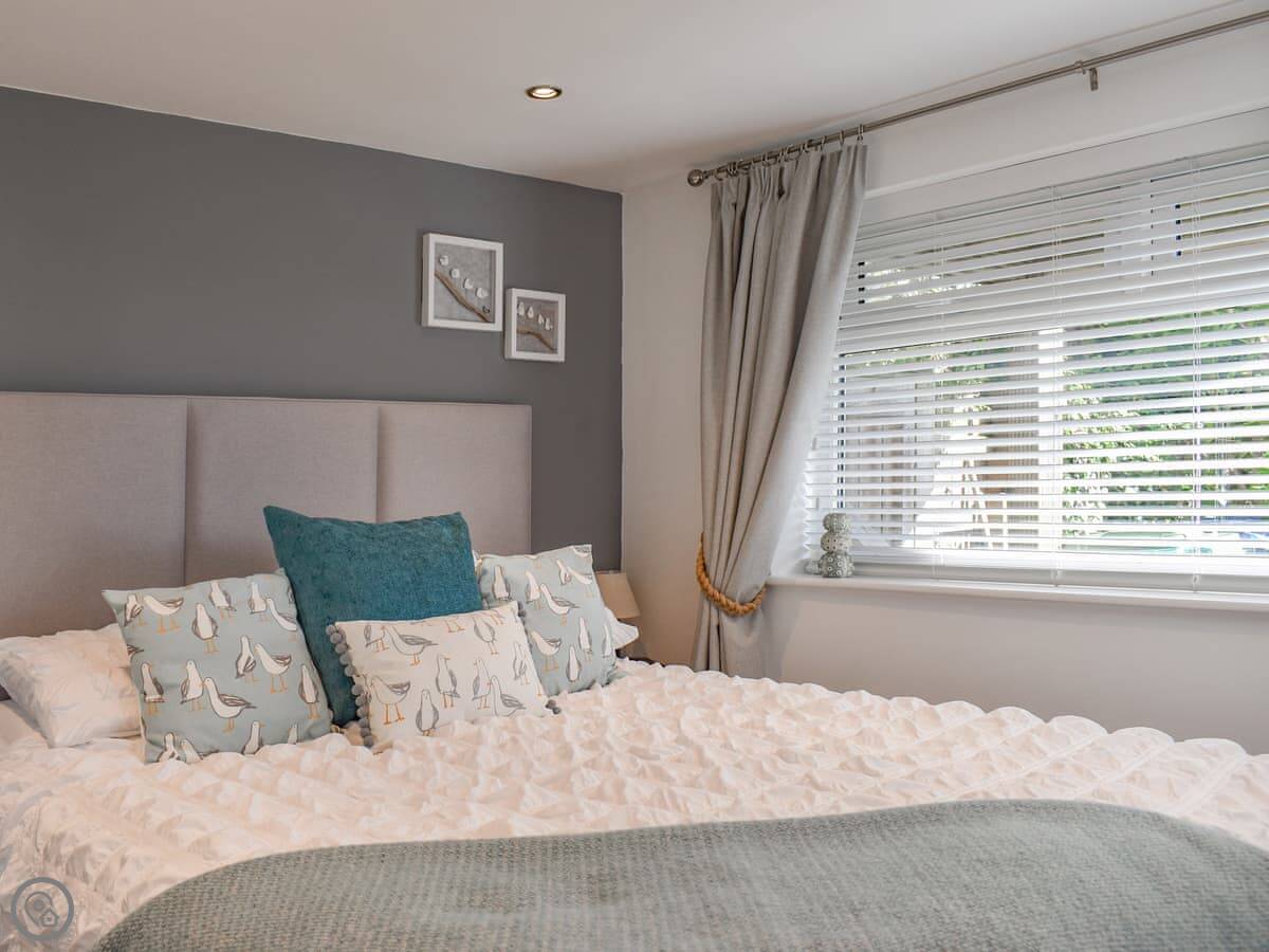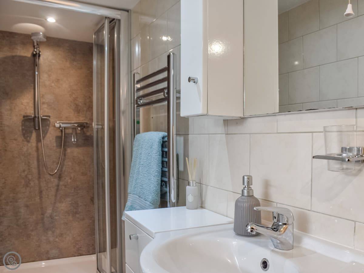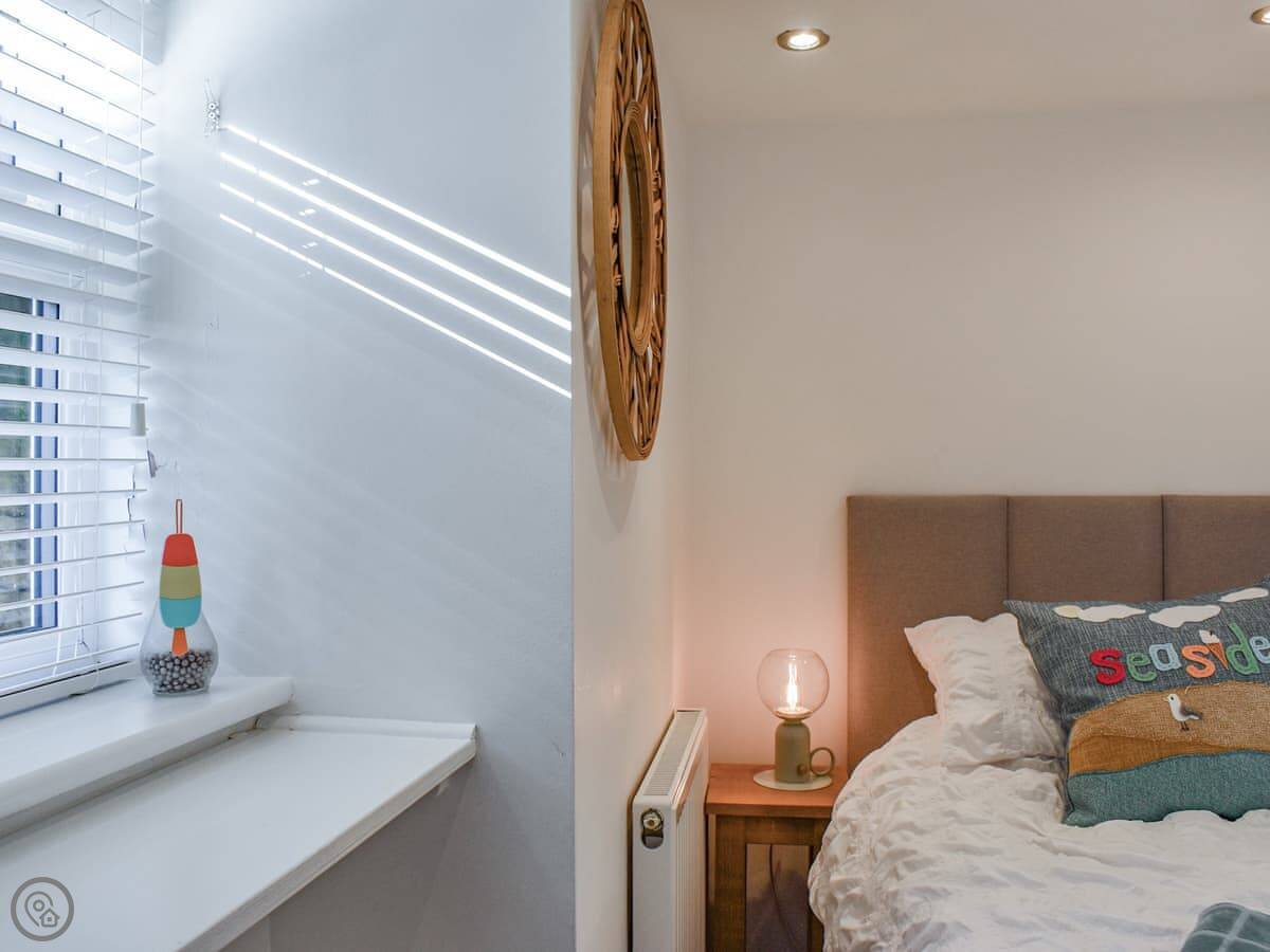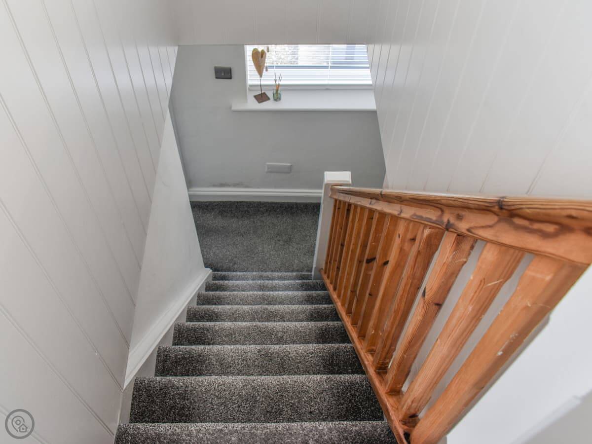 It sleeps three. Two bedrooms downstairs, one double and one single. There's a shower room on that floor too. The stairs inside are the cottage kind. They're steep and a bit narrow, so you need to be careful on them.