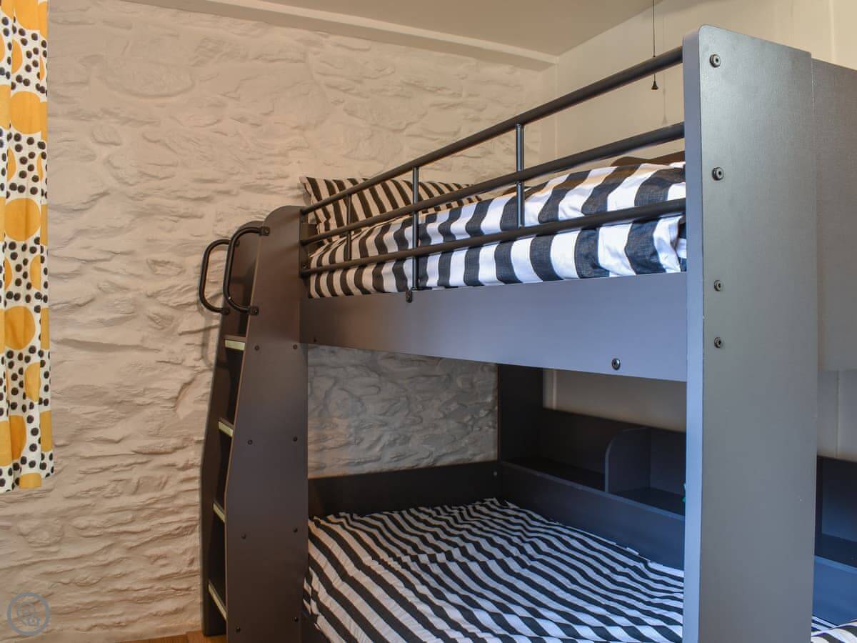 One bedroom has a king size bed and stone walls. The other has bunk beds, which are fine for kids but might be tight for two adults. The bathroom has a decent shower.
