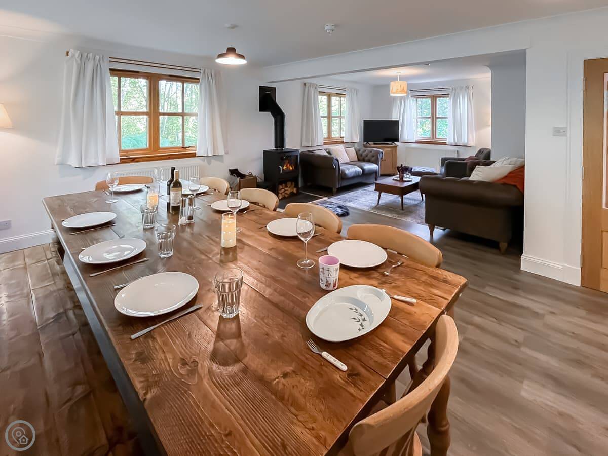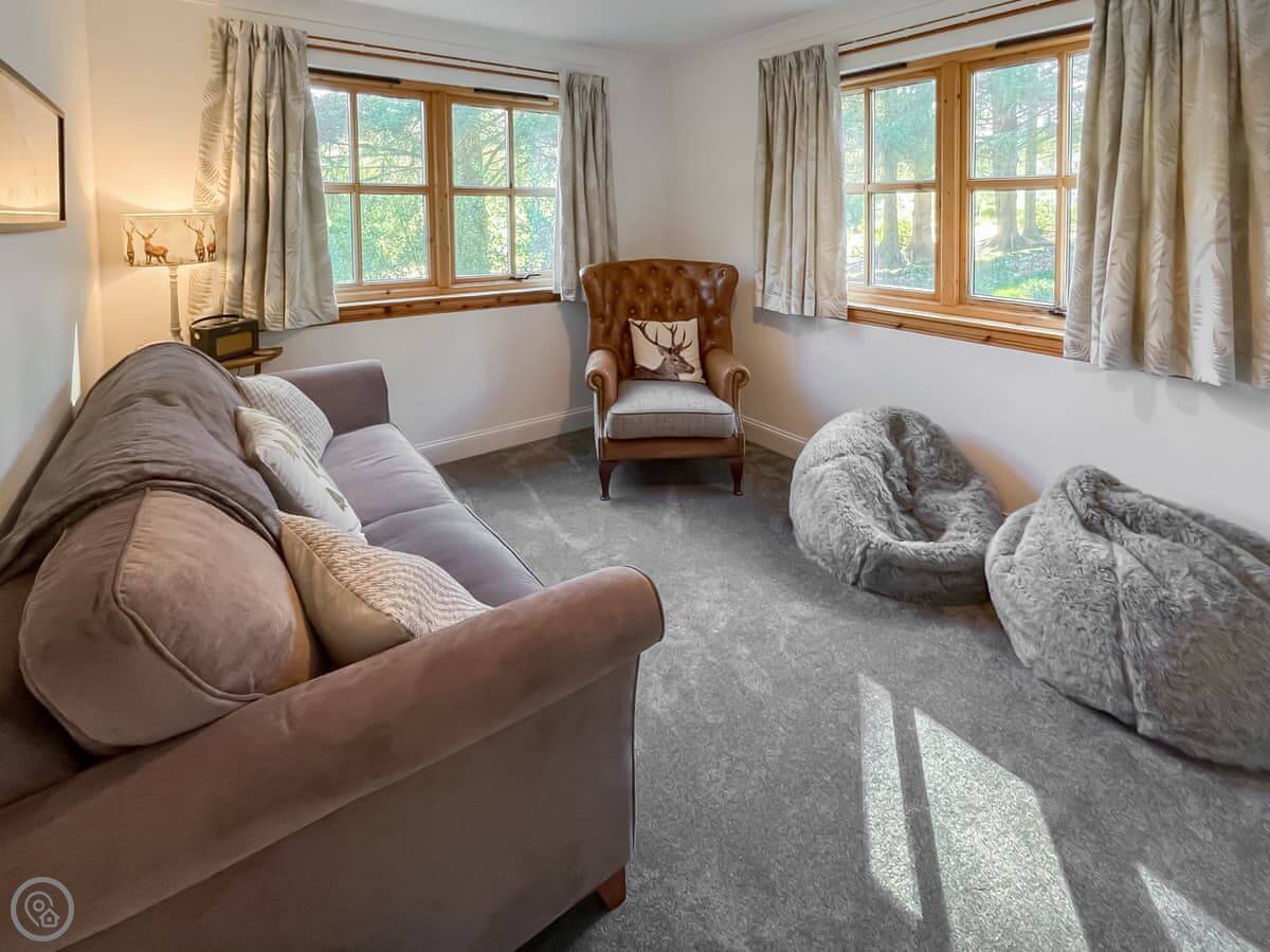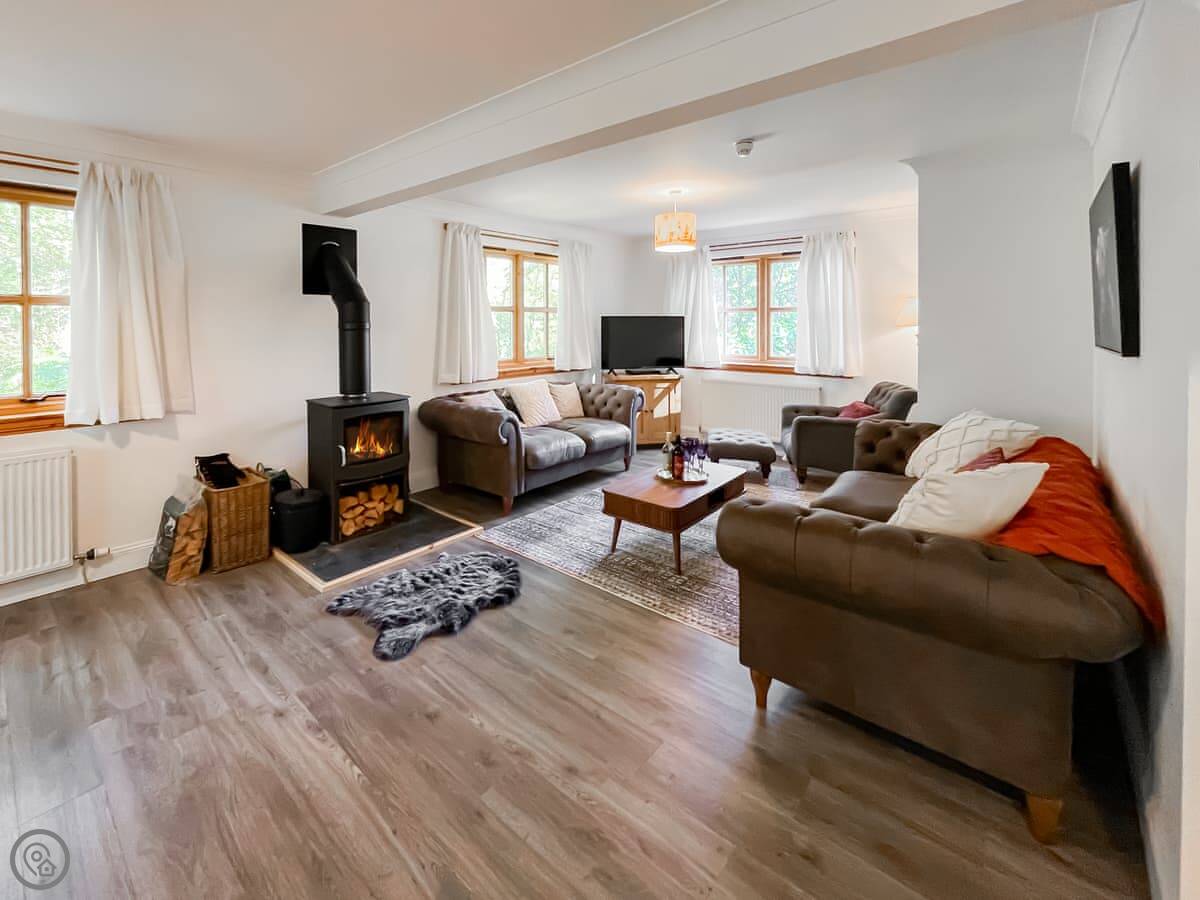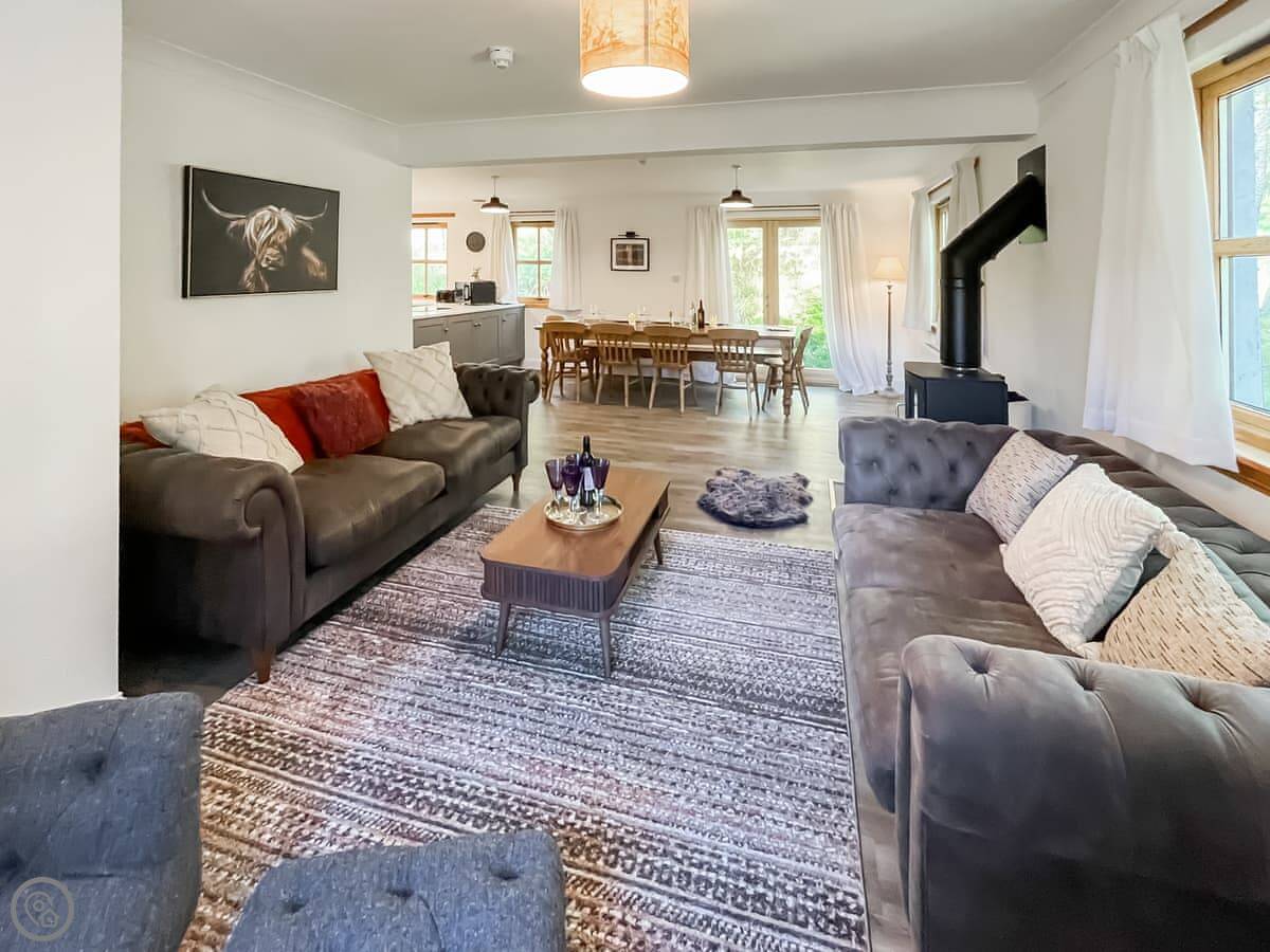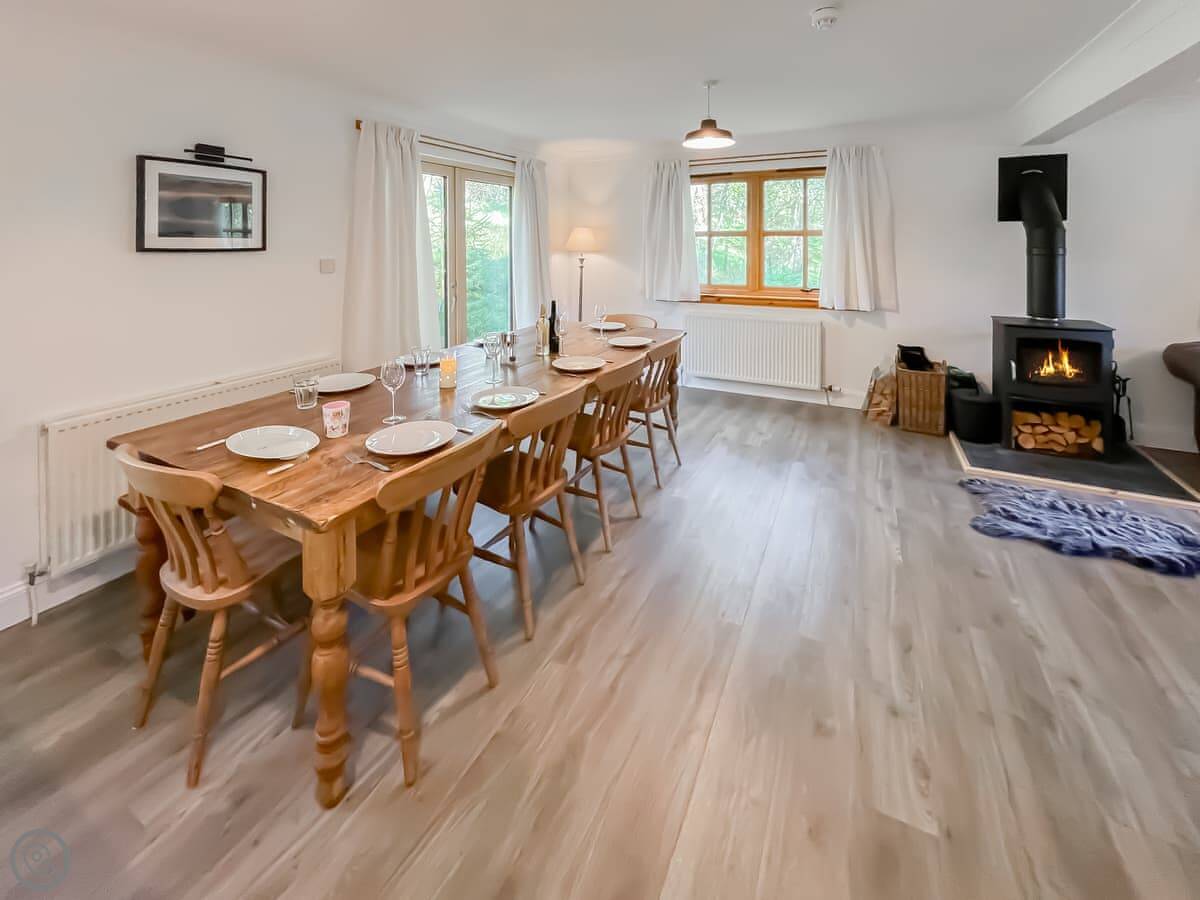 There’s a big open plan living, kitchen and dining area with patio doors out the back. There’s a wood burner if you want it. It also has a snug room off the main living area with a TV, bean bags and some board games.