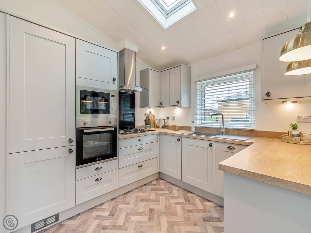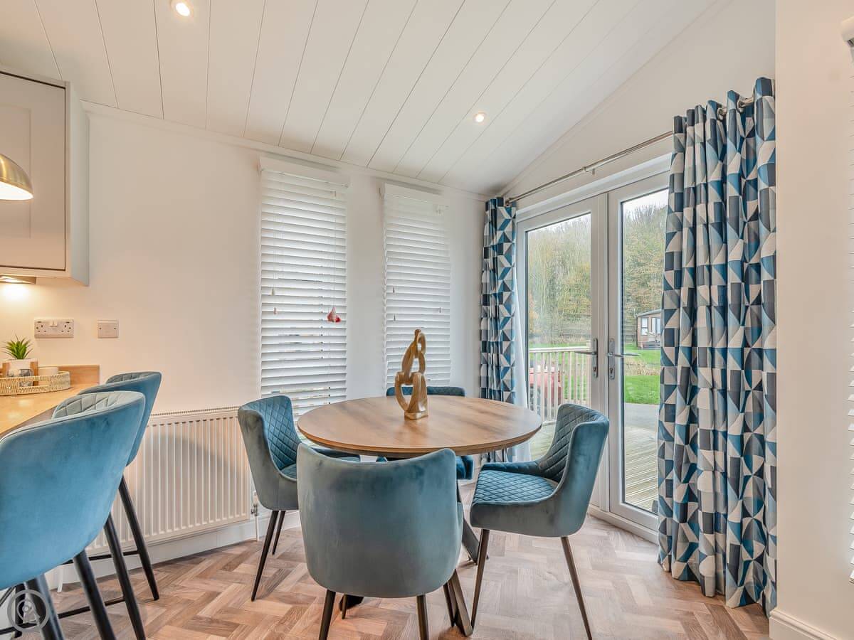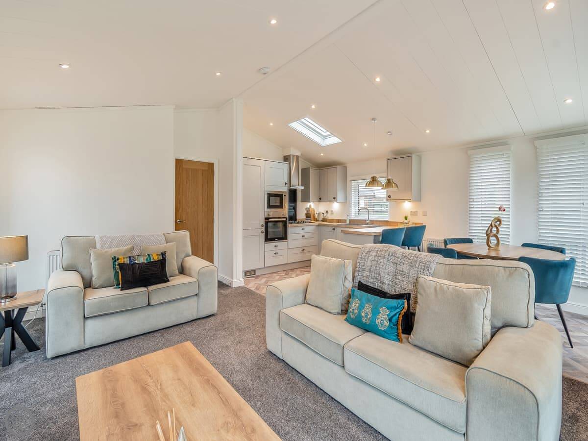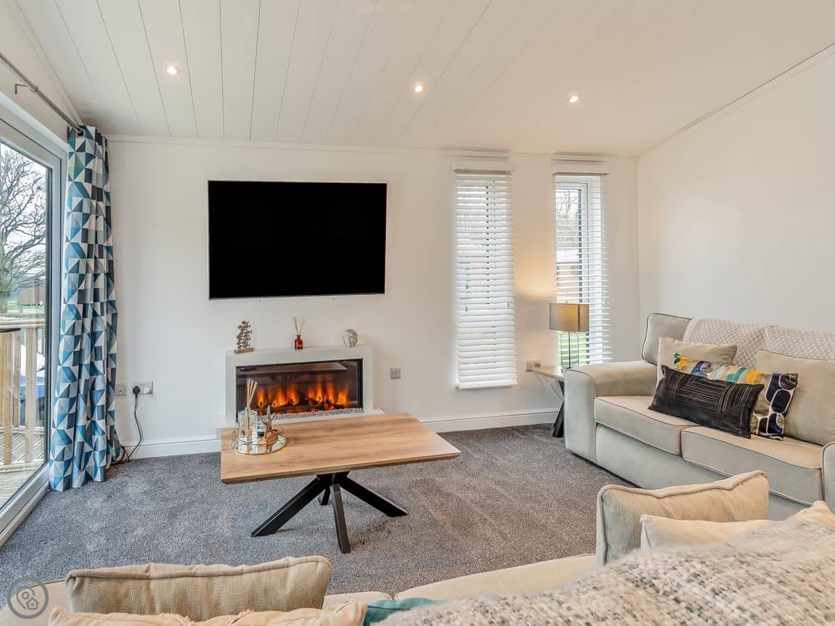 Inside it's open plan. Kitchen, dining area, and living space together. Big doors open out onto the deck. The sofas face the TV and an electric fire. It's got a 4 Star rating.