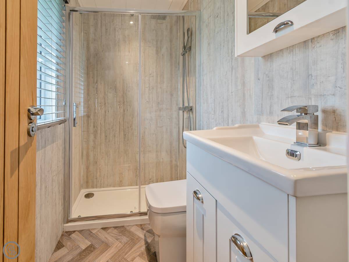It sleeps four. Two bedrooms. One has a king bed with an en-suite bathroom, which has a bath and a separate shower cubicle. The other room has two single beds. There's another shower room as well, so there are two bathrooms in total.