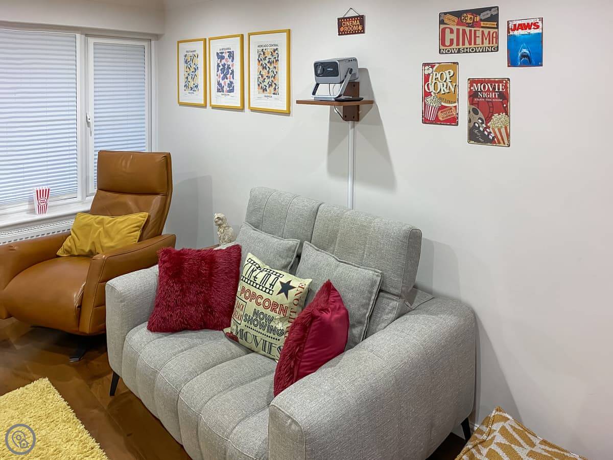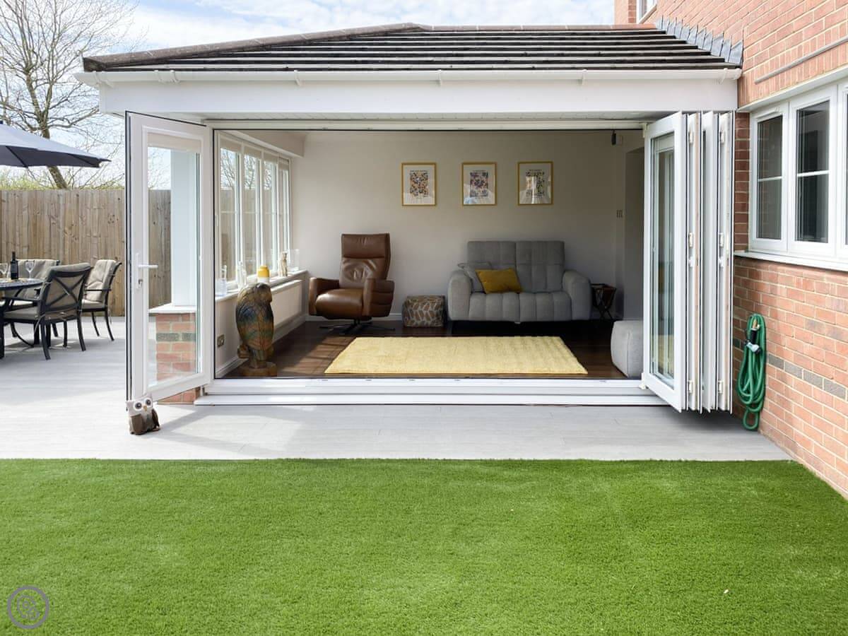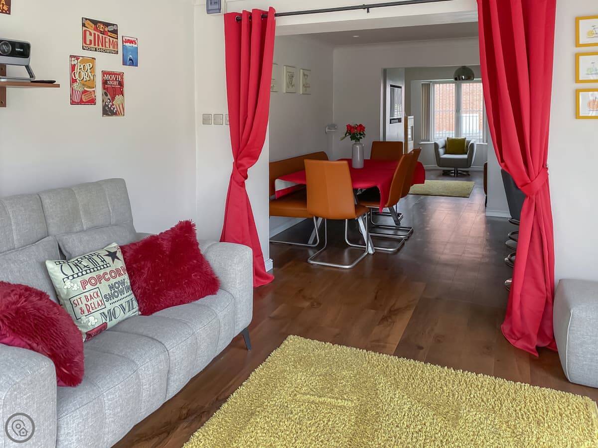 The main living area is open plan, with big doors out to the back garden. There's a second living room at the back with a projector screen, like a cinema room. The garage has been set up with an exercise bike and yoga mats. It's quite a practical house.