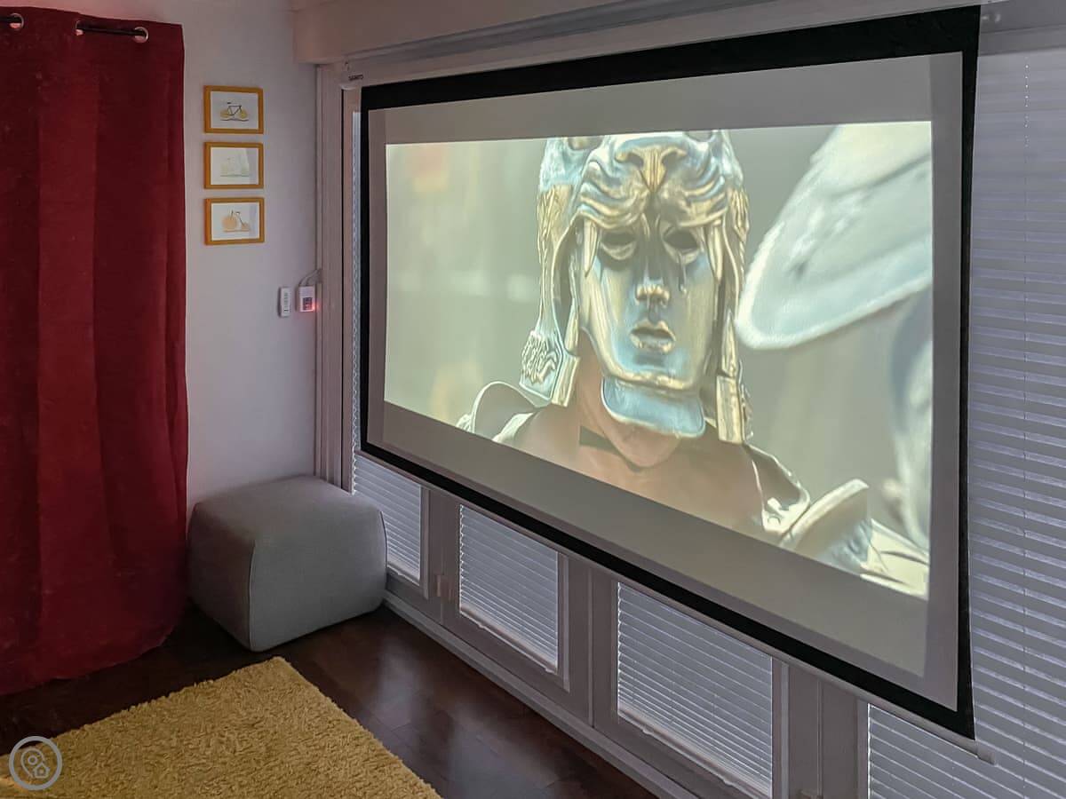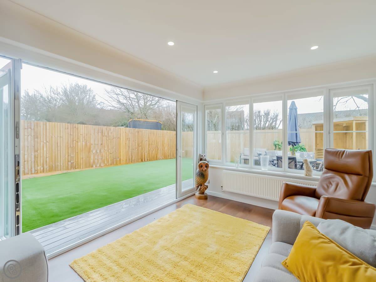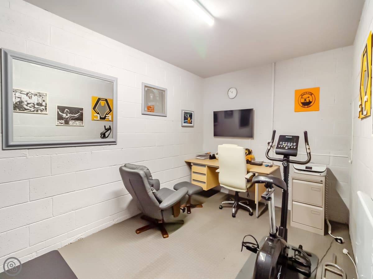 The main living area is open plan, with big doors out to the back garden. There's a second living room at the back with a projector screen, like a cinema room. The garage has been set up with an exercise bike and yoga mats. It's quite a practical house.