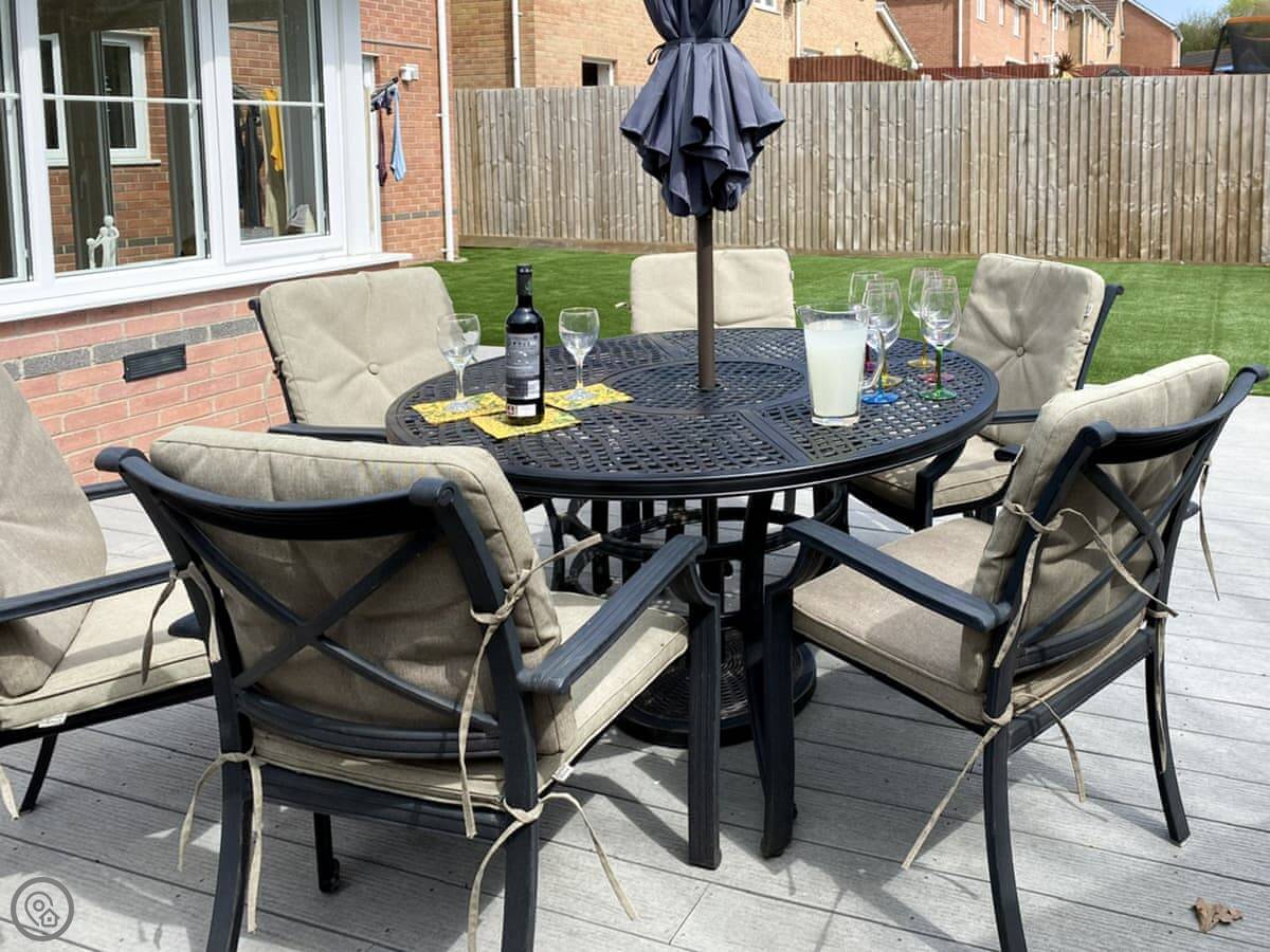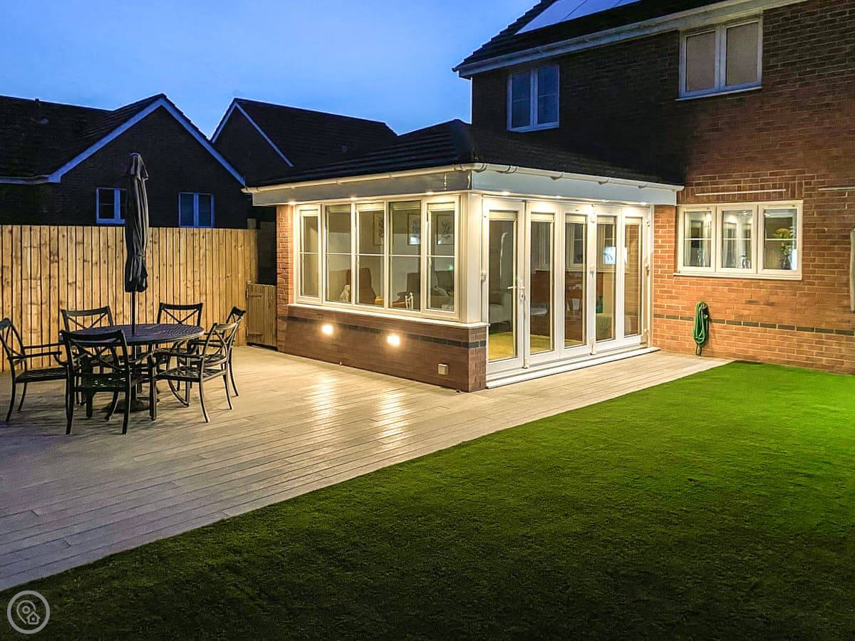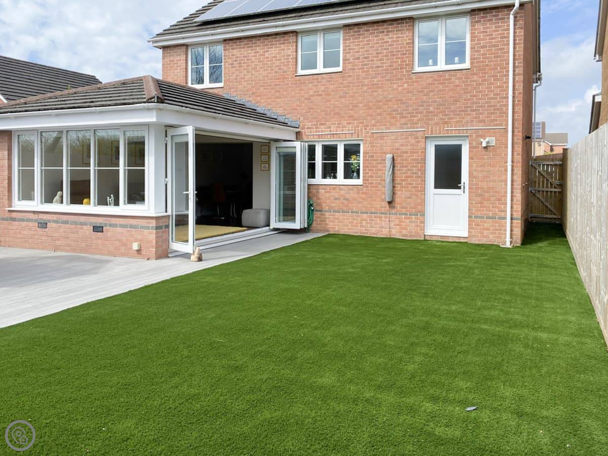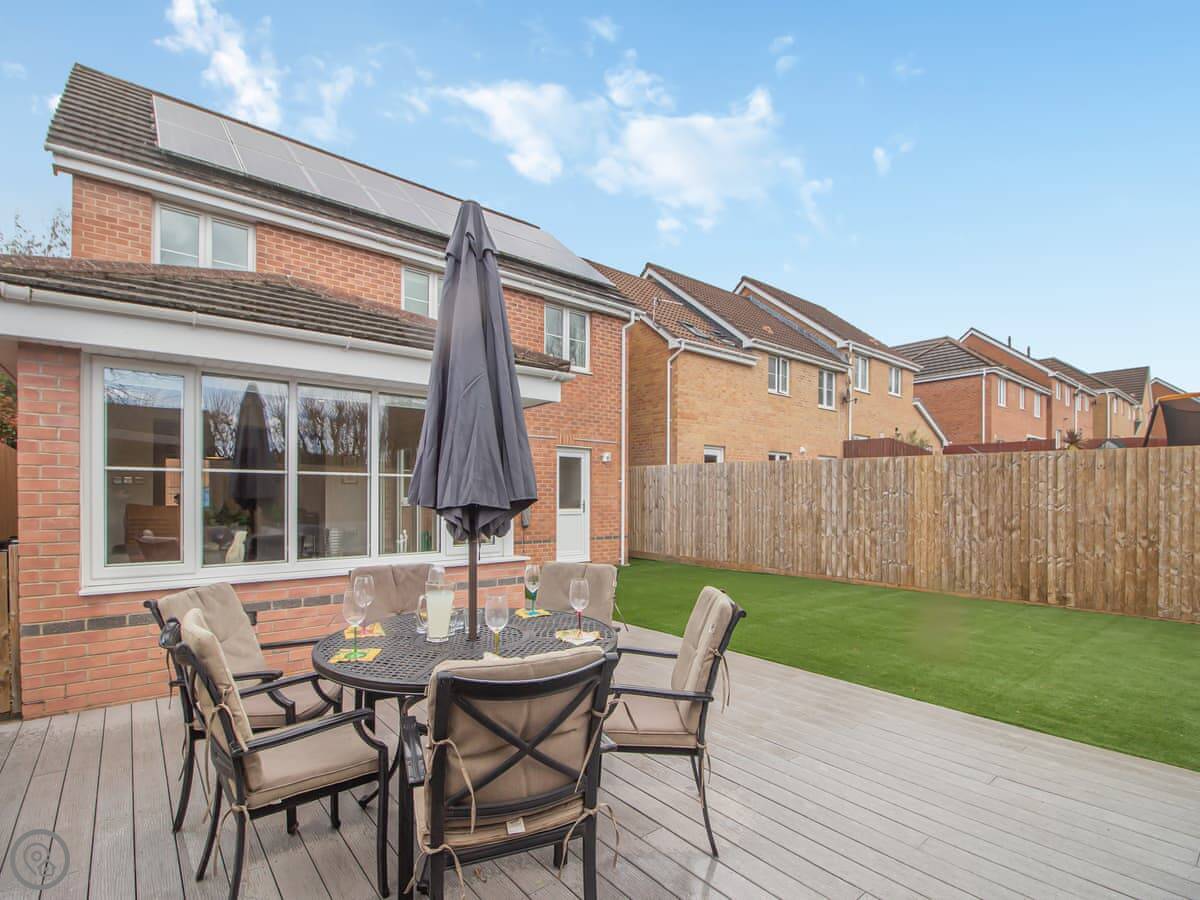 Chestnut House is in Bridgend, a town in South Wales. It's a modern, detached house, on a normal street. It sleeps eight, in four bedrooms. There are two bathrooms.