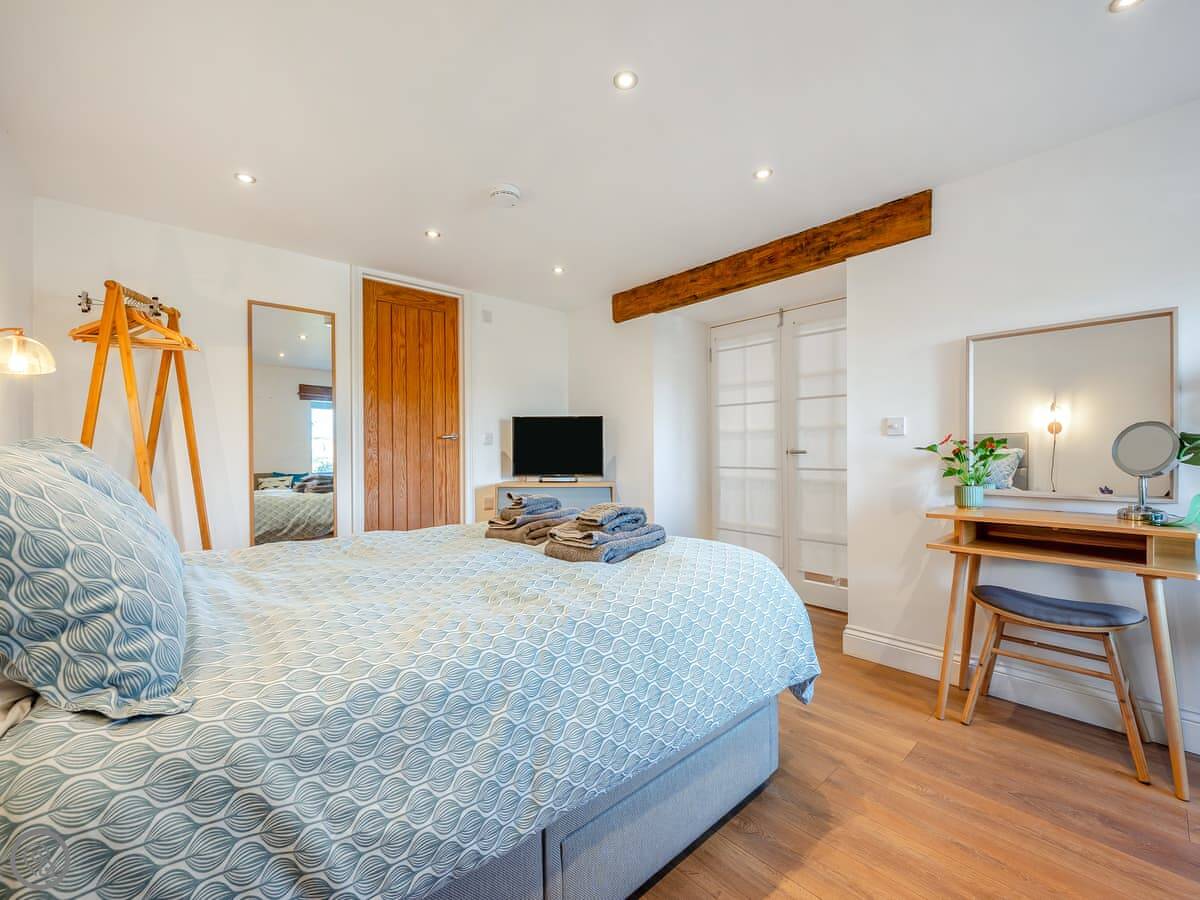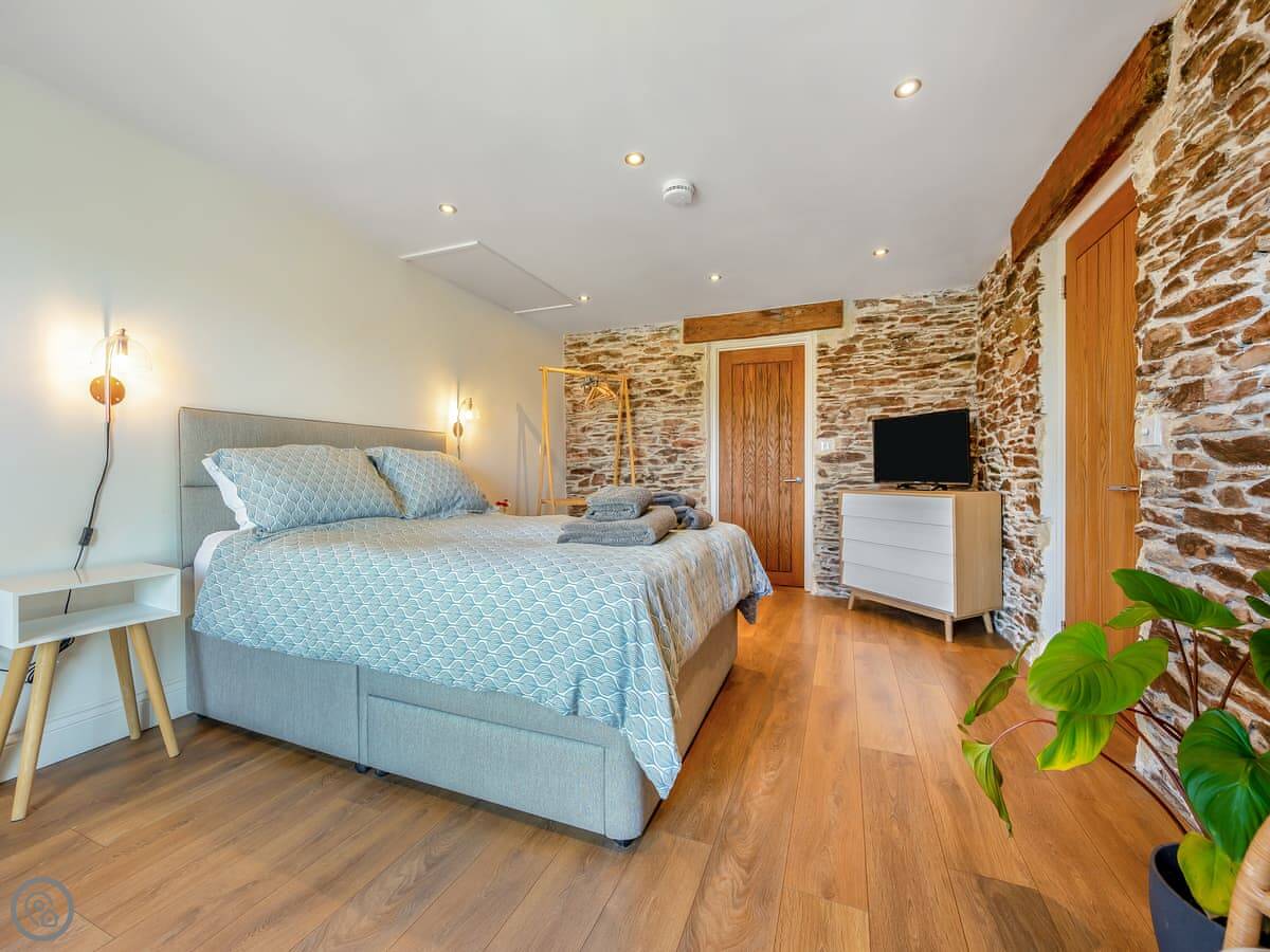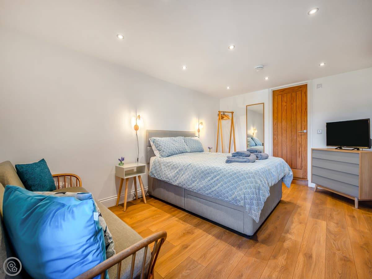 The layout is a bit different. The main living area is upstairs, because it gets the view over the farm. It's a good size room with a TV and a sofa. Downstairs is the kitchen-diner and one of the bedrooms with its own shower room. The other bedroom is upstairs too, also with a king bed and its own shower. That one has a Juliet balcony.