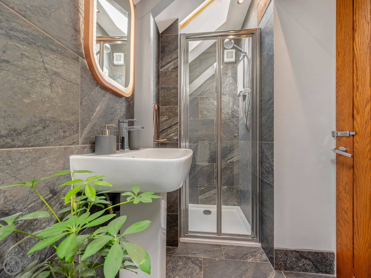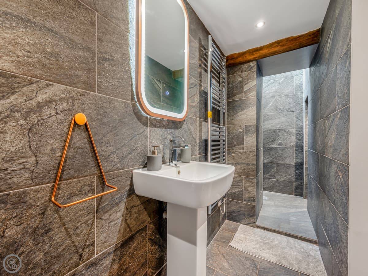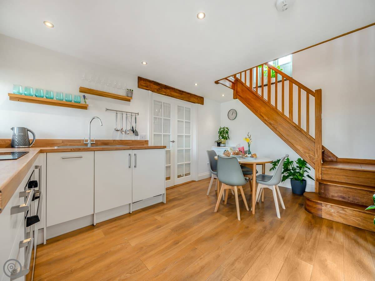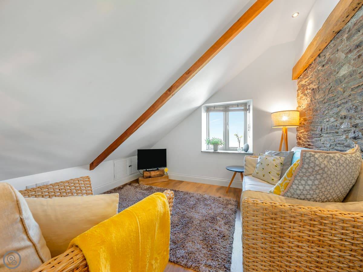 The layout is a bit different. The main living area is upstairs, because it gets the view over the farm. It's a good size room with a TV and a sofa. Downstairs is the kitchen-diner and one of the bedrooms with its own shower room. The other bedroom is upstairs too, also with a king bed and its own shower. That one has a Juliet balcony.