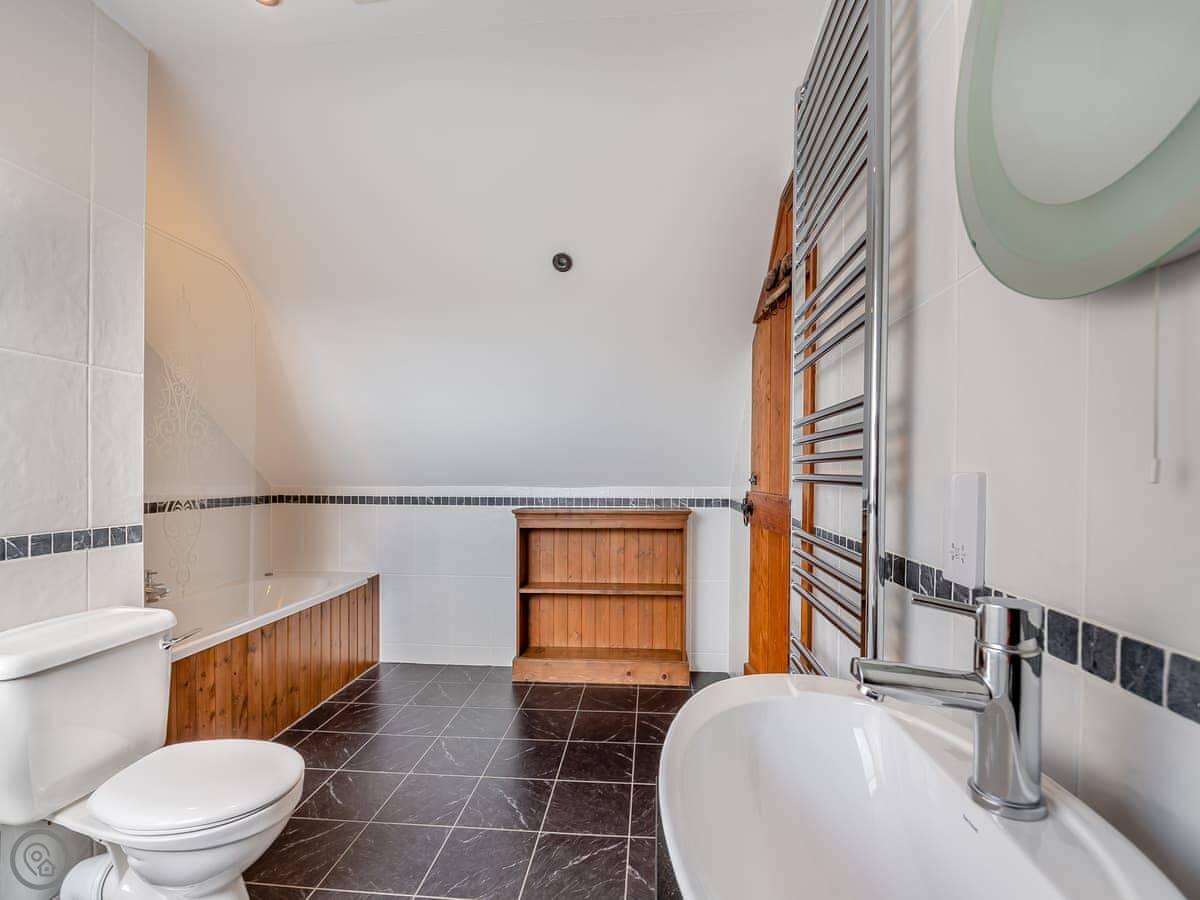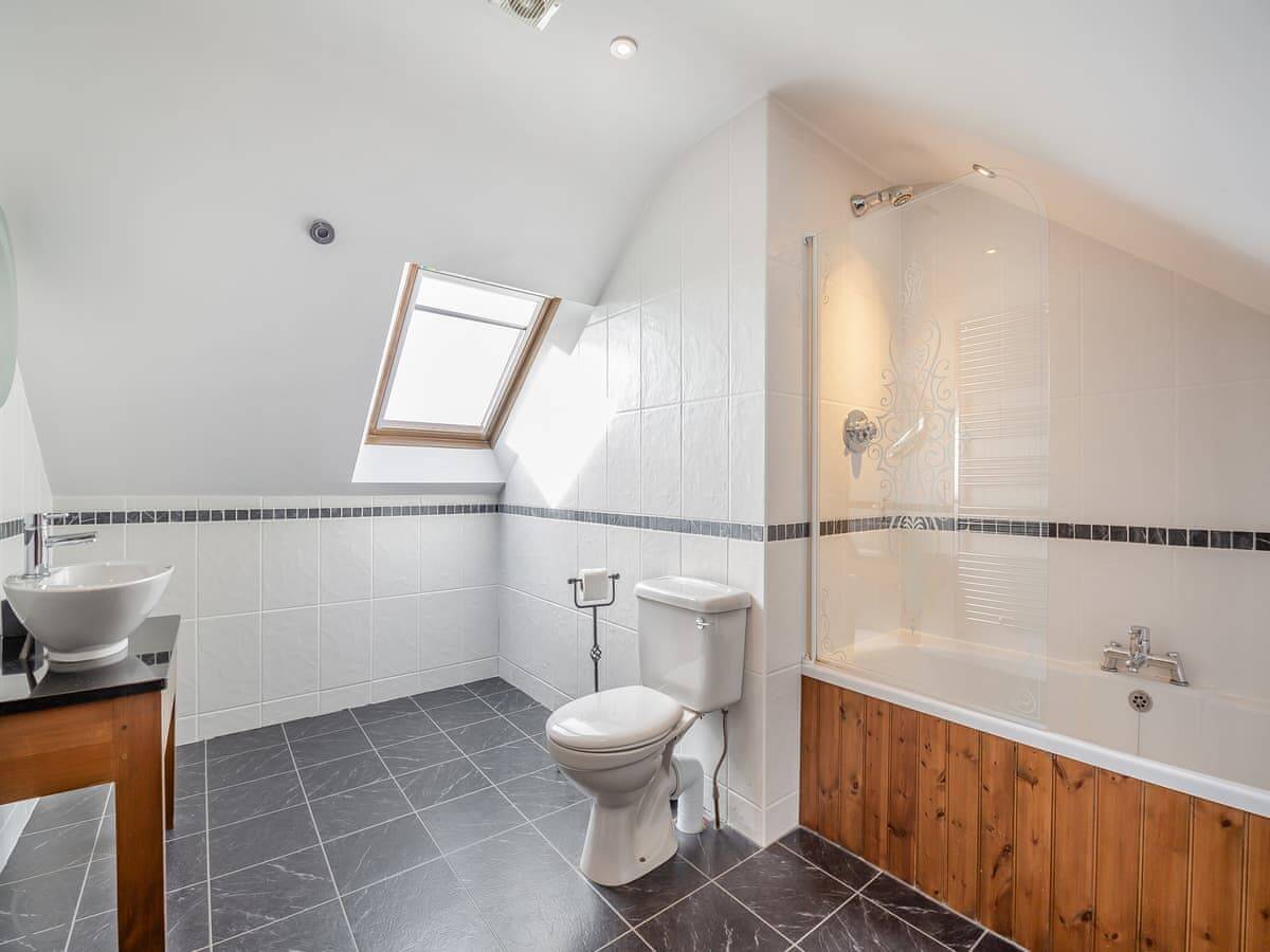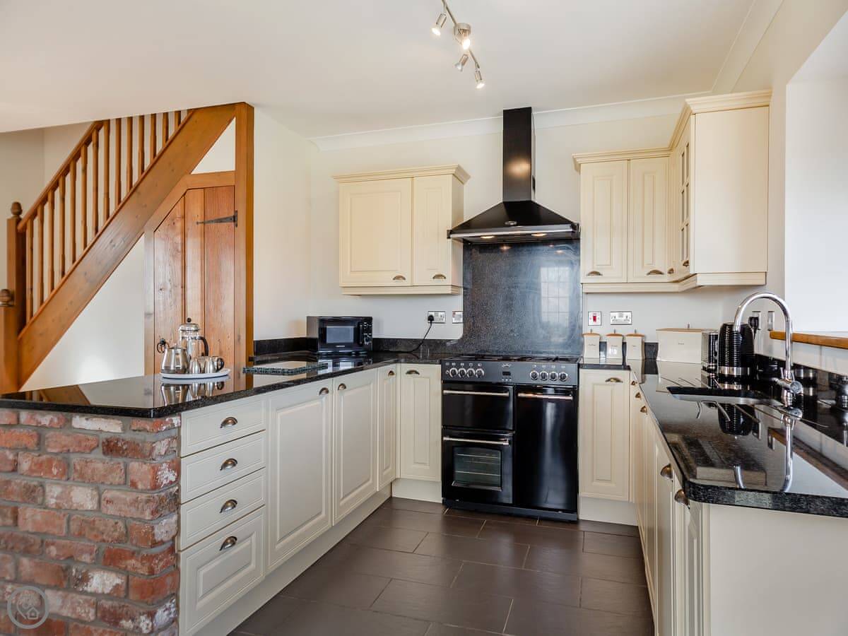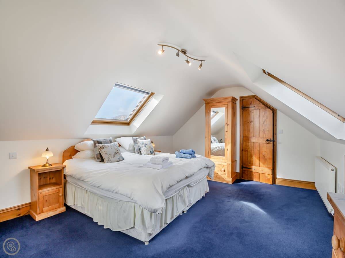 Inside, it's all one room downstairs: kitchen, sitting area, dining table. It's a modern space. The kitchen has a dishwasher and a washing machine. Upstairs is one bedroom with a very large bed. It can be two singles if you need it. The bathroom has a shower over the bath.