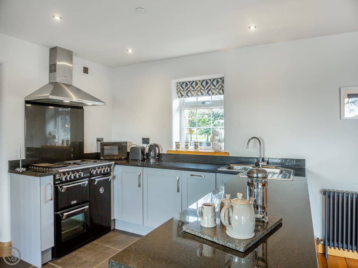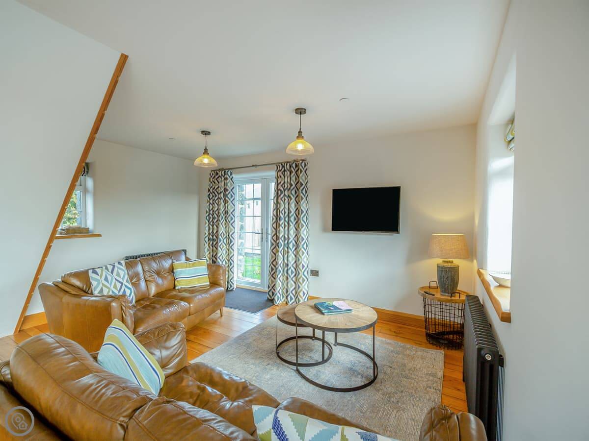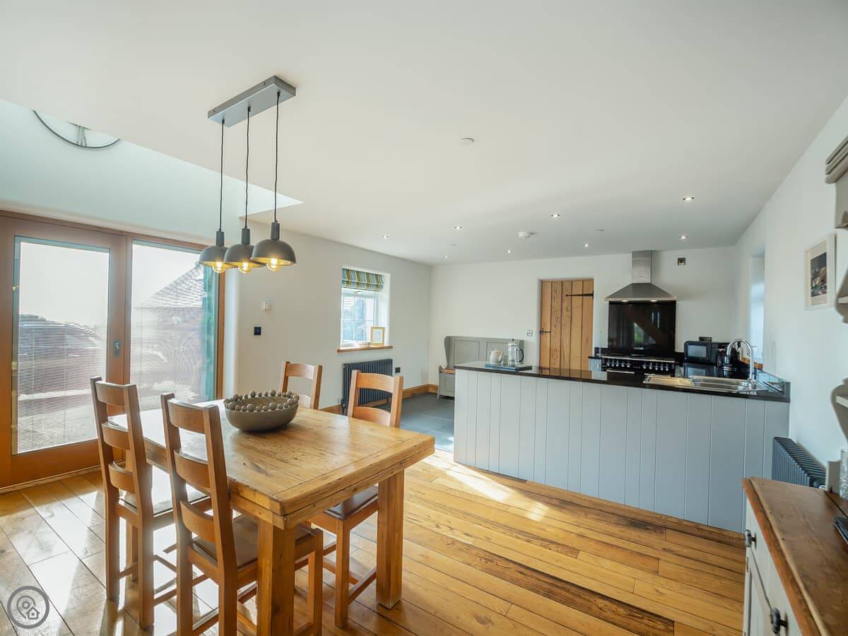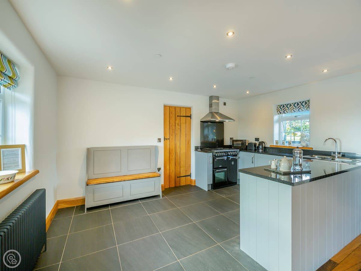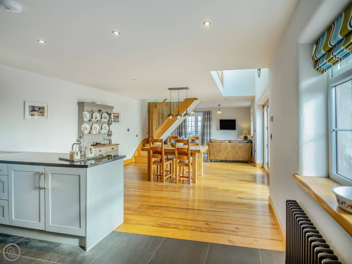 The main living space is open plan, with the kitchen, dining, and sitting area all together. Big windows. The view is the best thing. You look straight out over the fields to Cardigan Bay. On a clear day you can see all the way to the Llyn Peninsula.