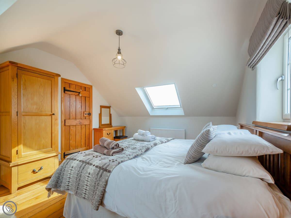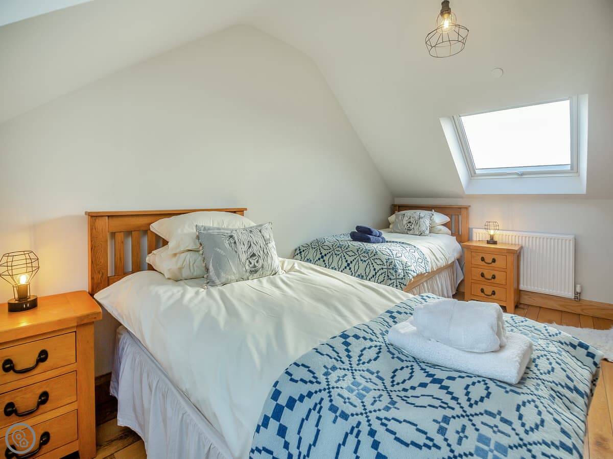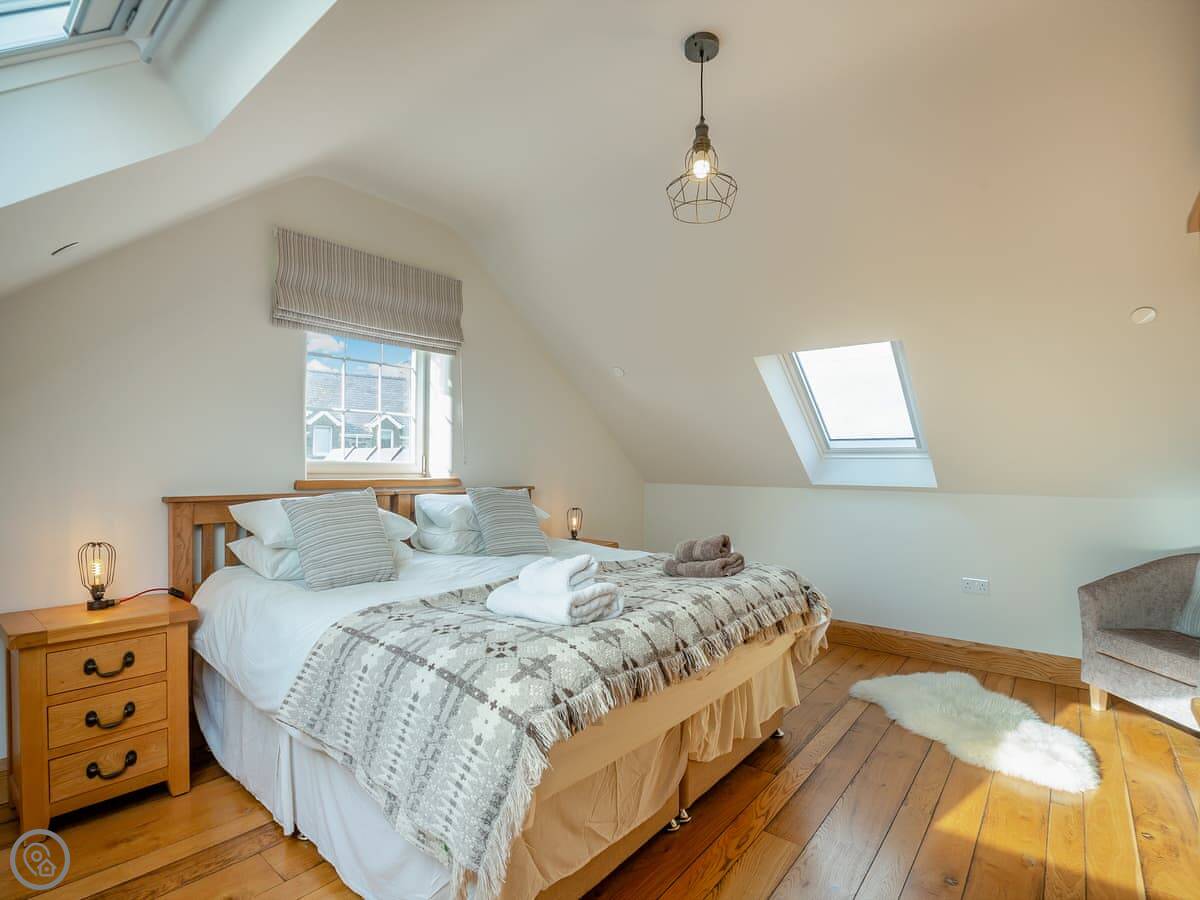 It sleeps four, two bedrooms and two bathrooms. Both bedrooms have big superking beds but we can split them into twins if you'd prefer. One bathroom is a wet room on the ground floor. It's got a 5 Star rating, which means it's kept to a high standard. There's parking right outside.