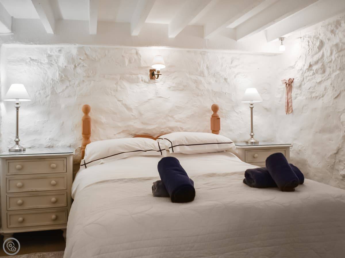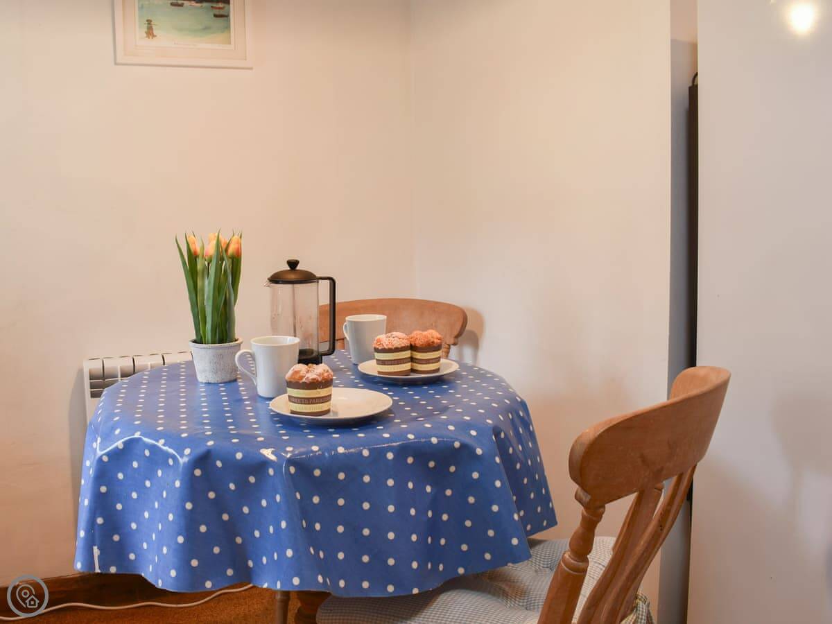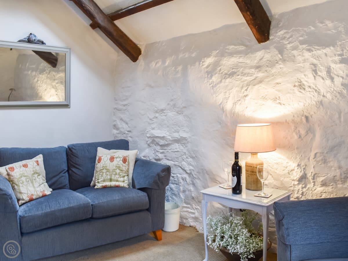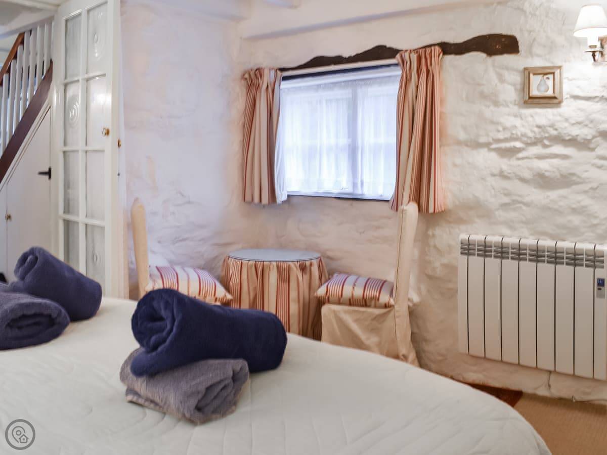 It sleeps two. One bedroom, one bathroom. It's got a 3 Star rating. It's clean and comfortable but not fancy. The cottage used to be a cider house. There's an old cider press in the garden and a bottle hidden in the lounge ceiling upstairs.