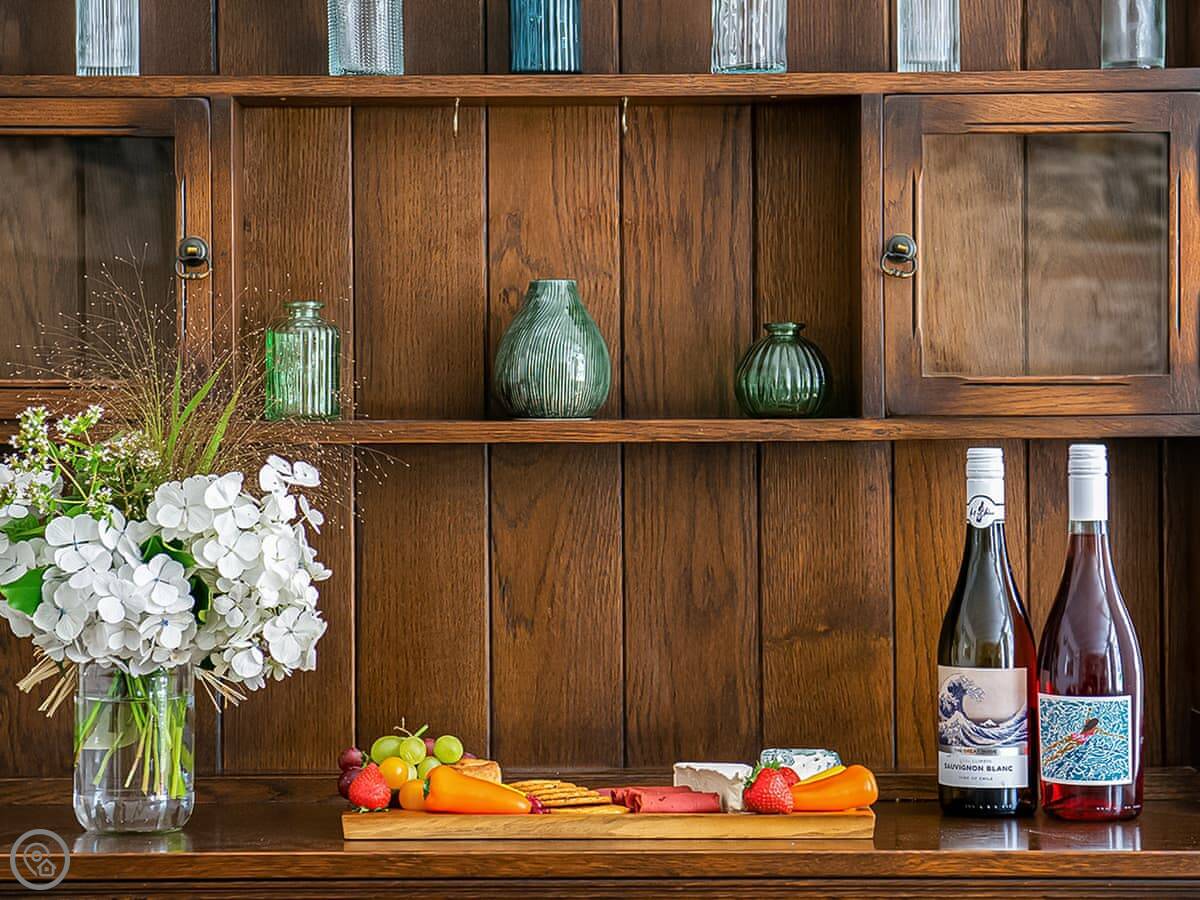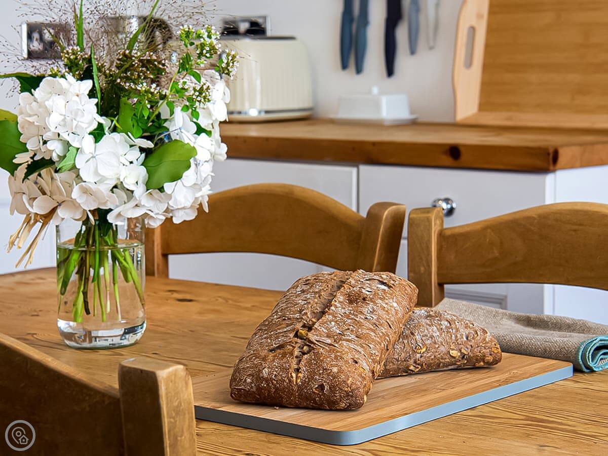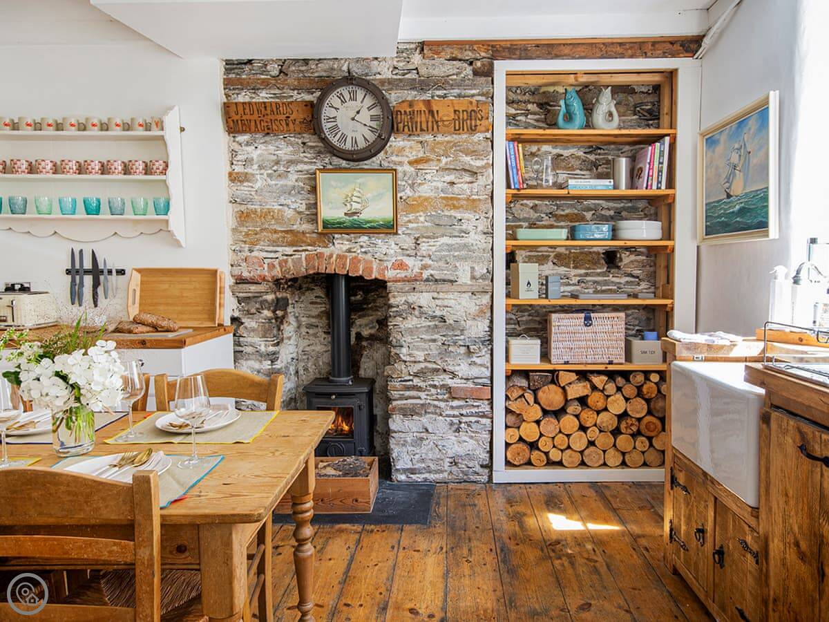 The front room is cosy. There's a wood burner for cooler evenings. The kitchen has a range cooker and a dishwasher. There's a small table with chairs for four. Bedding and towels are included.