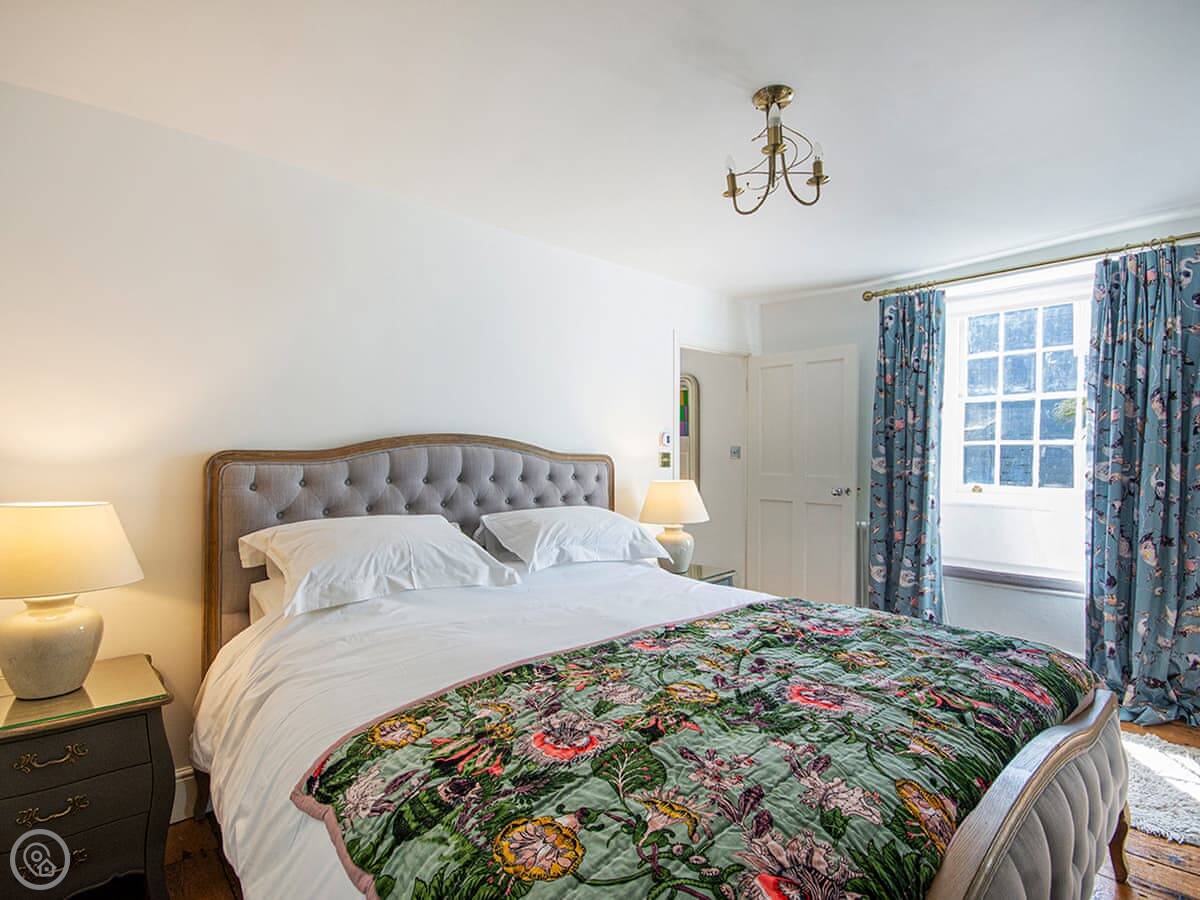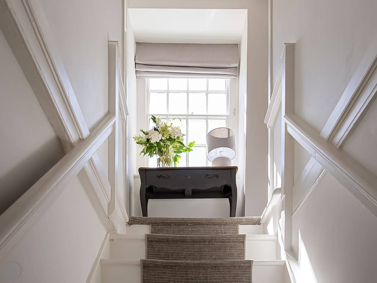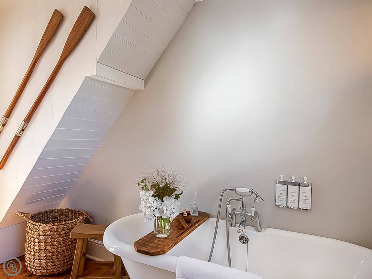 It sleeps four people in two bedrooms. They've both got super king-size beds. One has an en suite wet room. There's one other bathroom with a roll-top bath. The stairs are quite steep, which is normal for these old places.