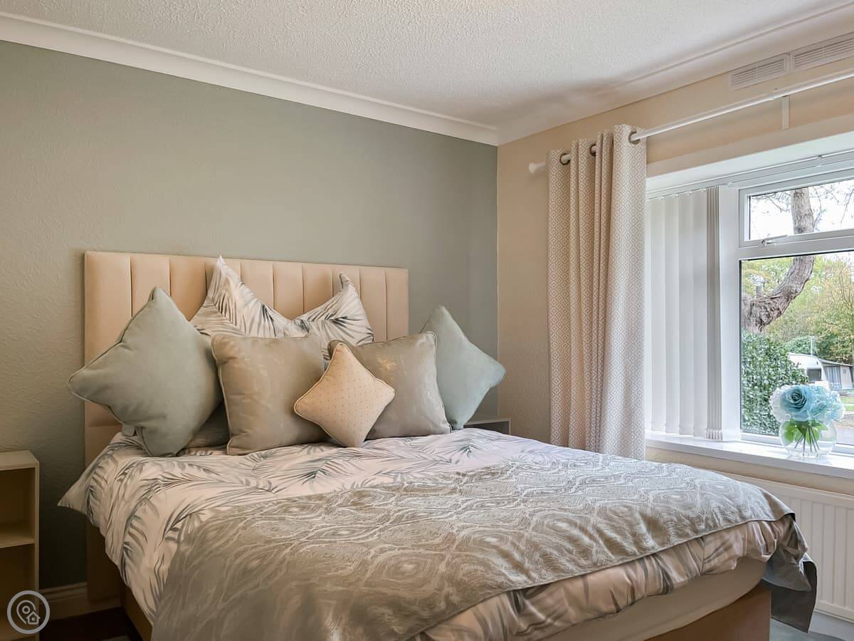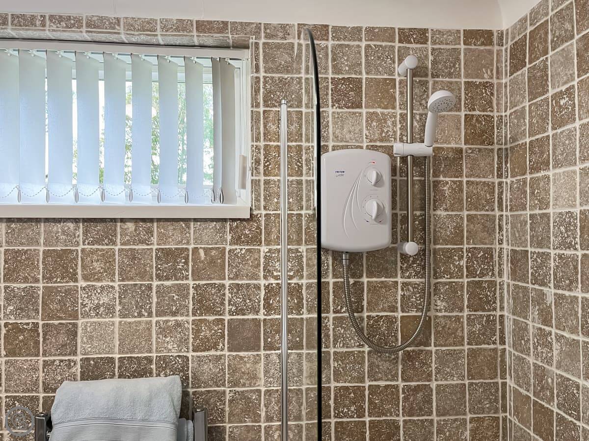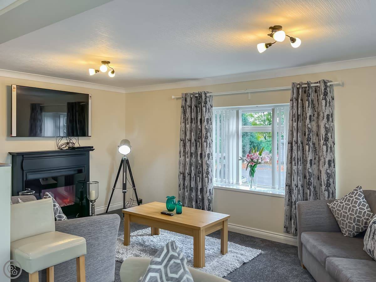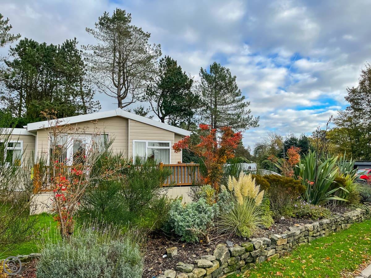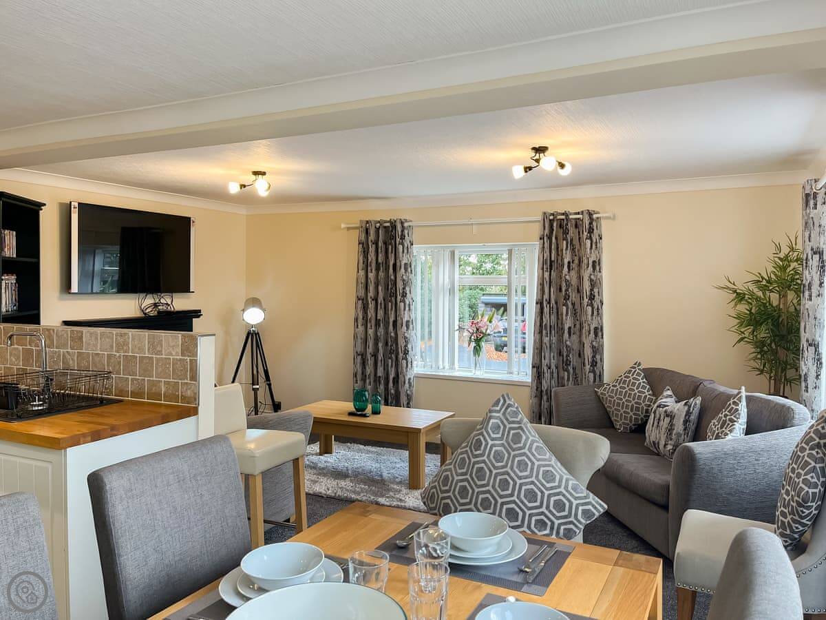 Pine Lodge is in Doe Hole, near Tansley. It's a bungalow-style lodge, all on one floor at the front, but it's built on a slope. The back has a lower ground floor with extra rooms. It sleeps a lot of people, up to eleven.